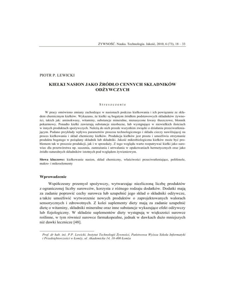 ŻYWNOŚĆ. Nauka. Technologia. Jakość, 2010, 6 (73), 18 – 33 PIOTR P. LEWICKI KIEŁKI NASION JAKO ŹRÓDŁO CENNYCH SKŁADNIKÓW ODŻYWCZYCH Streszczenie W pracy omówiono zmiany zachodzące w nasionach podczas kiełkowania i ich powiązanie ze składem chemicznym kiełków. Wykazano, że kiełki są bogatym źródłem podstawowych składników żywności, takich jak: aminokwasy, witaminy, substancje mineralne, nienasycone kwasy tłuszczowe, błonnik pokarmowy. Ponadto kiełki zawierają substancje nieobecne, lub występujące w niewielkich ilościach w innych produktach spożywczych. Należą do nich przede wszystkim związki o działaniu przeciwutleniającym. Podano przykłady wpływu parametrów procesu technologicznego i składu cieczy nawilżającej na proces kiełkowania i skład chemiczny kiełków. Produkcja kiełków jest prosta i umożliwia otrzymanie produktu bogatego w pożądany składnik lub składniki. Jakość mikrobiologiczna kiełków może być problemem tak w procesie produkcji, jak i w sprzedaży. Z tego względu warto rozpatrywać kiełki jako surowiec dla przetwórstwa np. suszenia, zamrażania i utrwalania w opakowaniach hermetycznych oraz jako źródło naturalnych składników istotnych pod względem żywieniowym. Słowa kluczowe: kiełkowanie nasion, skład chemiczny, właściwości przeciwutleniające, polifenole, makro- i mikroelementy Wprowadzenie Współczesny przemysł spożywczy, wytwarzając niezliczoną liczbę produktów z ograniczonej liczby surowców, korzysta z różnego rodzaju dodatków. Dodatki mają za zadanie poprawić cechy surowca lub uzupełnić jego skład o składniki odżywcze, a także umożliwić wytworzenie nowych produktów o zaprojektowanych walorach sensorycznych i zdrowotnych. Z kolei suplementy diety mają za zadanie uzupełnić dietę o witaminy, składniki mineralne oraz inne substancje wykazujące efekt odżywczy lub fizjologiczny. W składzie suplementów diety występują w większości surowce roślinne, w tym również surowce farmakopealne, jednak w dawkach dużo mniejszych niż dawki lecznicze [48]. Prof. dr hab. inż. P.P. Lewicki, Instytut Technologii Żywności, Państwowa Wyższa Szkoła Informatyki i Przedsiębiorczości w Łomży, ul. Akademicka 14, 18-400 Łomża KIEŁKI NASION JAKO ŹRÓDŁO CENNYCH SKŁADNIKÓW ODŻYWCZYCH 19 Zapotrzebowanie na dodatki do żywności jest bardzo duże, jednak istnieją określone ograniczenia związane z ich stosowaniem. Przede wszystkim jest to stosunek konsumentów do obecności dodatków w żywności. W wyniku oczekiwań konsumentów, a także dbałości o bezpieczeństwo i gwarantowaną jakość żywności poszukuje się nowych metod produkcji i nowych źródeł substancji istotnych z żywieniowego punktu widzenia. Wśród potencjalnych naturalnych źródeł substancji, którymi można uzupełniać żywność i podnosić jej funkcjonalność znajdują się skiełkowane nasiona wielu roślin. Wynika to z faktu, że są one bogatym źródłem witamin, soli mineralnych, a także przeciwutleniaczy, a ich produkcja jest stosunkowo łatwa. Ponadto, kiełkujące nasiona charakteryzują się intensywnym metabolizmem, który może być modyfikowany w kierunku produkcji określonych składników czy związków. Kiełkowanie nasion Faza kiełkowania w życiu rośliny jest najbardziej intensywnym okresem, w którym substancje zapasowe są rozkładane na łatwo przyswajalne związki proste. Uaktywniają się enzymy i syntetyzowane są witaminy [25]. Skrobia, białka i tłuszcze rozkładane są na związki stanowiące źródło energii i substratów dla nowo syntetyzowanych substancji. Kiełki wykazują bardzo dużą aktywność enzymatyczną. Aktywne są enzymy amylolityczne, proteolityczne, lipolityczne i inne, a ich ilość jest od 10 do 100 razy większa niż w dorosłych roślinach [10, 37]. Enzymy uruchamiają trzy grupy procesów: – rozpad substancji zapasowych najpierw w zarodku, a następnie, po przebiciu okrywy przez korzeń zarodkowy, w bielmie i przetransportowanie produktów hydrolizy do organów zarodka, – procesy oddechowe służące jako źródło energii dla rosnącego zarodka, – synteza związków wielkocząsteczkowych w rosnących częściach zarodka. Substancje te muszą być najpierw przekształcone w niskocząsteczkowe produkty rozpuszczalne w wodzie, aby mógł nastąpić transport tych składników do zarodka. Zmiana substancji zapasowych na prostsze zachodzi przy udziale enzymów, które zostają wytworzone w czasie kiełkowania. W procesie kiełkowania zachodzą następujące przemiany: wzrost kiełków, tworzenie enzymów oraz przemiana materii [21]. Już w pierwszej fazie kiełkowania zaczynają działać enzymy ksylanaza i glukanaza rozszczepiające hemicelulozy (materiał konstrukcyjny ścian komórkowych) na cukry proste. Działanie tych enzymów powoduje rozluźnienie komórek bielma i warstwy aleuronowej ziarniaków, co otwiera innym enzymom drogę do wnętrza wszystkich komórek. W trakcie kiełkowania ziarniaków polisacharydy są rozkładane przez całą gamę enzymów do dwucukrów i cukrów prostych. Po ich przemianie są zużywanie 20 Piotr P. Lewicki przez kiełki jako źródło energii oraz do syntezy wielocukrów ściany komórkowej, lipidów strukturalnych, aminokwasów i białek oraz innych związków [37]. W momencie przebicia okrywy przez korzeń zarodkowy rozpoczyna się rozpad białek zapasowych bielma pod działaniem wielu grup enzymów proteolitycznych. Jednocześnie następuje synteza dwu- i trójpeptydów oraz nowych białek w zarodku. Według Kunze [21], podczas kiełkowania tworzenie enzymów stymulowane jest przez hormony znajdujące się w tarczce zarodkowej ziarna. Tworzone są enzymy β-glukanaza, potem -amylaza i proteazy. Te enzymy znajdują się w warstwie aleuronowej natomiast β-amylaza powstaje w bielmie. Lipazy uaktywniają się, gdy zawartość wody w ziarniakach przekroczy tzw. wartość krytyczną. Duży wpływ n