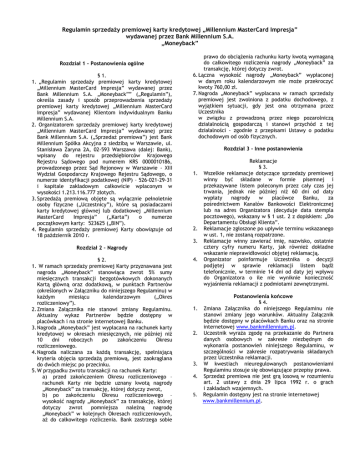 Regulamin sprzedaży premiowej karty kredytowej „Millennium MasterCard Impresja” wydawanej przez Bank Millennium S.A. „Moneyback” Rozdział 1 - Postanowienia ogólne § 1. 1. „Regulamin sprzedaży premiowej karty kredytowej „Millennium MasterCard Impresja” wydawanej przez Bank Millennium S.A. „Moneyback”” („Regulamin”), określa zasady i sposób przeprowadzenia sprzedaży premiowej karty kredytowej „Millennium MasterCard Impresja” wydawanej Klientom indywidualnym Banku Millennium S.A. 2. Organizatorem sprzedaży premiowej karty kredytowej „Millennium MasterCard Impresja” wydawanej przez Bank Millennium S.A. („Sprzedaż premiowa”) jest Bank Millennium Spółka Akcyjna z siedzibą w Warszawie, ul. Stanisława Żaryna 2A, 02-593 Warszawa (dalej: Bank), wpisany do rejestru przedsiębiorców Krajowego Rejestru Sądowego pod numerem KRS 0000010186, prowadzonego przez Sąd Rejonowy w Warszawie - XIII Wydział Gospodarczy Krajowego Rejestru Sądowego, o numerze identyfikacji podatkowej (NIP) – 526-021-29-31 i kapitale zakładowym całkowicie wpłaconym w wysokości 1.213.116.777 złotych. 3. Sprzedażą premiową objęte są wyłącznie pełnoletnie osoby fizyczne („Uczestnicy”), które są posiadaczami karty kredytowej głównej lub dodatkowej „Millennium MasterCard Impresja” („Karta”) o numerze początkowym karty: 523625 („BIN”). 4. Regulamin sprzedaży premiowej Karty obowiązuje od 18 październik 2010 r. prawo do obciążenia rachunku karty kwotą wymaganą do całkowitego rozliczenia nagrody „Moneyback” za transakcję, której dotyczy zwrot. 6. Łączna wysokość nagrody „Moneyback” wypłaconej w danym roku kalendarzowym nie może przekroczyć kwoty 760,00 zł. 7. Nagroda „Moneyback” wypłacana w ramach sprzedaży premiowej jest zwolniona z podatku dochodowego, z wyjątkiem sytuacji, gdy jest ona otrzymana przez Uczestnika w związku z prowadzoną przez niego pozarolniczą działalnością gospodarczą i stanowi przychód z tej działalności - zgodnie z przepisami Ustawy o podatku dochodowym od osób fizycznych. Rozdział 3 - Inne postanowienia 1. 2. 3. Rozdział 2 – Nagrody § 2. 1. W ramach sprzedaży premiowej Karty przyznawana jest nagroda „Moneyback” stanowiąca zwrot 5% sumy miesięcznych transakcji bezgotówkowych dokonanych Kartą główną oraz dodatkową, w punktach Partnerów (określonych w Załączniku do niniejszego Regulaminu) w każdym miesiącu kalendarzowym („Okres rozliczeniowy”). 2. Zmiana Załącznika nie stanowi zmiany Regulaminu. Aktualny wykaz Partnerów będzie dostępny w placówkach i na stronie internetowej Banku. 3. Nagroda „Moneyback” jest wypłacana na rachunek karty kredytowej w okresach miesięcznych, nie później niż 10 dni roboczych po zakończeniu Okresu rozliczeniowego. 4. Nagroda naliczana za każdą transakcję, spełniającą kryteria objęcia sprzedażą premiową, jest zaokrąglana do dwóch miejsc po przecinku. 5. W przypadku zwrotu transakcji na rachunek Karty: a) przed zakończeniem Okresu rozliczeniowego – rachunek Karty nie będzie uznany kwotą nagrody „Moneyback” za transakcję, której dotyczy zwrot, b) po zakończeniu Okresu rozliczeniowego – wysokość nagrody „Moneyback” za transakcję, której dotyczy zwrot pomniejsza należną nagrodę „Moneyback” w kolejnych Okresach rozliczeniowych, aż do całkowitego rozliczenia. Bank zastrzega sobie 4. 1. 2. 3. 4. 5. Reklamacje § 3. Wszelkie reklamacje dotyczące sprzedaży premiowej winny być składane w formie pisemnej i przekazywane listem poleconym przez cały czas jej trwania, jednak nie później niż 60 dni od daty wypłaty nagrody w placówce Banku, za pośrednictwem Kanałów Bankowości Elektronicznej lub na adres Organizatora (decyduje data stempla pocztowego), wskazany w § 1 ust. 2 z dopiskiem: „Do Departamentu Obsługi Klienta”. Reklamacje zgłoszone po upływie terminu wskazanego w ust. 1, nie zostaną rozpatrzone. Reklamacje winny zawierać imię, nazwisko, ostatnie cztery cyfry numeru Karty, jak również dokładne wskazanie nieprawidłowości objętej reklamacją. Organizator poinformuje Uczestnika o decyzji podjętej w sprawie reklamacji listem bądź telefonicznie, w terminie 14 dni od daty jej wpływu do Organizatora o ile nie wyniknie konieczność wyjaśnienia reklamacji z podmiotami zewnętrznymi. Postanowienia końcowe § 4. Zmiana Załącznika do niniejszego Regulaminu nie stanowi zmiany jego warunków. Aktualny Załącznik będzie dostępny w placówkach Banku oraz na stronie internetowej www.bankmillennium.pl. Uczestnik wyraża zgodę na przekazanie do Partnera danych osobowych w zakresie niezbędnym do wykonania postanowień niniejszego Regulaminu, w szczególności w zakresie rozpatrywania składanych przez Uczestnika reklamacji. W kwestiach nieuregulowanych postanowieniami Regulaminu stosuje się obowiązujące przepisy prawa. Sprzedaż premiowa nie jest grą losową w rozumieniu art. 2 ustawy z dnia 29 lipca 1992 r. o grach i zakładach wzajemnych. Regulamin dostępny jest na stronie internetowej www.bankmillennium.pl. Załącznik nr 1 do Regulaminu Sprzedaży Premiowej Kart Kredytowych „Millennium MasterCard Impresja” wydawanych przez Bank Millennium SA – „Moneyback” Wykaz Partnerów* objętych zwrotem z tytułu „Moneyback” w ramach Sprzedaży Premiowej kart kredytowych obowiązujący od 25 sierpnia 2014r. Nazwa Partnera DEICHMANN-OBUWIE BALDININI COCCINELLE FRANCESCO BIASIA MARELLA MAXMARA PENNYBLACK POLLINI VENEZIA SEPHORA SMYK EMPIK APART BERSHKA MASSIMO DUTTI OYSHO PULL&BEAR STRADIVARIUS ZARA ZARA HOME PIOTR I PAWEŁ SONY CENTRE TRAVELPLANET.PL * dotyczy punktów sprzedaży wyłącznie na terytorium RP Uwagi Nie obowiązuje dla Max Mara Weekend Nie dotyczy zakupów na www.smyk.com Nie dotyczy zakupów na empik.com, empiktravel.pl, w Empik school oraz Empik cafe. - Nie dotyczy zakupów w sklepach internetowych „Moneyback” obejmuje zakupy w 