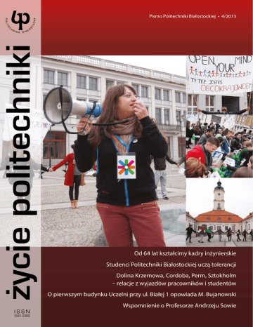 życie politechniki Pismo Politechniki Białostockiej • 4/2013 ISSN 1641-3369 Od 64 lat kształcimy kadry inżynierskie Studenci Politechniki Białostockiej uczą tolerancji Dolina Krzemowa, Cordoba, Perm, Sztokholm – relacje z wyjazdów pracowników i studentów O pierwszym budynku Uczelni przy ul. Białej 1 opowiada M. Bujanowski Wspomnienie o Profesorze Andrzeju Sowie Politechnika Białostocka w obiektywie INAUGURACJA ROKU AKADEMICKIEGO 2013/2014 fot. Studencka Agencja Fotograficzna PB W n u m e r z e : aktualności Gaudeamus Igitur na Politechnice Białostockiej . ..............................................................................................................4 Podsumowanie rekrutacji na studia .......................................................................................................................................5 Sprawozdanie z wyjazdu do USA w listopadzie 2013 r.....................................................................................................6 Uniwersytet z miasta fiordów i trolli. Sprawozdanie z wyjazdu do University of Bergen . ..................................9 Obcokrajowcy uczyli się języka polskiego na Politechnice Białostockiej................................................................ 10 w skrócie... ..................................................................................................................................................................................... 11 Wyróżnienie dla PB na targach Technicon Innowacje . ................................................................................................. 12 O europejskiej polityce energetycznej na Politechnice Białostockiej ..................................................................... 12 Sekretarz stanu USA sterował łazikiem Hyperion . ......................................................................................................... 14 Ambasador USA na PB . ............................................................................................................................................................ 14 Powołanie IEEE Poland Section Technology Management Council Chapter . ...................................................... 15 Pierwsze Posiedzenie Konwentu Politechniki Białostockiej . ...................................................................................... 15 Początkujący i doświadczeni – o dwóch konkursach budowlanych......................................................................... 16 Doktorant Wydziału Elektrycznego PB wyróżniony na Międzynarodowych Warsztatach Doktoranckich OWD 2013 .............................................................................. 18 Od 64 lat kształcimy kadry inżynierskie ............................................................................................................................. 19 nauka Architektura krajobrazu w Białymstoku ............................................................................................................................. 23 Jak motywować studentów do uprawiania sportu? . .................................................................................................... 25 III Problemowa Konferencja Geotechniki „Współpraca budowli z podłożem gruntowym” Białystok 2013 jako konferencja interdyscyplinarna ..................................................................................................... 26 II Ogólnopolska Konferencja Naukowa ,,Różnorodność biologiczna – od komórki do ekosystemu. Rośliny i grzyby w zmieniających się warunkach środowiska’’ . ................................................................................. 29 Po doświadczenia do Berkeley .............................................................................................................................................. 30 dr inż. Wiesław Urban otrzymał międzynarodową nagrodę Outstanding Reviewer Awards 2013 .............. 31 Pobyt pracowników Wydziału Budownictwa i Inżynierii Środowiska na Uniwersytecie w Cordobie ......... 32 Konferencja WYPADEK TO NIE PRZYPADEK ....................................................................................................................... 33 Wizyta studyjna w Królewskim Instytucie Technologicznym, Szwecja . ................................................................. 34 mieszanka studencka Wycieczka na budowę linii elektroenergetycznej 400 kV . .......................................................................................... 35 Summer Academy 2013 w Białowieży ................................................................................................................................ 36 Absolwent PB laureatem konkursu Architektura Betonowa 2013 . .......................................................................... 37 Studenci z Politechniki Białostockiej kreują światłem .................................................................................................. 38 LEGO Akademia na Politechnice Białostockiej ................................................................................................................ 38 Wideo mapping o Sybirakach................................................................................................................................................. 39 Miasto, którego nie znamy ...................................................................................................................................................... 40 Nagrody za prace dyplomowe studentów Wydziału Architektury . ......................................................................... 40 Studenci Zamiejscowego Wydziału Leśnego z wizytą w Permie .............................................................................. 41 Studenci inżynierii środowiska z wizytą w Moskwie...........................................................................................