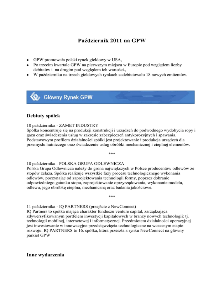 Październik 2011 na GPW GPW promowała polski rynek giełdowy w USA, Po trzecim kwartale GPW na pierwszym miejscu w Europie pod względem liczby debiutów i na drugim pod względem ich wartości., W październiku na trzech giełdowych rynkach zadebiutowało 18 nowych emitentów. Debiuty spółek 10 października - ZAMET INDUSTRY Spółka koncentruje się na produkcji konstrukcji i urządzeń do podwodnego wydobycia ropy i gazu oraz świadczenia usług w zakresie zabezpieczeń antykorozyjnych i spawania. Podstawowym profilem działalności spółki jest projektowanie i produkcja urządzeń dla przemysłu hutniczego oraz świadczenie usług obróbki mechanicznej i cieplnej elementów. *** 10 października - POLSKA GRUPA ODLEWNICZA Polska Grupa Odlewnicza należy do grona największych w Polsce producentów odlewów ze stopów żelaza. Spółka realizuje wszystkie fazy procesu technologicznego wykonania odlewów, poczynając od zaprojektowania technologii formy, poprzez dobranie odpowiedniego gatunku stopu, zaprojektowanie oprzyrządowania, wykonanie modelu, odlewu, jego obróbkę cieplna, mechaniczną oraz badania jakościowe. *** 11 października - IQ PARTNERS (przejście z NewConnect) IQ Partners to spółka mająca charakter funduszu venture capital, zarządzająca zdywersyfikowanym portfelem inwestycji kapitałowych w branży nowych technologii: tj. technologii mobilnej, internetowej i informatycznej. Przedmiotem działalności operacyjnej jest inwestowanie w innowacyjne przedsięwzięcia technologiczne na wczesnym etapie rozwoju. IQ PARTNERS to 16. spółka, która przeszła z rynku NewConnect na główny parkiet GPW Inne wydarzenia 3 października Giełda Papierów Wartościowych w Warszawie we współpracy z NBS Communications i FD zoorganizowała seminarium poświęcone relacjom inwestorskim, skierowane do przedstawicieli spółek notowanych na Głównym Rynku GPW. Seminarium miało na celu omówienie najważniejszych kwestii związanych z kształtowaniem relacji inwestorskich w spółkach i ich wykorzystaniem do budowania zaufania i mocnej pozycji firmy na rynku krajowym i międzynarodowym. Uczestnikami seminarium byli przedstawiciele spółek notowanych na Głównym Rynku GPW. *** 3 października Giełda Papierów Wartościowych w Warszawie zakończyła z sukcesem projekt budowy i uruchomienia nowej sieci dostępowej WAN opartej na technologii MPLS. Od tego dnia wszyscy klienci GPW korzystają już z nowego rozwiązania, które pozwala na poprawę wydajności oraz jakości połączenia domów maklerskich, dystrybutorów informacji oraz innych instytucji współpracujących z systemem transakcyjnym. Projekt nowej sieci WAN objął również swoim zakresem dystrybucję danych giełdowych. Pozwoliło to na zwiększenie szybkości przekazywania informacji rynkowych klientom Giełdy oraz zastąpienie dotychczasowej komunikacji drogą satelitarną (VSAT). *** W dniach 13-14 października w Nowym Yorku odbyła się konferencja „The 2011 Polish Equities Conference with the Warsaw Stock Exchange”. Celem wydarzenia była promocja polskiego rynku kapitałowego oraz polskich spółek giełdowych wśród amerykańskich inwestorów. W trakcie dwudniowego wydarzenia, w którym wzięli udział przedstawiciele kilkudziesięciu międzynarodowych funduszy inwestycyjnych, emerytalnych i hedgingowych, GPW zaprezentowała ofertę dla emitentów i inwestorów oraz potencjał i perspektywy polskiego rynku kapitałowego. Podczas konferencji odbyło się ponad 100 indywidualnych spotkań inwestorów z przedstawicielami 12 spółek notowanych na warszawskim parkiecie. *** 19 października Giełda Papierów Wartościowych w Warszawie i Stowarzyszenie Inwestorów Indywidualnych zorganizowały seminarium "Informacja cenotwórcza - czyli o czym spółki powinny informować rynek". Głównym tematem spotkania była odpowiedź na pytanie jakie zdarzenia i w jakim momencie powinny być raportowane w świetle wymogów ustawowych i rozporządzenia o obowiązkach informacyjnych. *** Według najnowszego raportu IPO Watch Europe opublikowanego przez PricewaterhouseCoopers po trzecim kwartale 2011 r. GPW utrzymuje się na pierwszym miejscu w Europie pod względem liczby debiutów oraz awansuje na drugie miejsce pod względem ich wartości. Warszawska Giełda była pierwszym rynkiem w Europie pod względem liczby debiutów zarówno w pierwszym, drugim jak i trzecim kwartale 2011 roku (łącznie na regulowanym oraz alternatywnym rynku akcji). Na giełdowych rynkach akcji zadebiutowało łącznie 61 spółek, w tym na Głównym Rynku GPW 7 i na NewConnect 54. To najlepszy kwartalny wynik w historii warszawskiej giełdy. Pod względem wartości ofert w trzecim kwartale 2011 r. warszawska giełda była na drugim miejscu w Europie. Wyprzedziła nas jedynie hiszpańska giełda (BME), natomiast po raz pierwszy GPW pobiła wynik Grupy London Stock Exchange oraz Deutsche Börse, które w znacznie silniejszym stopniu odczuły kryzys finansowy. *** 19 października odbyło się posiedzenie Rady Giełdy. Rada Giełdy uchwaliła jednolity tekst Statutu Spółki, wyraziła zgodę na nabycie akcji Towarowej Giełdy Energii S.A. oraz uchwaliła zmiany w „Dobrych Praktykach Spółek Notowanych na GPW”. *** 20 października Zarząd Giełdy zmienił standard kontraktów terminowych na akcje w zakresie formuły wyliczania ostatecznego kursu rozliczeniowego (Uchwała Nr 1315/2011 z dnia 20 października 2011 r.) . Wg nowych zasad kurs ten określany będzie na poziomie kursu ostatniej transakcji akcjami będącymi instrumentem bazowym, zawartej na sesji giełdowej w dniu wygaśnięcia danych kontraktów terminowych. Pierwszą serią kontraktów, dla których ostateczny kurs rozliczeniowy zostanie wyznaczony wg nowych zasad będzie seria wygasająca w dniu 16 marca 2012 r. Najważniejsze dane statystyczne Zmiany procentowe indeksów w październiku WIG20 8,4% MWIG40 6,8% SWIG80 4,1% WIG 7,6% WIG-Poland 7,6% Od początku roku -13,6% 