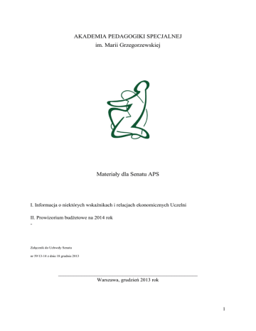 AKADEMIA PEDAGOGIKI SPECJALNEJ im. Marii Grzegorzewskiej Materiały dla Senatu APS I. Informacja o niektórych wskaźnikach i relacjach ekonomicznych Uczelni II. Prowizorium budżetowe na 2014 rok - Załącznik do Uchwały Senatu nr 59/13-14 z dnia 18 grudnia 2013 ______________________________________________________ Warszawa, grudzień 2013 rok 1 I Informacja o niektórych wskaźnikach i relacjach ekonomicznych działalności Uczelni CZĘŚĆ I: ZAŁOŻENIA DO PLANU PRZYCHODÓW I WYDATKÓW rodzaj i czas trwania stud. 1. Dane w zakresie liczby studentów L.p. 1 2 studia niestacjonarne, z tego: 1) pedagogika, 2) pedagogika specjalna, II II.1 II.2 studia finansowane z EFS, 3) edukacja artystyczna w zakresie sztuk plastycznych WYDZIAŁ STOSOWANYCH NAUK SPOŁECZNYCH w tym: studia stacjonarne, z tego: 1) praca socjalna 2) socjologia 3) psychologia studia niestacjonarne, z tego: 1) praca socjalna 1.a.) studia finansowane z EFS, 2) socjologia 3) psychologia 6 6/4 7 8 % 8/6 8/4 9 10 8 268 101,2 101,8 7 026 6 746 96,0 6 752 100,1 7 268 107,6 107,7 3 694 3 561 96,4 3 745 105,2 4 138 110,5 116,2 3 332 3 185 95,6 3 007 94,4 3 130 104,1 98,3 2 932 2 901 98,9 2 950 101,7 3 130 106,1 107,9 400 284 71,0 57 20,1 0 0,0 0,0 5 484 5 123 93,4 5 170 100,9 5 512 106,6 107,6 L-3 M-2 L-3 M-2 2 635 738 241 1 142 369 2 493 714 251 1 007 388 94,6 96,7 104,1 88,2 105,1 2 713 813 342 1 014 403 108,8 113,9 136,3 100,7 103,9 3 026 911 407 1 095 460 111,5 112,1 119,0 108,0 114,1 121,4 127,6 162,2 108,7 118,6 L-3 88 80 90,9 89 111,3 93 104,5 116,3 M-2 L-3 57 2 849 439 53 2 630 488 x 92,3 111,2 52 2 457 415 98,1 93,4 85,0 60 2 486 558 115,4 101,2 134,5 x 94,5 114,3 M-2 L-3 M-2 M-2 711 534 821 344 628 466 822 226 88,3 87,3 100,1 65,7 713 516 813 0 113,5 110,7 98,9 x 738 420 770 0 103,5 81,4 94,7 x 117,5 90,1 93,7 x b) finansowani z EFS I.2 5 stan na 30.11. 100,6 a) bez finansowania z EFS 3) edukacja artystyczna w zakresie sztuk plastycznych 4/3 Plan 2014 % 8 166 - studenci niestacjonarni (I.2 + II.2), w tym: 2) pedagogika specjalna 4 stan na 30.11. 105,0 - studenci stacjonarni (I.1 + II.1) I.1 3 2013 % 8 118 Studenci ogółem (I + II)*, w tym: WYDZIAŁ NAUK PEDAGOGICZNYCH w tym: studia stacjonarne, z tego: 1) pedagogika 2012 stan na 30.11. 7 734 Studenci i słuchacze łącznie (I + II + III) I 2011 stan na 30.11. L-3 L-3 L-3 M-2 M-5 L-3 L-3 L-3 M-2 M-5 0 0 1542 1 623 105,3 1 582 97,5 1 756 111,0 108,2 1059 247 233 105 474 483 61 56 67 79 220 1068 218 198 107 545 555 65 58 52 83 297 100,8 88,3 85,0 101,9 115,0 114,9 106,6 103,6 77,6 105,1 135,0 1032 209 194 97 532 550 86 57 25 31 351 96,6 95,9 98,0 90,7 97,6 99,1 106,6 98,3 48,1 37,3 118,2 1 112 231 226 116 539 644 132 0 74 60 378 107,8 110,5 116,5 119,6 101,3 117,1 153,5 0,0 296,0 193,5 107,7 104,1 106,0 114,1 108,4 98,9 116,0 203,1 0,0 142,3 x 127,3 2 III Studia podyplomowe/** w tym: III.1 -studia odpłatne 708 1 372 193,8 1 414 103,1 1 000 70,7 73 1 221 1 372 112,4 1 414 103,1 1 000 70,7 72,9 x x x x x x III.2 studia finansowane z EFS i FSS 205 Rodzaje i czas trwania studiów M-5 - studia magisterskie 5-letnie M-2 studia magisterskie uzupełniające 2-letnie L-3 studia licencjackie 3 -letnie *Opracowano na podstawie danych do sprawozdania S-10 z uwzględnieniem cudzoziemców, z wyłączeniem osób po ostatnim roku bez egz. ** Opracowano na podstawie wstępnych danych do sprawozdania S-12 . rodzaj i czas trwania stud. 1.a. studenci studiów stacjonarnych III stopnia (doktoranckich) L.p. 1 I I.1 2011 stan na 30.11. stan na 30.11. 3 4 2 WYDZIAŁ NAUK PEDAGOGICZNYCH w tym: studia stacjonarne III stopnia (doktoranckie) 2012 D-4 89 2013 % 4/3 stan na 30.11. 5 104 6 116,9 Plan 2014 % 6/4 stan na 30.11. 7 117 8 112,5 144 % 8/6 8/4 9 10 123,1 138,5 1.b. studenci niepełnosprawni I. II. III. OGÓŁEM, z tego: Niesłyszący lub słabosłyszący Niewidomi lub słabowidzący Z dysfunkcją narządów ruchu Inne rodzaje niesprawności WYDZIAŁ NAUK PEDAGOGICZNYCH Razem, z tego: Niesłyszący lub słabosłyszący Niewidomi lub słabowidzący Z dysfunkcją narządów ruchu Inne rodzaje niesprawności WYDZIAŁ STOSOWANYCH NAUK SPOŁECZNYCH Razem, z tego: Niesłyszący lub słabosłyszący stacjonarnych 2013 r. niestacjonarnych z tego: stacjonarnych Liczba studentów niepełnosp Rodzaje niepełnosprawności z tego: Liczba studentów niepełnosp l.p. Liczba studentów niepełnosp r 2012 r. niestacjonarnych Plan na 2014 r. z tego: stacjonarnych niestacjonarnych 146 25 32 45 44 78 10 13 26 29 68 15 19 19 15 163 24 32 58 49 94 12 16 35 31 69 12 16 23 18 163 24 32 58 49 94 12 16 35 31 69 12 16 23 18 118 21 22 38 37 56 8 6 19 23 62 13 16 19 14 120 20 21 43 36 62 9 9 22 22 58 11 12 21 14 120 20 21 43 36 62 9 9 22 22 58 11 12 21 14 28 4 22 2 6 2 43 4 32 3 11 1 43 4 32 3 11 1 Niewidomi lub słabowidzący 10 7 3 11 7 4 11 7 4 Z dysfunkcją narządów ruchu 7 7 0 15 13 2 15 13 2 Inne rodzaje niesprawności 7 6 1 13 9 4 13 9 4 3 2. ŚREDNIOROCZNE ZATRUDNIENIE W PRZELICZENIU NA PEŁNE ETATY: stanowisko/jednostki 1 2 adiunkci, starsi wykładowcy i kustosze I.2 dyplomowani II. II.1 II.2 II.3 II.4 4 5 6 7 8 9 10 Plan wykonanie Plan wykonanie plan asystenci, wykładowcy, lektorzy i instruktorzy wykonanie plan RAZEM N.A. wykonanie Pracownicy niebędący nauczycielami akademickimi Biblioteka Główna wykonanie Wydawnictwo wykonanie Pion Dziekanów wykonanie Pion Rektora i Prorektorów wykonanie 69 73 70 Brak danych 54 52 56 56 60 61 64 64 115 120 125 143 156 115 124 116 293 283 121 130 114 306 291 133 119 105 304 299 143 98 91 305 298 160 Brak danych 92 90 83 Brak danych 317 333 313 316 12 5 15 29 12 5 16 25 12 4 18 25 12 4 25 31 12 4 26 31 II.5 Pion Kanclerza: administracja i obsługa wykonanie 69 84 84,5 68 66 II.6 Projekty finansowane ze środków UE II.7 Osiedle Akademickie "Przyjaźń" wykonanie wykonanie 1 6 13,5 20 51 18 50 212,3 211 517,3 509 216 207 533 520 plan RAZEM PRACOWNICY N.N.A. wykonanie plan OGÓŁEM APS ( I+II) wykonanie 138 131 431 414 144 148 450 439 158 157 462 456 170 Brak danych I.1 
