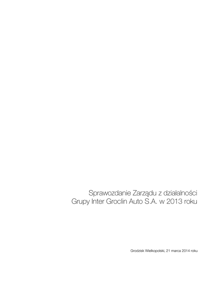 Sprawozdanie Zarządu z działalności Grupy Inter Groclin Auto S.A. w 2013 roku Grodzisk Wielkopolski, 21 marca 2014 roku Raport roczny za rok zakończony 31 grudnia 2013 roku Sprawozdanie Zarządu z działalności Grupy Inter Groclin Auto S.A. Spis treści Wprowadzenie ............................................................................................................................................................... 4 Informacje o sprawozdaniu ............................................................................................................................................ 4 Stwierdzenia odnoszące się do przyszłych oczekiwań ................................................................................................... 4 Stwierdzenia odnoszące się do czynników ryzyka ......................................................................................................... 5 Opis działalności Grupy Inter Groclin Auto ..................................................................................................................... 5 Informacje ogólne .......................................................................................................................................................... 5 Struktura Grupy Kapitałowej .......................................................................................................................................... 7 Zmiany w strukturze kapitałowej Grupy Inter Groclin Auto .............................................................................................. 9 Zmiany w podstawowych zasadach zarządzania ........................................................................................................... 9 Struktura akcjonariatu .................................................................................................................................................... 9 Otoczenie rynkowe ...................................................................................................................................................... 10 Przychody ze sprzedaży .............................................................................................................................................. 11 Rynki zbytu .................................................................................................................................................................. 11 Odbiorcy ...................................................................................................................................................................... 12 Dostawcy ..................................................................................................................................................................... 12 Objaśnienia dotyczące sezonowości lub cykliczności działalności ................................................................................ 13 Badania i rozwój .......................................................................................................................................................... 13 Środowisko naturalne .................................................................................................................................................. 13 Podsumowanie skonsolidowanych wyników finansowych ........................................................................................... 14 Skonsolidowany rachunek zysków i strat ..................................................................................................................... 14 Skonsolidowane sprawozdanie z sytuacji finansowej ................................................................................................... 15 Istotne informacje i czynniki mające wpływ na osiągane wyniki finansowe oraz ocenę sytuacji finansowej ................... 17 Kluczowe czynniki wpływające na wyniki działalności ................................................................................................... 17 Zdarzenia i czynniki o charakterze nietypowym ............................................................................................................ 17 Wpływ zmian w strukturze Grupy Inter Groclin Auto na wynik finansowy ..................................................................... 17 Emisja papierów wartościowych .................................................................................................................................. 18 Czynniki mające wpływ na rozwój Inter Groclin Auto .................................................................................................... 18 Czynniki mające wpływ na wyniki finansowe w perspektywie kolejnego roku ............................................................... 19 Czynniki ryzyka ............................................................................................................................................................ 20 Informacje uzupełniające .............................................................................................................................................. 21 Objaśnienie różnic pomiędzy wynikami finansowymi, a wcześniej publikowanymi prognozami..................................... 21 Informacje o dywidendzie ............................................................................................................................................. 22 Umowy kredytowe i obligacje....................................................................................................................................... 22 Wynagrodzenia wypłacone członkom Zarządu oraz Rady Nadzorczej ......................................................................... 23 Umowy z członkami Zarządu gwarantujące rekompensaty finansowe.......................................................................... 24 Stan posiadania akcji emitenta lub uprawnień do nich przez osoby zarządzające i nadzorują