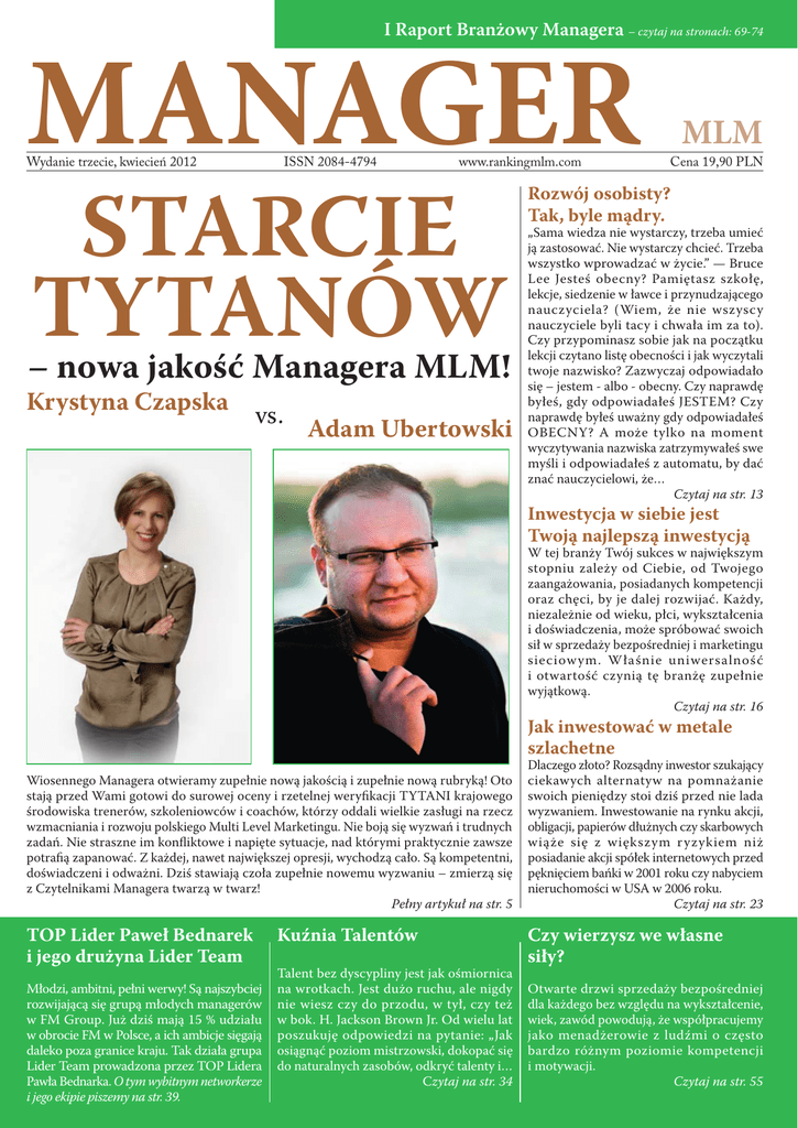 MANAGER I Raport Branżowy Managera – czytaj na stronach: 69-74 Wydanie trzecie, kwiecień 2012 ISSN 2084-4794 www.rankingmlm.com STARCIE TYTANÓW – nowa jakość Managera MLM! Krystyna Czapska vs. Adam Ubertowski MLM Cena 19,90 PLN Rozwój osobisty? Tak, byle mądry. „Sama wiedza nie wystarczy, trzeba umieć ją zastosować. Nie wystarczy chcieć. Trzeba wszystko wprowadzać w życie.” — Bruce Lee Jesteś obecny? Pamiętasz szkołę, lekcje, siedzenie w ławce i przynudzającego nauczyciela? (Wiem, że nie wszyscy nauczyciele byli tacy i chwała im za to). Czy przypominasz sobie jak na początku lekcji czytano listę obecności i jak wyczytali twoje nazwisko? Zazwyczaj odpowiadało się – jestem - albo - obecny. Czy naprawdę byłeś, gdy odpowiadałeś JESTEM? Czy naprawdę byłeś uważny gdy odpowiadałeś OBECNY? A może tylko na moment wyczytywania nazwiska zatrzymywałeś swe myśli i odpowiadałeś z automatu, by dać znać nauczycielowi, że… Czytaj na str. 13 Inwestycja w siebie jest Twoją najlepszą inwestycją W tej branży Twój sukces w największym stopniu zależy od Ciebie, od Twojego zaangażowania, posiadanych kompetencji oraz chęci, by je dalej rozwijać. Każdy, niezależnie od wieku, płci, wykształcenia i doświadczenia, może spróbować swoich sił w sprzedaży bezpośredniej i marketingu sieciowym. Właśnie uniwersalność i otwartość czynią tę branżę zupełnie wyjątkową. Czytaj na str. 16 Jak inwestować w metale szlachetne Wiosennego Managera otwieramy zupełnie nową jakością i zupełnie nową rubryką! Oto stają przed Wami gotowi do surowej oceny i rzetelnej weryfikacji TYTANI krajowego środowiska trenerów, szkoleniowców i coachów, którzy oddali wielkie zasługi na rzecz wzmacniania i rozwoju polskiego Multi Level Marketingu. Nie boją się wyzwań i trudnych zadań. Nie straszne im konfliktowe i napięte sytuacje, nad którymi praktycznie zawsze potrafią zapanować. Z każdej, nawet największej opresji, wychodzą cało. Są kompetentni, doświadczeni i odważni. Dziś stawiają czoła zupełnie nowemu wyzwaniu – zmierzą się z Czytelnikami Managera twarzą w twarz! Pełny artykuł na str. 5 Dlaczego złoto? Rozsądny inwestor szukający ciekawych alternatyw na pomnażanie swoich pieniędzy stoi dziś przed nie lada wyzwaniem. Inwestowanie na rynku akcji, obligacji, papierów dłużnych czy skarbowych wiąże się z większym ryzykiem niż posiadanie akcji spółek internetowych przed pęknięciem bańki w 2001 roku czy nabyciem nieruchomości w USA w 2006 roku. Czytaj na str. 23 TOP Lider Paweł Bednarek i jego drużyna Lider Team Czy wierzysz we własne siły? Młodzi, ambitni, pełni werwy! Są najszybciej rozwijającą się grupą młodych managerów w FM Group. Już dziś mają 15 % udziału w obrocie FM w Polsce, a ich ambicje sięgają daleko poza granice kraju. Tak działa grupa Lider Team prowadzona przez TOP Lidera Pawła Bednarka. O tym wybitnym networkerze i jego ekipie piszemy na str. 39. Kuźnia Talentów Talent bez dyscypliny jest jak ośmiornica na wrotkach. Jest dużo ruchu, ale nigdy nie wiesz czy do przodu, w tył, czy też w bok. H. Jackson Brown Jr. Od wielu lat poszukuję odpowiedzi na pytanie: „Jak osiągnąć poziom mistrzowski, dokopać się do naturalnych zasobów, odkryć talenty i… Czytaj na str. 34 Otwarte drzwi sprzedaży bezpośredniej dla każdego bez względu na wykształcenie, wiek, zawód powodują, że współpracujemy jako menadżerowie z ludźmi o często bardzo różnym poziomie kompetencji i motywacji. Czytaj na str. 55 Apartamenty w Sky Tower » we Wrocławiu » już w sprzedaży »» Luksusowe apartamenty pod klucz. »» Dedykowany Concierge dla mieszkańców. »» Apartamenty o powierzchni » od 46 do 220 m2. »» Najwyższy budynek w Polsce: » 51 pięter, 212 m. »» Lokalizacja: przy głównej arterii Wrocławia - » ul. Powstańców Śląskich. »» Kompleks biurowy i galeria handlowa » na wyciągnięcie ręki. Biuro Sprzedaży Apartamentów Anna Sirojć tel. 667 870 465 [email protected] www.skytower.pl Słowo od wydawcy Drodzy Czytelnicy! Jest mi niezmiernie miło obserwować, jak nasz portal www.rankingmlm.com oraz kwartalnik Manager MLM rozwijają się razem z Wami. Jesteśmy już niezaprzeczalnie największym portalem i czasopismem branżowym w kraju, o czym świadczą nasze statystyki. Po ponad roku działalności możemy pochwalić się na dzień 01.04.2012r. prawie 3 000 000 odsłon! Ponad 210 000 unikalnych użytkowników! Średni czas spędzony na naszym portalu, to aż 6 minut i 28 sekund! To dzięki Wam możemy być dumni z takich statystyk. Ale nie poprzestajemy na tym! Czekają nas miesiące ciężkiej pracy, której celem i zaplanowanym efektem będzie ułatwienie Wam rozwoju struktur i umożliwienie dostępu do informacji, które pozwolą Wam rozwinąć skrzydła i zbudować struktury również poza granicami kraju. Pamiętajcie, że portal www.rankingmlm.com i magazyn Manager MLM są przede wszystkim Waszym instrumentem do skutecznego i dynamicznego rozwoju własnego biznesu. To nasza podstawowa misja i zasadniczy cel działalności. Z myślą o Waszej promocji tworzymy i udoskonalamy nowe rubryki w portalu i magazynie. Miło mi jest poinformować, że zainteresowanie naszymi mediami wciąż rośnie i staje się coraz bardziej intensywne i wyraźne. Jesteśmy zapraszani na wszystkie, najważniejsze i najbardziej prestiżowe konwencje, konferencje, spotkania integracyjne i wszelkie inne uroczystości związane z sukcesami i osiągnięciami branży Multi Level Marketingu. Już nie tylko w Polsce, ale także w krajach sąsiadujących z nami. Nasza redakcja jest obecna na większości imprez inicjowanych przez polski Multi Level Marketing, a informacje o tym, gdzie byliśmy, są zawsze na bieżąco przekazywane za pośrednictwem portalu i dodatkowo uzupełniane w kwartalniku. Bardzo serdecznie zapraszam do lektury! Joanna Bromboszcz – Wydawca kwartalnika 