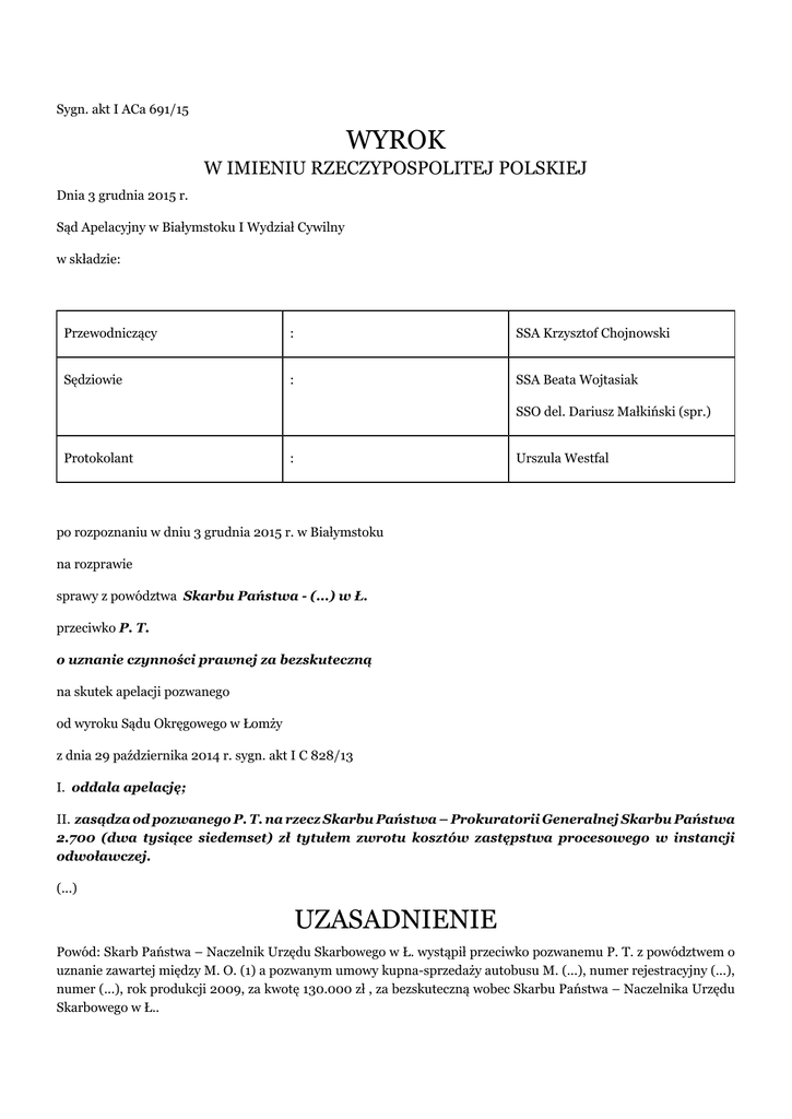Sygn. akt I ACa 691/15 WYROK W IMIENIU RZECZYPOSPOLITEJ POLSKIEJ Dnia 3 grudnia 2015 r. Sąd Apelacyjny w Białymstoku I Wydział Cywilny w składzie: Przewodniczący : SSA Krzysztof Chojnowski Sędziowie : SSA Beata Wojtasiak SSO del. Dariusz Małkiński (spr.) Protokolant : Urszula Westfal po rozpoznaniu w dniu 3 grudnia 2015 r. w Białymstoku na rozprawie sprawy z powództwa Skarbu Państwa - (...) w Ł. przeciwko P. T. o uznanie czynności prawnej za bezskuteczną na skutek apelacji pozwanego od wyroku Sądu Okręgowego w Łomży z dnia 29 października 2014 r. sygn. akt I C 828/13 I. oddala apelację; II. zasądza od pozwanego P. T. na rzecz Skarbu Państwa – Prokuratorii Generalnej Skarbu Państwa 2.700 (dwa tysiące siedemset) zł tytułem zwrotu kosztów zastępstwa procesowego w instancji odwoławczej. (...) UZASADNIENIE Powód: Skarb Państwa – Naczelnik Urzędu Skarbowego w Ł. wystąpił przeciwko pozwanemu P. T. z powództwem o uznanie zawartej między M. O. (1) a pozwanym umowy kupna-sprzedaży autobusu M. (...), numer rejestracyjny (...), numer (...), rok produkcji 2009, za kwotę 130.000 zł , za bezskuteczną wobec Skarbu Państwa – Naczelnika Urzędu Skarbowego w Ł.. Wyrokiem zaocznym z dnia 19 lutego 2014 r. wydanym w sprawie o sygn. akt : I C 828/13 Sąd Okręgowy w Łomży zadośćuczynił w całości roszczeniu powoda. Pozwany w sprzeciwie od powyższego wyroku zaocznego wniósł o uchylenie tego orzeczenia i oddalenie powództwa w całości oraz zasądzenie od powoda na rzecz pozwanego kosztów postępowania. Sąd Okręgowy w Łomży I Wydział Cywilny w wyroku z dnia 29 października 2014 r. utrzymał w mocy wyrok zaoczny z dnia 19 lutego 2014 r. w punktach I i II ( pkt I ) i uchylił go w pkt III ( pkt II ). Rozstrzygnięcie to zapadło na gruncie niżej podanych ustaleń faktycznych i motywów prawnych. P. T. i M. O. (1) są rodzonymi braćmi ; ten ostatni w momencie zawarcia związku małżeńskiego przyjął nazwisko żony. M. O. (1) prowadził działalność gospodarczą pod firmą (...), a jej przedmiotem był przewóz osób. Posiadał w związku z tym m. in. Autobus marki M. (...) z 2009 r. o numerze rej. (...). Aktualnie nie prowadzi on już działalności gospodarczej i od kilku miesięcy przebywa za granicą. W wyniku przeprowadzonego w przedsiębiorstwie (...) w dniach od 9 do 24 lipca 2012 r. postępowania kontrolnego w zakresie rzetelności deklarowanych podstaw opodatkowania oraz rozliczeń podatku dochodowego od osób fizycznych za lata 2008-2009 oraz podatku od towarów i usług za miesiące od stycznia 2008 r. do grudnia 2009 r. stwierdzono, że podatek wykazany przez M. O. (1) w deklaracjach i zeznaniach jest zaniżony i nie został zapłacony. Po otrzymaniu wyniku kontroli M. O. (1) w dniu 31 lipca 2012 r. złożył korekty deklaracji VAT-7 za wymienione miesiące oraz korekty zeznań podatkowych PIT-36 za lata 2008-2009. Na podstawie owych korekt, wobec tego, że wykazany przez M. O. (1) podatek nie został zapłacony , Naczelnik Urzędu Skarbowego w Ł. wystawił przeciwko niemu tytuły wykonawcze o numerach : SM (...), SM (...), SM (...), SM (...), SM (...), SM (...), SM (...), SM (...), SM (...), SM (...), SM (...), SM (...), SM (...), SM (...), SM (...), SM (...), SM (...), SM (...), SM (...), SM (...), SM (...), SM (...), SM (...), dotyczące należności z tytułu podatku od towarów i usług za miesiące od stycznia 2008 do listopada 2009 oraz tytuły SM (...), SM (...), SM (...), SM (...), dotyczące należności z tytułu podatku dochodowego od osób fizycznych za lata 2008-2009 i skierował je do organu egzekucyjnego. Odpisy powyższych tytułów dłużnik otrzymał w dniu 17 września 2012 r. Kolejnymi tytułami skierowanymi do organu egzekucyjnego były tytuły wykonawcze o numerach : (...), (...), (...), (...), (...), (...), (...), (...), (...), (...), (...), (...), (...), (...), (...), (...), (...), (...), (...), (...), (...), (...), (...), (...). Dotyczyły one odsetek od należności z tytułu podatku dochodowego od osób fizycznych. Podstawą wystawienia tych tytułów były decyzje organu podatkowego z dnia 31 sierpnia 2012 r. oznaczone nr: (...). Odpisy wymienionych tytułów doręczono zobowiązanemu w dniu 5 października 2012 r. W oparciu o powyższe tytuły wykonawcze prowadzone jest postępowanie egzekucyjne, celem wyegzekwowania zaległości M. O. (1) wobec Skarbu Państwa - Naczelnika Urzędu Skarbowego w Ł.. Wysokość tych zadłużeń na dzień 7 lipca 2013 r. wynosiła 1.746.578,42 zł, w tym 1.075.788,15 zł - należność główna, 601.752,15 zł - odsetki, 69.029,26 zł - koszty egzekucyjne, 8,80 zł - koszty upomnienia. Później stan zadłużenia nieznacznie się zmniejszył i we wrześniu 2014 r. kwota główna zadłużenia wynosiła 1.072.518,38 zł. Dokonane w toku postępowania egzekucyjnego w dniu 6 września 2012 r. zajęcie wierzytelności z rachunku bankowego M. O. (1) okazało się bezskuteczne, a ponadto ujawniło istnienie niezaspokojonych zaległości wobec Zakładu Ubezpieczeń Społecznych. Natomiast zajęcie wierzytelności u dłużników M. O. (1) przyniosło wpływy niewystarczające na zaspokojenie wierzyciela. W toku postępowania egzekucyjnego ustalono, że dłużnik poza kilkoma pojazdami nie posiada żadnych nieruchomości czy też rzeczy ruchomych, z zajęcia i sprzedaży których mógłby zaspokoić się wierzyciel. Spośród posiadanych przez niego czterech samochodów dwa zostały zajęte i sprzedane na licytacji ale kwoty uzyskane ze sprzedaży zostały zaliczone jedynie na koszty egzekucyjne. Trzeci pojazd - autobus marki V. (...) , nie stanowi wyłącznej własności dłużnika. Współwłaścicielem pojazdu w części 49/100 jest (...) Bank S.A. w W. na podstawie umowy przewłaszczenia z dnia 16 maja 2013 r. Samochód ten również został zajęty w toku postępowania egzekucyjnego. Podjęte też zostały czynności zmierzające do sprzedaży udziału 51/100 należącego do