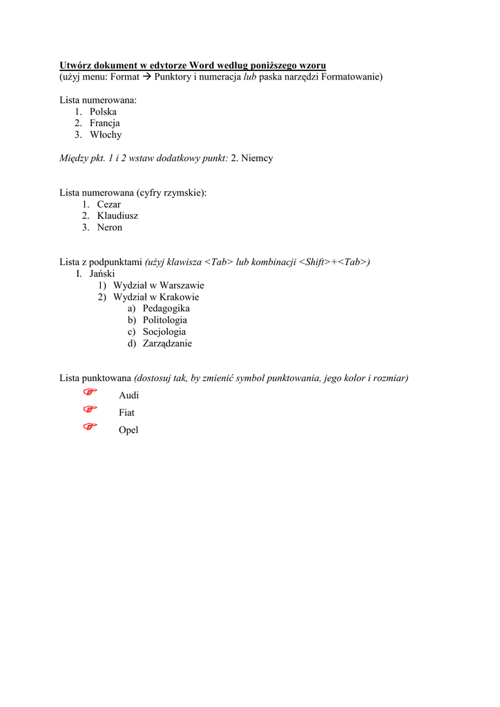 Utwórz dokument w edytorze Word według poniŜszego wzoru (uŜyj menu: Format Punktory i numeracja lub paska narzędzi Formatowanie) Lista numerowana: 1. Polska 2. Francja 3. Włochy Między pkt. 1 i 2 wstaw dodatkowy punkt: 2. Niemcy Lista numerowana (cyfry rzymskie): 1. Cezar 2. Klaudiusz 3. Neron Lista z podpunktami (uŜyj klawisza <Tab> lub kombinacji <Shift>+<Tab>) I. Jański 1) Wydział w Warszawie 2) Wydział w Krakowie a) Pedagogika b) Politologia c) Socjologia d) Zarządzanie Lista punktowana (dostosuj tak, by zmienić symbol punktowania, jego kolor i rozmiar) Audi Fiat Opel