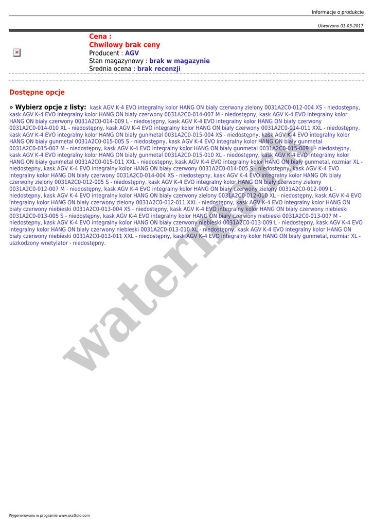 Informacje o produkcie Utworzono 01-03-2017 Cena : Chwilowy brak ceny Producent : AGV Stan magazynowy : brak w magazynie Średnia ocena : brak recenzji Dostępne opcje » Wybierz opcje z listy: kask AGV K-4 EVO integralny kolor HANG ON biały czerwony zielony 0031A2C0-012-004 XS - niedostępny, w at er m ar k kask AGV K-4 EVO integralny kolor HANG ON biały czerwony 0031A2C0-014-007 M - niedostępny, kask AGV K-4 EVO integralny kolor HANG ON biały czerwony 0031A2C0-014-009 L - niedostępny, kask AGV K-4 EVO integralny kolor HANG ON biały czerwony 0031A2C0-014-010 XL - niedostępny, kask AGV K-4 EVO integralny kolor HANG ON biały czerwony 0031A2C0-014-011 XXL - niedostępny, kask AGV K-4 EVO integralny kolor HANG ON biały gunmetal 0031A2C0-015-004 XS - niedostępny, kask AGV K-4 EVO integralny kolor HANG ON biały gunmetal 0031A2C0-015-005 S - niedostępny, kask AGV K-4 EVO integralny kolor HANG ON biały gunmetal 0031A2C0-015-007 M - niedostępny, kask AGV K-4 EVO integralny kolor HANG ON biały gunmetal 0031A2C0-015-009 L - niedostępny, kask AGV K-4 EVO integralny kolor HANG ON biały gunmetal 0031A2C0-015-010 XL - niedostępny, kask AGV K-4 EVO integralny kolor HANG ON biały gunmetal 0031A2C0-015-011 XXL - niedostępny, kask AGV K-4 EVO integralny kolor HANG ON biały gunmetal, rozmiar XL niedostępny, kask AGV K-4 EVO integralny kolor HANG ON biały czerwony 0031A2C0-014-005 S - niedostępny, kask AGV K-4 EVO integralny kolor HANG ON biały czerwony 0031A2C0-014-004 XS - niedostępny, kask AGV K-4 EVO integralny kolor HANG ON biały czerwony zielony 0031A2C0-012-005 S - niedostępny, kask AGV K-4 EVO integralny kolor HANG ON biały czerwony zielony 0031A2C0-012-007 M - niedostępny, kask AGV K-4 EVO integralny kolor HANG ON biały czerwony zielony 0031A2C0-012-009 L niedostępny, kask AGV K-4 EVO integralny kolor HANG ON biały czerwony zielony 0031A2C0-012-010 XL - niedostępny, kask AGV K-4 EVO integralny kolor HANG ON biały czerwony zielony 0031A2C0-012-011 XXL - niedostępny, kask AGV K-4 EVO integralny kolor HANG ON biały czerwony niebieski 0031A2C0-013-004 XS - niedostępny, kask AGV K-4 EVO integralny kolor HANG ON biały czerwony niebieski 0031A2C0-013-005 S - niedostępny, kask AGV K-4 EVO integralny kolor HANG ON biały czerwony niebieski 0031A2C0-013-007 M niedostępny, kask AGV K-4 EVO integralny kolor HANG ON biały czerwony niebieski 0031A2C0-013-009 L - niedostępny, kask AGV K-4 EVO integralny kolor HANG ON biały czerwony niebieski 0031A2C0-013-010 XL - niedostępny, kask AGV K-4 EVO integralny kolor HANG ON biały czerwony niebieski 0031A2C0-013-011 XXL - niedostępny, kask AGV K-4 EVO integralny kolor HANG ON biały gunmetal, rozmiar XL uszkodzony wnetylator - niedostępny. Wygenerowano w programie www.oscGold.com
