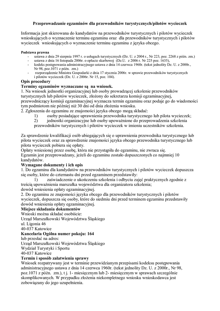 Przeprowadzanie egzaminów dla przewodników turystycznych/pilotów wycieczek Informacja jest skierowana do kandydatów na przewodników turystycznych i pilotów wycieczek wnioskujących o wyznaczenie terminu egzaminu oraz dla przewodników turystycznych i pilotów wycieczek wnioskujących o wyznaczenie terminu egzaminu z języka obcego. Podstawa prawna - ustawa z dnia 29 sierpnia 1997 r. o usługach turystycznych (Dz. U. z 2004 r., Nr 223, poz. 2268 z późn. zm.) - ustawa z dnia 16 listopada 2006r. o opłacie skarbowej (Dz.U. z 2006 r. Nr 225 poz. 1635), - kodeks postępowania administracyjnego ustawa z dnia 14 czerwca 1960r. (tekst jednolity Dz. U. z 2000r., Nr 98, poz.1071 z późn. zm.) rozporządzenie Ministra Gospodarki z dnia 17 stycznia 2006r. w sprawie przewodników turystycznych i pilotów wycieczek (Dz. U. z 2006r. Nr 15, poz. 104). Opis procedury Terminy egzaminów wyznaczane są na wniosek. 1. Na wniosek jednostki organizacyjnej lub osoby prowadzącej szkolenie przewodników turystycznych lub pilotów wycieczek, złożony do sekretarza komisji egzaminacyjnej, przewodniczący komisji egzaminacyjnej wyznacza termin egzaminu oraz podaje go do wiadomości tym podmiotom nie później niż 30 dni od dnia złożenia wniosku. 2. Zgłoszenia do egzaminu ze znajomości języka obcego mogą składać: 1) osoby posiadające uprawnienia przewodnika turystycznego lub pilota wycieczek; 2) jednostki organizacyjne lub osoby upoważnione do przeprowadzenia szkolenia przewodników turystycznych i pilotów wycieczek w imieniu uczestników szkolenia. Za sprawdzenie kwalifikacji osób ubiegających się o uprawnienia przewodnika turystycznego lub pilota wycieczek oraz za sprawdzenie znajomości języka obcego przewodnika turystycznego lub pilota wycieczek pobiera się opłaty. Opłaty wniesionej przez osobę, która nie przystąpiła do egzaminu, nie zwraca się. Egzamin jest przeprowadzany, jeżeli do egzaminu zostało dopuszczonych co najmniej 10 kandydatów. Wymagane dokumenty i ich opis 1. Do egzaminu dla kandydatów na przewodników turystycznych i pilotów wycieczek dopuszcza się osoby, które do czternastu dni przed egzaminem przedstawiły: 1) zaświadczenie o ukończeniu szkolenia i odbyciu zajęć praktycznych zgodnie z treścią upoważnienia marszałka województwa dla organizatora szkolenia; dowód wniesienia opłaty egzaminacyjnej. 2. Do egzaminu ze znajomości języka obcego dla przewodników turystycznych i pilotów wycieczek, dopuszcza się osoby, które do siedmiu dni przed terminem egzaminu przedstawiły dowód wniesienia opłaty egzaminacyjnej. Miejsce składania dokumentów Wnioski można składać osobiście: Urząd Marszałkowski Województwa Śląskiego ul. Ligonia 46 40-037 Katowice Kancelaria Ogólna numer pokoju: 164 lub przesłać na adres: Urząd Marszałkowski Województwa Śląskiego Wydział Turystyki i Sportu 40-037 Katowice Termin i sposób załatwienia sprawy Wniosek rozpatrywany jest w terminie przewidzianym przepisami kodeksu postępowania administracyjnego ustawa z dnia 14 czerwca 1960r. (tekst jednolity Dz. U. z 2000r., Nr 98, poz.1071 z późn. zm.), t j. 1- miesięcznym lub 2- miesięcznym w sprawach szczególnie skomplikowanych. W przypadku złożenia niekompletnego wniosku wnioskodawca jest zobowiązany do jego uzupełnienia. Opłaty Opłata za egzamin osób ubiegających się o uprawnienia przewodnika turystycznego i pilota wycieczek, a także za egzamin ze znajomości języka obcego przez przewodnika turystycznego i pilota wycieczek wynosi: 1) 120,00 złotych - za część teoretyczną egzaminu osób ubiegających się o uprawnienia przewodnika turystycznego lub pilota wycieczek; 2) 120,00 złotych - za część praktyczną egzaminu osób ubiegających się o uprawnienia przewodnika miejskiego i terenowego; 3) 180,00 złotych - za część praktyczną egzaminu osób ubiegających się o uprawnienia przewodnika górskiego; 4) 80,00 złotych - za część praktyczną egzaminu osób ubiegających się o uprawnienia pilota wycieczek; 5) 300,00 złotych - za egzamin sprawdzający kwalifikacje przewodnika turystycznego i pilota wycieczek, któremu zawieszono uprawnienia; 6) 120,00 złotych - za egzamin ze znajomości języka obcego przez przewodnika turystycznego i pilota wycieczek. Po uprzednim rozpoznaniu wniosku przez organ, a następnie zaproszeniu na egzamin. Opłaty za egzamin należy wpłacać na konto: Urząd Marszałkowski Województwa Śląskiego: 70 1560 1111 0000 9070 0003 5181 Za wydanie świadectwa o zdanym egzaminie pobiera się opłatę – 17 zł. : Opłata winna zostać dokonana w formie: - gotówkowej: kasa Urzędu Miasta w Katowicach Kasa Urzędu Miasta czynna: - w poniedziałki i czwartki w godz. 7.30-17.00 - wtorki i piątki w godz. 7.30-15.30 - w środy w godz. 7.30-13.00 lub bezgotówkowej: Numer konta: 46 1050 0099 5593 0211 1111 1111 Tytuł wpłaty: świadectwo zdania egzaminu Osoby do kontaktu; Agnieszka Mizerska : e-mail: [email protected], Wydział Turystyki i Sportu Urząd Marszałkowski Województwa Śląskiego ul. Ligonia 46/ siedziba Reymonta 24, I piętro, pok. 113 40-037 Katowice Nr telefonu i faxu (32) 77-40-976