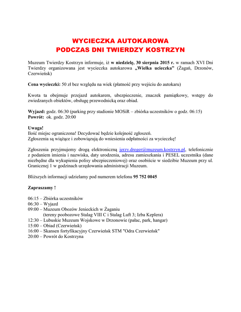 WYCIECZKA AUTOKAROWA PODCZAS DNI TWIERDZY KOSTRZYN Muzeum Twierdzy Kostrzyn informuje, iż w niedzielę, 30 sierpnia 2015 r. w ramach XVI Dni Twierdzy organizowana jest wycieczka autokarowa „Wielka ucieczka” (Żagań, Drzonów, Czerwieńsk) Cena wycieczki: 50 zł bez względu na wiek (płatność przy wejściu do autokaru) Kwota ta obejmuje przejazd autokarem, ubezpieczenie, znaczek pamiątkowy, wstępy do zwiedzanych obiektów, obsługę przewodnicką oraz obiad. Wyjazd: godz. 06:30 (parking przy stadionie MOSiR – zbiórka uczestników o godz. 06:15) Powrót: ok. godz. 20:00 Uwaga! Ilość miejsc ograniczona! Decydować będzie kolejność zgłoszeń. Zgłoszenia są wiążące i zobowiązują do wniesienia odpłatności za wycieczkę! Zgłoszenia przyjmujemy drogą elektroniczną [email protected], telefonicznie z podaniem imienia i nazwiska, daty urodzenia, adresu zamieszkania i PESEL uczestnika (dane niezbędne dla wykupienia polisy ubezpieczeniowej) oraz osobiście w siedzibie Muzeum przy ul. Granicznej 1 w godzinach urzędowania administracji Muzeum. Bliższych informacji udzielamy pod numerem telefonu 95 752 0045 Zapraszamy ! 06:15 – Zbiórka uczestników 06:30 – Wyjazd 09:00 – Muzeum Obozów Jenieckich w Żaganiu (tereny poobozowe Stalag VIII C i Stalag Luft 3; Izba Keplera) 12:30 – Lubuskie Muzeum Wojskowe w Drzonowie (pałac, park, hangar) 15:00 – Obiad (Czerwieńsk) 16:00 – Skansen fortyfikacyjny Czerwieńsk STM "Odra Czerwieńsk" 20:00 – Powrót do Kostrzyna