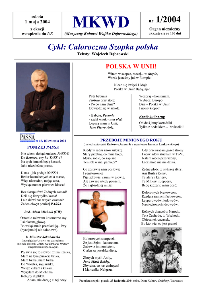 MKWD sobota 1 maja 2004 z okazji wstąpienia do UE (Muzyczny Kabaret Wojtka Dąbrowskiego) nr 1/2004 Organ niezależny ukazuje się co 100 dni Cykl: Całoroczna Szopka polska Teksty: Wojciech Dąbrowski POLSKA W UNII! Witam w szopce, raczej... w shopie, Wszak jesteśmy już w Europie! Niech się święci 1 Maja! Polska w Unii! Będą jaja! nr 15, 15 kwietnia 2004 PONIŻEJ PASSA Nie wiem, dokąd zmierza PASSA? Do Reutera, czy ku TASS-a? Na tych łamach będę hassać, Jako niezależna prassa. U nas - jak podaje NASSA Bzdur kosmicznych cała massa, Więc nietrudno, mając assa, Wyciąć numer pierwsza klassa! Pyta babunia Piotrka przy stole: - Po co nam Unia? Dowiedz się w szkole. Wczoraj – komunizm. Wybacz, Europo! Dziś – Polska w Unii! I nowy kłopot! - Babciu, Pecunia - rzekł wnuk - non olet! Lepszą mam w Unii, Jako Pierre, dolę. Kącik kulinarny PRZEBOJE MINIONEGO ROKU (melodia piosenki Kolorowe jarmarki z repertuaru Janusza Laskowskiego) Kiedy w radiu znów usłyszę Stary przebój, co mnie kręci, Myślę sobie, co zapisze Ten rok w mej pamięci? Gdy przewracam gazet strony I wywiadów słucham w Ti-Vi, Jestem nieco przerażony, Lecz mnie nic nie dziwi. Co zostawią nam posłowie I senatorowie? Piję zdrowie, szumi w głowie, Ale zawsze wtedy powiem, Że najbardziej mi żal: Żadne plotki z wyższej sfery, Ani Bush i Kerry, Te afery i kariery, Te Millery i Leppery, Będę szczery: mam dość: Bez skrupułów! Żadnych zassad! Dziś się liczy tylko kassa! I nie dziwi nas w tych czassach Żaden chwyt poniżej PASSA. Kolorowych brukowców, Rządu z samych fachowców, Lepperowców, ludowców, Nawiedzonych ideowców, Różnych zbawców Narodu, To z Zachodu, to Wschodu, Obiecanek-cacanek, Bo kto wie, co jest grane? Red. Adam Michnik (GW) Ostatnio miewam koszmarne sny I skołataną głowę. Bo wciąż mnie prześladują... lwy (bynajmniej nie salonowe). b. Minister Jakubowska (przeglądając Ustawy lub czasopisma, melodia piosenki Józek, nie daruję ci tej nocy z repertuaru zespołu Bajm) Pojawia się to słowo i znika i znika, Mam na tym punkcie bzika, Mam bzika, mam bzika. Do Włodka, sojusznika, Wciąż klikam i klikam, Wysyłam do Michnika Kolejny duplikat. Adam, nie daruję ci tej nocy! Od dziś jemy kartofelki Tylko z dodatkiem... brukselki! Kolorowych skarpetek, Że jest Sejm - kabaretem, Zabaw z immunitetem, Cyrku za poselską dietę, Złotych myśli Anity, Jana Marii Rokity, Zbyszka, co nas zadręczał I Marszałka Nałęcza. Premiera szopki: piątek, 23 kwietnia 2004 roku, Dom Kultury Stokłosy, Warszawa Str. 2 MKWD, Warszawa, nr 1/2004, sobota, 1 maja 2004 roku (w dniu wstąpienia do UE) PRZYSZEDŁ RYWIN DO MICHNIKA ANITA Chór Komisji Śledczej (melodia dziecięcej kołysanki Iskiereczka) (Don’t cry for me Argentina z filmu Evita) Przyszedł Rywin, chciał coś zmienić. Rzekł: Interes zrobię. Teraz czuje lęk przestrzeni: Ma Agora-fobię. Przyszedł Rywin do Michnika … Bardzo podniecony. Miał być Oskar! Lecz sen znika. Został … oskarżony. Na Wojtusia z popielnika Iskiereczka mruga. Przyszedł Rywin do Michnika … Bajka będzie długa. Przyszedł Rywin do Michnika … Rzekł: Bardzo cię cenię. Źle wycenił. Stąd wynika Nieporozumienie. Przyszedł Rywin do Michnika … Wpadł. Jak do sąsiada. Wziął Adama za wspólnika, Gdy usłyszał: A .. a .. dam! Wracał z ryb, więc rzekł, że bierze (Ryba, oczywiście), A gdy wspomniał o premierze, Myślał o … Pianiście. Przyszedł Rywin do Michnika … Kręcił. Jak na planie. Co technika, to technika! Zostało nagranie. Przyszedł Rywin do Michnika … Zwierzył się jak bratu. Teraz musi zejść z pomnika I nici z Polsatu. Przyszedł Rywin w tajnej misji … Latem. Na herbatę. Dziś Renatę B. z Komisji Dręczy RywinGATE. Witam! Ja jestem Anita. A to... jednoręki bandyta. Zgłaszam poprawkę: Obniżmy stawkę! O nic nie pytaj! Będziemy kwita. (parlando Jerzego Jaskierni) Poszedłem w odstawkę, na zieloną trawkę. Oj, nie warta była Skórka za... poprawkę! Przyszedł Rywin do Michnika ... Brzmi to dziś jak banał (blues). Niejednego polityka Wpędził w niezły Kanał (Plus). Przyszedł Rywin do Michnika … Wyszedł zlany potem. Teraz milczy, słów unika. Milczenie jest złotem. Przyszedł Rywin do Michnika … Chciał grać główną rolę. Dziś gra rolę męczennika. Prawda w oczy kole. (wersja męska: ch.. z nim! Ja p...). TAJEMNICA POLITYKA (melodia piosenki Tajemnica pamiętnika z repertuaru zespołu Trubadurzy) Przyszedł Rywin do Michnika… Chętnie by coś wziął. Dzięki niemu ma publika Reality show. Witam! Ja jestem Anita. To dziś... SLD-owska elita. Nie w ciemię bita, Lgnę do koryta. O nic nie pytaj! Jestem na szczytach. Przyszedł Rywin do Michnika … Jak naftowy szejk. Źle zrozumiał (bez słownika): Take or not to take? Witam! To znowu Anita! Kto chce niech mój raport przeczyta. Wina - Rywina! Z Komisji – kpina! O nic nie pytaj! Ja jestem kryta. (parlando) Że raport do dupy? Cóż na to poradzę? Miało nie być grupy trzymającej władzę! Przyszedł Rywin do Michnika … Pierwsze skrzypce grał. Będzie siedział. Jest panika! Lecz kto za nim stał? Przyszedł Rywin do Michnika … Miał od kogoś glejt. Niejednego polityka Czeka Rywingate. Przyszedł Rywin do Michnika … Miał koszmarny sen: Już dosięgał balonika ... A balonik hen. Następny numer ukaże się w niedzielę 8 sierpnia 2004 roku (100 dni po wstąpieniu do UE)