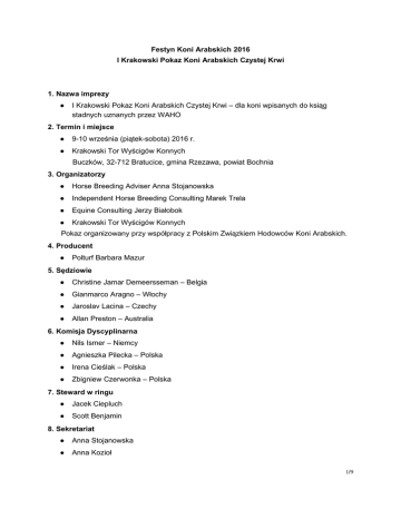Festyn Koni Arabskich 2016 I Krakowski Pokaz Koni Arabskich Czystej Krwi 1. Nazwa imprezy ● I Krakowski Pokaz Koni Arabskich Czystej Krwi – dla koni wpisanych do ksiąg stadnych uznanych przez WAHO 2. Termin i miejsce ● 9-10 września (piątek-sobota) 2016 r. ● Krakowski Tor Wyścigów Konnych Buczków, 32-712 Bratucice, gmina Rzezawa, powiat Bochnia 3. Organizatorzy ● Horse Breeding Adviser Anna Stojanowska ● Independent Horse Breeding Consulting Marek Trela ● Equine Consulting Jerzy Białobok ● Krakowski Tor Wyścigów Konnych Pokaz organizowany przy współpracy z Polskim Związkiem Hodowców Koni Arabskich. 4. Producent ● Polturf Barbara Mazur 5. Sędziowie ● Christine Jamar Demeersseman – Belgia ● Gianmarco Aragno – Włochy ● Jaroslav Lacina – Czechy ● Allan Preston – Australia 6. Komisja Dyscyplinarna ● Nils Ismer – Niemcy ● Agnieszka Pilecka – Polska ● Irena Cieślak – Polska ● Zbigniew Czerwonka – Polska 7. Steward w ringu ● Jacek Ciepluch ● Scott Benjamin 8. Sekretariat ● Anna Stojanowska ● Anna Kozioł 1/9 9. Prowadzenie pokazu ● Anna Stojanowska 10. Oprawa muzyczna ● Roman Koszper 11. Wyniki ● Lidia i Wiesław Pawłowscy (arabians.pl) 12. Program Pokazu Piątek (9 września) ● 15:00 – rozpoczęcie pokazu ● 15:10 – klasa I – ogierki roczne ● 15:50 – klasa II – ogierki dwuletnie ● 16:20 – klasa III – ogiery trzyletnie ● 16:40 – klasa A – wałachy ● 17:10 – klasa C – amatorzy prezenterzy Sobota (10 września) ● 10:00 – rozpoczęcie ● 10:10 – klasa B – źrebięta powyżej 3 miesiąca życia ● 10:40 – klasa IV – klaczki roczne ● 11:20 – klasa V – klaczki dwuletnie ● 11:50 – klasa VI – klacze trzyletnie ● 12:10 – klasa VII – klacze 4-6 letnie ● 12:50 – klasa VIII – klacze 7 letnie i starsze ● 13:20 – klasa IX – ogiery 4-6 letnie ● 13:50 – klasa X – ogiery 7 letnie i starsze ● 14:10 – 15:30 – przerwa ● 15:30 – Czempionat Ogierów Młodszych ● 16:00 – Czempionat Klaczy Młodszych ● 16:30 – Czempionat Klaczy Starszych ● 17:00 – Czempionat Ogierów Starszych ● 17:30 – zakończenie 13. Warunki weterynaryjne 1. Wszystkie konie biorące udział w pokazie, poza źrebiętami, muszą posiadać paszport z wpisem potwierdzającym aktualność szczepień przeciw grypie koni (ważność szczepień upływa po 6 miesiącach). 2. Źrebięta muszą być zgłoszone do księgi stadnej i posiadać chipy. Źrebięta odsadzone od matek powinny mieć udokumentowane szczepienie bazowe. 2/9 3. Środki służące do transportu winny być poddane dezynfekcji i spełniać obowiązujące przepisy. 4. Stosowne świadectwa i paszporty należy złożyć przed pokazem w biurze pokazu. Uwaga Transporty koni bez wymaganych świadectw weterynaryjnych nie zostaną wpuszczone na teren pokazu, a tym samym konie nie będą mogły być rozładowane i umieszczone w stajniach. Prosimy o zapoznanie się z dodatkową informacją na temat szczepień zamieszczoną pod warunkami. 14. Warunki techniczne ● Organizatorzy pokazu zapewniają miejsca w stajni od dnia 8 września (czwartek) od godz. 16:00 do dnia 11 września (niedziela) do godziny 8:00. ● Dla koni zapewniona jest słoma i siano; owies należy przywieźć. ● Zakwaterowanie i wyżywienie ◌ Noclegi na terenie pokazu – w dwu i trzyosobowych pokojach z łazienkami nad stajniami w cenie 50 zł za osobę za noc, z możliwością zamówienia śniadania w cenie 30 zł; liczba miejsc ograniczona – pokoje w pierwszej kolejności udostępnianie będą osobom z obsługi koni; rezerwacja: tel. +48 604 504 199 e-mail: [email protected] ◌ Noclegi w hotelach w okolicy: 1) „Nowa Bochnia” Centrum Konferencyjne i Spa ul. Poniatowskiego 24, 32-700 Bochnia tel. +48 14 615 30 00 e-mail: [email protected] www.nowabochnia.pl 2) „Hotel August” ul. Mickiewicza 66, 32-800 Brzesko tel. +48 14 663 10 83 e-mail: [email protected] www.hotelaugust.pl Organizator nie pośredniczy w rezerwacji miejsc noclegowych w hotelach. ◌ Całodzienne wyżywienie możliwe będzie w stoiskach gastronomicznych czynnych na terenie Festynu. 15. Nagrody ● Flos i nagrody honorowe ◌ Właściciel pierwszego konia w klasie otrzyma nagrodę honorową ufundowaną przez sponsora. Dla koni, które zajmą od I do V miejsca w klasach przewidziane są flos. 3/9 ◌ Przewidziane są flos dla złotych medalistów (czempionów), srebrnych medalistów (wiceczempionów) i brązowych medalistów (drugich wiceczempionów), a także nagrody honorowe dla ich właścicieli, ufundowane przez sponsorów. ● Nagrody finansowe Przewidziane są nagrody finansowe dla koni które zajęły od I do V miejsca w klasach oraz dla finałowych medalistów. ● Organizator dopuszcza możliwość innych nagród dodatkowych ufundowanych przez sponsorów pod warunkiem zgłoszenia i uzgodnienia ich w terminie najpóźniej jednego miesiąca przed pokazem, oraz dostarczenia regulaminu i zasad przyznawania nagrody. 16. Zasady rozgrywania klasy amatorów ● Klacze i ogiery które zdobyły brązowy, srebrny lub złoty medal w pokazach typu „Title”, A, B oraz C Międzynarodowy nie mogą brać udziału w klasie amatorów prezenterów, do końca roku kalendarzowego, w którym miało miejsce zdarzenie oraz przez dwa kolejne, kalendarzowe lata, chyba, że koń przechodzi do następnej kategorii wiekowej (tj. z „rocznych” do „młodzieżowych” lub z „młodzieżowych” do „seniorów”). ● Wałachy które zdobyły srebrny lub złoty medal w pokazach typu „Title” oraz A nie mogą brać udziału w tej klasie, do końca roku kalendarzowego, w którym miało miejsce zdarzenie oraz przez kolejny kalendarzowy rok. ● Konie mogą być prezentowane przez osoby, które nie pobierały wynagrodzenia za pokazywanie, trenowanie i przygotowywanie koni do pokazu. Pobieranie wynagrodzenia dotyczy wszelkich form zapłaty, otrzymywanych zarówno jako etatowy pracown