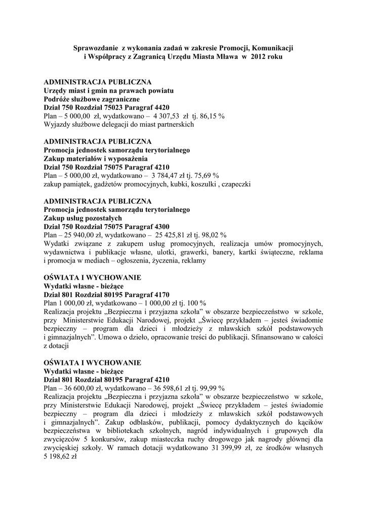 Sprawozdanie z wykonania zadań w zakresie Promocji, Komunikacji i Współpracy z Zagranicą Urzędu Miasta Mława w 2012 roku ADMINISTRACJA PUBLICZNA Urzędy miast i gmin na prawach powiatu Podróże służbowe zagraniczne Dział 750 Rozdział 75023 Paragraf 4420 Plan – 5 000,00 zł, wydatkowano – 4 307,53 zł tj. 86,15 % Wyjazdy służbowe delegacji do miast partnerskich ADMINISTRACJA PUBLICZNA Promocja jednostek samorządu terytorialnego Zakup materiałów i wyposażenia Dział 750 Rozdział 75075 Paragraf 4210 Plan – 5 000,00 zł, wydatkowano – 3 784,47 zł tj. 75,69 % zakup pamiątek, gadżetów promocyjnych, kubki, koszulki , czapeczki ADMINISTRACJA PUBLICZNA Promocja jednostek samorządu terytorialnego Zakup usług pozostałych Dział 750 Rozdział 75075 Paragraf 4300 Plan – 25 940,00 zł, wydatkowano – 25 425,81 zł tj. 98,02 % Wydatki związane z zakupem usług promocyjnych, realizacja umów promocyjnych, wydawnictwa i publikacje własne, ulotki, grawerki, banery, kartki świąteczne, reklama i promocja w mediach – ogłoszenia, życzenia, reklamy OŚWIATA I WYCHOWANIE Wydatki własne - bieżące Dział 801 Rozdział 80195 Paragraf 4170 Plan 1 000,00 zł, wydatkowano – 1 000,00 zł tj. 100 % Realizacja projektu „Bezpieczna i przyjazna szkoła” w obszarze bezpieczeństwo w szkole, przy Ministerstwie Edukacji Narodowej, projekt „Świecę przykładem – jesteś świadomie bezpieczny – program dla dzieci i młodzieży z mławskich szkół podstawowych i gimnazjalnych”. Umowa o dzieło, opracowanie treści do publikacji. Sfinansowano w całości z dotacji OŚWIATA I WYCHOWANIE Wydatki własne - bieżące Dział 801 Rozdział 80195 Paragraf 4210 Plan – 36 600,00 zł, wydatkowano – 36 598,61 zł tj. 99,99 % Realizacja projektu „Bezpieczna i przyjazna szkoła” w obszarze bezpieczeństwo w szkole, przy Ministerstwie Edukacji Narodowej, projekt „Świecę przykładem – jesteś świadomie bezpieczny – program dla dzieci i młodzieży z mławskich szkół podstawowych i gimnazjalnych”. Zakup odblasków, publikacji, pomocy dydaktycznych do kącików bezpieczeństwa w bibliotekach szkolnych, nagród indywidualnych i grupowych dla zwycięzców 5 konkursów, zakup miasteczka ruchy drogowego jak nagrody głównej dla zwycięskiej szkoły. W ramach dotacji wydatkowano 31 399,99 zł, ze środków własnych 5 198,62 zł OŚWIATA I WYCHOWANIE Wydatki własne - bieżące Dział 801 Rozdział 80195 Paragraf 4260 Plan 3 000 zł, wydatkowano – 3 000 zł tj. 100 % Realizacja projektu „Bezpieczna i przyjazna szkoła” w obszarze bezpieczeństwo w szkole, przy Ministerstwie Edukacji Narodowej, projekt „Świecę przykładem – jesteś świadomie bezpieczny – program dla dzieci i młodzieży z mławskich szkół podstawowych i gimnazjalnych”. Koszty eksploatacyjne biura projektu. Sfinansowano w całości ze środków własnych. OŚWIATA I WYCHOWANIE Wydatki własne - bieżące Dział 801 Rozdział 80195 Paragraf 43000 Plan 32 630,00 zł, wydatkowano – 29 782,20 zł tj. 91,27 % Realizacja projektu „Bezpieczna i przyjazna szkoła” w obszarze bezpieczeństwo w szkole, przy Ministerstwie Edukacji Narodowej, projekt „Świecę przykładem – jesteś świadomie bezpieczny – program dla dzieci i młodzieży z mławskich szkół podstawowych i gimnazjalnych”. Skład i druk publikacji wydanych w ramach projektu – komiks o bezpieczeństwie w ruchu drogowym, ulotka plan lekcji, kodeks młodego rowerzysty, szkolenie dla nauczycieli o bezpieczeństwie dzieci w drodze do i ze szkoły W ramach środków z dotacji wydatkowano 21 493,20 zł, ze środków własnych 8 289,00 zł. POMOC SPOŁECZNA Pozostała działalność Dział 852 Rozdział 85295 Paragraf 2810 Plan - 5 000,00 zł, wydatkowano – 5 000,00 zł, tj. 100 % Otwarty konkurs ofert w zakresie pomocy społecznej - pomocy najuboższym - fundacje. W ramach konkursu podpisano oraz rozliczono 1 umowę. POMOC SPOŁECZNA Pozostała działalność Dział 852 Rozdział 85295 Paragraf 2820 Plan - 3 500,00 zł, wydatkowano – 3 500,00 zł, tj. 100 % Otwarty konkurs ofert w zakresie pomocy społecznej - pomocy najuboższym - stowarzyszenia. W ramach konkursu podpisano oraz rozliczono 1 umowę. POZOSTAŁE ZADANIA W ZAKRESIE POLITYKI SPOŁECZNEJ Pozostała działalność Dział 853 Rozdział 85395 Paragraf 2820 Plan - 10 000,00 zł, wydatkowano – 10 000,00 zł, tj. 100 % Otwarty konkurs ofert w zakresie polityki społecznej, ochrony zdrowia - pomoc osobom z niepełnosprawnością. W ramach konkursu podpisano oraz rozliczono 7 umów. EDUKACYJNA OPIEKA WYCHOWAWCZA Kolonie i obozy oraz inne formy wypoczynku dzieci i młodzieży Dział 854 Rozdział 85412 Paragraf 2820 Plan – 20 000,00 zł, wydatkowano – 18 000,00 zł tj. 900 % Otwarty konkurs ofert na organizację wypoczynku dla dzieci i młodzieży. W ramach konkursu podpisano 12 umów. Jedna umowa została rozwiązana za porozumieniem stron. KULTURA I OCHRONA DZIEDZICTWA NARODOWEGO Pozostałe działanie w zakresie kultury Dział 921 Rozdział 92105 Paragraf 2820 Plan – 70 700,00 zł, wydatkowano – 70 520,44 zł, tj 99,75 % Otwarty konkurs ofert na realizację zadań publicznych w zakresie działalności kulturalnej Plan – 53 400,00 zł, wydatkowano – 53 220,88 zł, tj. 99,66 % Otwarty konkurs ofert w zakresie dofinansowania wkładu własnego organizacji pozarządowych oraz podmiotów wymienionych w art. 3 ust. 3 ustawy z dnia 24 kwietnia 2003 r. o działalności pożytku publicznego i o wolontariacie, realizujących projekty współfinansowane ze źródeł zewnętrznych. W ramach konkursu podpisano oraz rozliczono 1 umowę. Plan – 2 500,00 zł, wydatkowano – 2 500,00 zł, tj. 100 % Otwarty konkursy ofert na realizację zadań publicznych w zakresie aktywizacji osób starszych. W ramach konkursu podpisano oraz rozliczono 9 umów. Plan – 10 000,00 zł, wydatkowano – 9 999,56 zł, tj. 99,99 % Wniosek złożony z własnej inicjatywy organizacji 