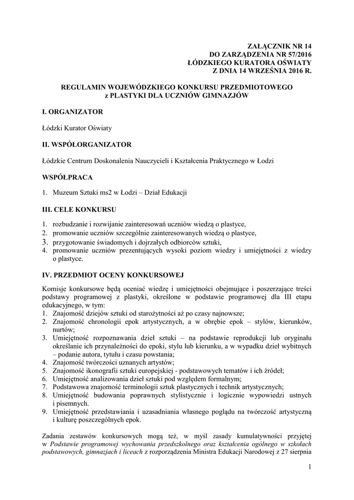 ZAŁĄCZNIK NR 14 DO ZARZĄDZENIA NR 57/2016 ŁÓDZKIEGO KURATORA OŚWIATY Z DNIA 14 WRZEŚNIA 2016 R. REGULAMIN WOJEWÓDZKIEGO KONKURSU PRZEDMIOTOWEGO z PLASTYKI DLA UCZNIÓW GIMNAZJÓW I. ORGANIZATOR Łódzki Kurator Oświaty II. WSPÓŁORGANIZATOR Łódzkie Centrum Doskonalenia Nauczycieli i Kształcenia Praktycznego w Łodzi WSPÓŁPRACA 1. Muzeum Sztuki ms2 w Łodzi – Dział Edukacji III. CELE KONKURSU 1. rozbudzanie i rozwijanie zainteresowań uczniów wiedzą o plastyce, 2. promowanie uczniów szczególnie zainteresowanych wiedzą o plastyce, 3. przygotowanie świadomych i dojrzałych odbiorców sztuki, 4. promowanie uczniów prezentujących wysoki poziom wiedzy i umiejętności z wiedzy o plastyce. IV. PRZEDMIOT OCENY KONKURSOWEJ Komisje konkursowe będą oceniać wiedzę i umiejętności obejmujące i poszerzające treści podstawy programowej z plastyki, określone w podstawie programowej dla III etapu edukacyjnego, w tym: 1. Znajomość dziejów sztuki od starożytności aż po czasy najnowsze; 2. Znajomość chronologii epok artystycznych, a w obrębie epok – stylów, kierunków, nurtów; 3. Umiejętność rozpoznawania dzieł sztuki – na podstawie reprodukcji lub oryginału określanie ich przynależności do epoki, stylu lub kierunku, a w wypadku dzieł wybitnych – podanie autora, tytułu i czasu powstania; 4. Znajomość twórczości uznanych artystów; 5. Znajomość ikonografii sztuki europejskiej - podstawowych tematów i ich źródeł; 6. Umiejętność analizowania dzieł sztuki pod względem formalnym; 7. Podstawowa znajomość terminologii sztuk plastycznych i technik artystycznych; 8. Umiejętność budowania poprawnych stylistycznie i logicznie wypowiedzi ustnych i pisemnych. 9. Umiejętność przedstawiania i uzasadniania własnego poglądu na twórczość artystyczną i kulturę poszczególnych epok. Zadania zestawów konkursowych mogą też, w myśl zasady kumulatywności przyjętej w Podstawie programowej wychowania przedszkolnego oraz kształcenia ogólnego w szkołach podstawowych, gimnazjach i liceach z rozporządzenia Ministra Edukacji Narodowej z 27 sierpnia 1 2012 roku z późn. zm., odnosić się do wymagań przypisanych do etapów wcześniejszych (I, II etap edukacyjny). Będą również odnosić się do najważniejszych umiejętności zdobywanych przez ucznia w trakcie kształcenia ogólnego w III etapie edukacyjnym. V. OBOWIĄZUJĄCA LITERATURA 1. Podręczniki dopuszczone do użytku szkolnego przez Ministerstwo Edukacji Narodowej z zakresu plastyki na poziomie gimnazjum. 2. Publikacje: a. M. Rzepińska, Siedem wieków malarstwa europejskiego, Warszawa 1988. b. K. Stopczyk, Bliżej sztuki - Podręcznik, WSiP, Warszawa 2009. c. K. Czernicka, Plastyka 1 – 3 Podręcznik, Operon 2009. d. J. A. Zieliński, J. Stożek – Świat sztuki, Podręcznik dla Gimnazjum, WSiP Warszawa 2009. VI. STRUKTURA Konkurs jest trzystopniowy: stopień I – szkolny, stopień II – rejonowy, stopień III – wojewódzki. VII. ZGŁASZANIE UCZNIÓW DO KONKURSU 1. Zgłaszanie uczniów do udziału w konkursie odbywa się wyłącznie poprzez rejestrację w elektronicznym systemie obsługi konkursów od 01.10 do 14.10.2016 r. (włącznie). Po tym terminie system nie będzie przyjmował zgłoszeń. 2. W eliminacjach konkursowych mogą brać udział wyłącznie uczniowie zgłoszeni w wyznaczonym terminie, których rodzice/prawni opiekunowie wyrazili pisemną zgodę na przetwarzanie danych osobowych. 3. Przystąpienie ucznia do konkursu jest jednoznaczne z akceptacją regulaminu wojewódzkiego konkursu przedmiotowego oraz zgodą na przetwarzanie danych osobowych (imię i nazwisko, nazwę szkoły, uzyskany wynik i przyznany tytuł laureata/ finalisty konkursu, imię i nazwisko nauczyciela/opiekuna). 4. Za zalogowanie gimnazjum i wpisanie danych uczniów odpowiedzialny jest dyrektor szkoły. VIII. TERMINARZ KONKURSU Eliminacje szkolne 2 grudnia 2016 roku, godz. 10.00 Eliminacje rejonowe 8 lutego 2017 roku, godz. 10.00 Eliminacje wojewódzkie 6-7 marca 2017 roku, godz. 9.00 IX. SPOSÓB I TERMIN OGŁASZANIA WYNIKÓW 1. Wyniki eliminacji na poszczególnych stopniach konkursu będą umieszczane w elektronicznym systemie obsługi konkursów i na stronie internetowej ŁCDNiKP www.wckp.lodz.pl, w części poświęconej konkursom. 2. Wyniki eliminacji na stopniu szkolnym zostaną ogłoszone 16 grudnia 2016 roku. 2 3. Wyniki eliminacji na stopniu rejonowym zostaną ogłoszone 20 lutego 2017 roku. 4. Wyniki eliminacji na stopniu wojewódzkim zostaną ogłoszone 9 marca 2017 roku. 5. Listy uczniów zakwalifikowanych do eliminacji rejonowych i do eliminacji wojewódzkich będą ogłoszone po zakończeniu procedur odwoławczych. 6. Lista laureatów i finalistów Wojewódzkiego Konkursu Przedmiotowego z Plastyki po zatwierdzeniu przez Łódzkiego Kuratora Oświaty zostanie ogłoszona na stronie internetowej Łódzkiego Centrum Doskonalenia Nauczycieli i Kształcenia Praktycznego www.wckp.lodz.pl w części poświęconej konkursom najpóźniej do 31 marca 2017 r. X. MIEJSCE PRZEPROWADZENIA ELIMINACJI KONKURSOWYCH 1. Informacje o miejscach przeprowadzenia eliminacji zostaną podane na stronie internetowej Łódzkiego Centrum Doskonalenia Nauczycieli i Kształcenia Praktycznego. 2. Eliminacje szkolne – szkoły, w których dyrektorzy powołali Szkolne Komisje Konkursowe. 3. Eliminacje rejonowe – szkoły lub placówki wskazane przez pracowników Kuratorium Oświaty. 4. Eliminacje wojewódzkie – szkoła lub placówka wskazana przez Wojewódzką Komisję Konkursową w porozumieniu z Kuratorium Oświaty w Łodzi. XI. PRZEBIEG KONKURSÓW A: Eliminacje szkolne: 1. Eliminacje szkolne są przeprowadzone w formie pisemnej. 2. Wojewódzka Komisja Konkursowa udostępnia w elektronicznym systemie obsługi konkursów testy na eliminacje szkolne w przeddzień terminu ogłoszonego w regulaminie. W przypadku eliminacji odbywających się w poniedziałek dniem udostępnienia testu jest piątek. 3. Model o