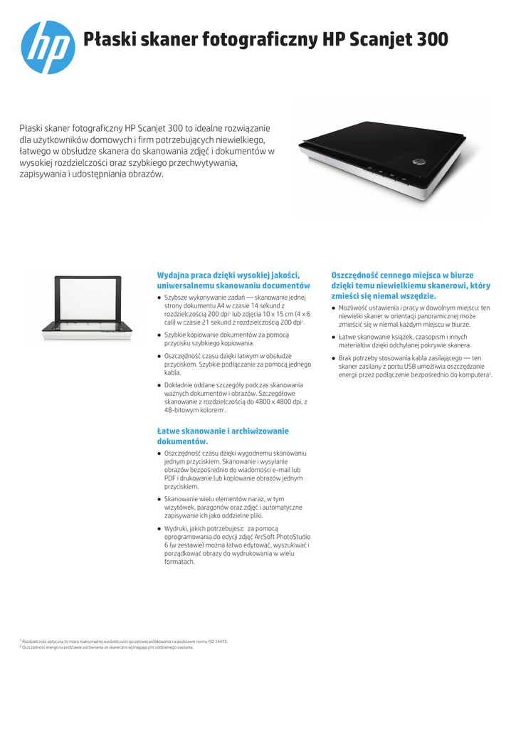 Płaski skaner fotograficzny HP Scanjet 300 Płaski skaner fotograficzny HP Scanjet 300 to idealne rozwiązanie dla użytkowników domowych i firm potrzebujących niewielkiego, łatwego w obsłudze skanera do skanowania zdjęć i dokumentów w wysokiej rozdzielczości oraz szybkiego przechwytywania, zapisywania i udostępniania obrazów. Wydajna praca dzięki wysokiej jakości, uniwersalnemu skanowaniu documentów ● Szybsze wykonywanie zadań — skanowanie jednej strony dokumentu A4 w czasie 14 sekund z rozdzielczością 200 dpi1 lub zdjęcia 10 x 15 cm (4 x 6 cali) w czasie 21 sekund z rozdzielczością 200 dpi1. Oszczędność cennego miejsca w biurze dzięki temu niewielkiemu skanerowi, który zmieści się niemal wszędzie. ● Możliwość ustawienia i pracy w dowolnym miejscu: ten niewielki skaner w orientacji panoramicznej może zmieścić się w niemal każdym miejscu w biurze. ● Szybkie kopiowanie dokumentów za pomocą przycisku szybkiego kopiowania. ● Łatwe skanowanie książek, czasopism i innych materiałów dzięki odchylanej pokrywie skanera. ● Oszczędność czasu dzięki łatwym w obsłudze przyciskom. Szybkie podłączanie za pomocą jednego kabla. ● Brak potrzeby stosowania kabla zasilającego — ten skaner zasilany z portu USB umożliwia oszczędzanie energii przez podłączenie bezpośrednio do komputera2. ● Dokładnie oddane szczegóły podczas skanowania ważnych dokumentów i obrazów. Szczegółowe skanowanie z rozdzielczością do 4800 x 4800 dpi, z 48-bitowym kolorem1. Łatwe skanowanie i archiwizowanie dokumentów. ● Oszczędność czasu dzięki wygodnemu skanowaniu jednym przyciskiem. Skanowanie i wysyłanie obrazów bezpośrednio do wiadomości e-mail lub PDF i drukowanie lub kopiowanie obrazów jednym przyciskiem. ● Skanowanie wielu elementów naraz, w tym wizytówek, paragonów oraz zdjęć i automatyczne zapisywanie ich jako oddzielne pliki. ● Wydruki, jakich potrzebujesz: za pomocą oprogramowania do edycji zdjęć ArcSoft PhotoStudio 6 (w zestawie) można łatwo edytować, wyszukiwać i porządkować obrazy do wydrukowania w wielu formatach. 1 Rozdzielczość optyczna to miara maksymalnej rozdzielczości sprzętowej próbkowania na podstawie normy ISO 14473. 2 Oszczędność energii na podstawie porównania ze skanerami wymagającymi oddzielnego zasilania. Płaski skaner fotograficzny HP Scanjet 300 DANE TECHNICZNE Technologia skanowania CIS (czujnik kontaktowy) CMOS Typ skanera Płaski; Skanowanie kolorowe: Tak rozdzielczość skanowania Sprzęt: Do 4800 x 4800 dpi Optyczny: Do 4800 dpi Optymalizowana: Do 19200 dpi Format pliku skanowania Windows i Linux: BMP, JPEG, GIF, TIFF, TIFF skompresowany, PNG, PCX, FlashPix (FPX), PDF, PDF z możliwością wyszukiwania, RTF, HTM, TXT; Mac: TIFF, PICT, JPEG, GIF, FlashPix, Plain Text, PDF, HTML, Rich Text. Mac HP Scan obsługuje : TIFF, PNG, JPEG, JPEG 2000, PDF, PDF z możliwością wyszukiwania, RTF, TXT: TIFF, PNG, JPEG, JPEG 2000, PDF, PDF z możliwością wyszukiwania, RTF, TXT. Mac Image Capture obsługuje: TIFF, PNG, JPEG, JPEG 2000, GIF, BMP, PDF Środowisko pracy Zakres tempretatur pracy: Od 10 do 35°C Zakres temperatur w czasie pracy: -40–+60°C Zalecany zakres temperatur pracy: Od 10 do 35°C Zalecany zakres wilgotności w czasie pracy: Wilgotność względna od 15 do 80% (bez kondensacji) Zasilanie Zużycie energii: 2,5 W (maks.), 0,5 W (tryb gotowości), 0,0125 W (wyłączenie Moc dźwięku 4.2 B(A) (skanowanie w kolorze 300 lub 600 dpi) ENERGY STAR Tak informacja o zgodności z przepisami/bezpieczeństwo IEC 60950-1:2005 (wydanie drugie) +A1, wszystkie wymagane różnice grupowe i krajowe + wszystkie stosowne poprawki; CSA/UL 60950-1 wydanie 2 (2007) + wszystkie stosowne poprawki; EN 60950-1:2006 +A11:2009 +A12 + wszystkie stosowne poprawki; cUL, CE, PVOC, TER, SON, SASO, BSMI, Ukraina, UL i inne Zgodność elektromagnetyczna Dyrektywa EMC 2004/108/WE (Europa); CISPR 22:2008, Klasa B; EN 55022:2010, EN 61000-3-2:2006 +A1:2009 +A2:2009, Klasa A; EN 61000-3-3:2008; CISPR 24:2010; EN 55024:2010; C-tick, CCC, CE, KCC, BSMI, Ukraina, FCC i inne ręczne) Tryby skanowania Cztery przyciski na panelu przednim (skanowanie, kopiowanie, skanowanie do PDF, skanowanie do wiadomości e-mail); Centrum obsługi HP; oraz aplikacja użytkownika przez interfejs TWAIN Źródło światła (skanowanie) Informacje o wskazaniach diod (trzy kolory) Skalowanie obrazu lub zakres powiększania Windows: 10 do 2400% w krokach co 1%. Mac: Nieobsługiwane Ustawienia rozdzielczości wyjściowej (dpi) Windows i Mac: 75; 150; 200; 300; 400; 600; 1200; 2400; 4800. Linux: 75; 150; 200; 240; 300; 400; 500; 600; 1200; 2400; 4800 Wymiary 373 x 274 x 44,5 mm; w opakowaniu: 434 x 86 x 335 mm Poziomy skali szarości/Kodowanie koloru 256; Głębia bitowa: 48-bitowa waga produktu 1,76 kg; w opakowaniu: 2,65 kg Cykl pracy (dobowy) Minimalny czas eksploatacji to 26 000 operacji skanowania. Zawartość opakowania Standardowe podłączenia 1 port Hi-Speed USB 2.0 L2733A: Płaski skaner fotograficzny HP Scanjet 300; Instrukcja instalacji; Napęd CD-ROM; Ulotki; Arkusz/karta gwarancyjna; 1 kabel Mini USB Opcjonalne podłączenia Brak Gwarancja Przygotowany do pracy w sieci Brak Panel sterowania Cztery przyciski na panelu przednim (skanowanie, kopiowanie, skanowanie do PDF, skanowanie do wiadomości e-mail) Roczna gwarancja z wymianą w następnym dniu roboczym, pomoc techniczna przez Internet w zestawie. Gwarancja może się różnić w zależności od kraju, zgodnie z wymogami prawa. Informacje na temat najwyższej jakości usług HP oraz opcji pomocy technicznej w danym regionie są dostępne na stronie http://www.hp.com/support. Obsługoiwane typy mediów Papier (zwykły, atramentowy, fotograficzny, gazety, czasopisma) Opcje usług i pomocy technicznej Wersja sterownika Twain Wersja 1.9 Dołączone oprogramowanie Windows: Oprogramowanie HP do skanowania (zawiera OCR); Mac: Oprogramowanie HP Scanjet (zawiera OCR); ArcSoft P