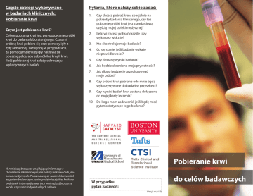 Częste zabiegi wykonywane w badaniach klinicznych: Pobieranie krwi Czym jest pobieranie krwi? Celem pobrania krwi jest przygotowanie próbki krwi do badania laboratoryjnego. Czasami próbkę krwi pobiera się przy pomocy igły z żyły ramiennej, zazwyczaj w przypadkach, za pomocą maleńkiej igły nakłuwa się opuszkę palca, aby zebrać kilka kropli krwi. Ilość pobieranej krwi zależy od rodzaju wykonywanych badań. Pytania, które należy sobie zadać: 1. Czy chcesz pobrać krew specjalnie na potrzeby badania klinicznego, czy też pobranie próbki krwi jest standardową częścią mojej opieki medycznej? 2. Ile krwi chcesz pobrać oraz ile razy wykonasz wkłucie? 3. Kto skontroluje moje badanie? 4. Co się stanie, jeśli badanie wykaże nieprawidłowości? 5. Czy dostanę wyniki badania? 6. Jak będzie chroniona moja prywatność? 7. Jak długo będziecie przechowywać moje próbki? 8. Czy próbki krwi pobrane ode mnie będą wykorzystywane do badań w przyszłości? 9. Czy wyniki badań krwi zostaną dołączone do mojej karty leczenia? 10. Do kogo mam zadzwonić, jeśli będę mieć pytania dotyczące tego badania? Pobieranie krwi W niniejszej broszurze znajdują się informacje o charakterze szkoleniowym; nie należy traktować ich jako porad medycznych. Porozmawiaj ze swoim lekarzem lub zespołem badawczym zanim podejmiesz jakieś kroki na podstawie informacji zawartych w niniejszej broszurze w celu uzyskania indywidualnych zaleceń. do celów badawczych W przypadku pytań zadzwoń: Wersja nr (v1.0) wynikające z udziału. Jeśli czegoś nie rozumiesz poproś o pomoc. Nikt nie powinien wywierać na ciebie presji lub popędzać. Uczestnictwo w badaniu klinicznym jest zupełnie dobrowolne – to twoja decyzja. Niezależnie od powodu, zawsze możesz zmienić zdanie o swoim udziale w badaniu. Jak mam się przygotować na pobranie krwi? To ty decydujesz o swoim udziale w badaniu klinicznym. Uzyskaj niezbędne informacje. Zadawaj pytania. Oczekuj odpowiedzi na zadane pytania. Czym różni się zebranie próbki krwi na potrzeby badania klinicznego? Jeśli oddajesz próbki krwi w ramach swojej normalnej opieki medycznej, twój lekarz prowadzący zazwyczaj stara się na tej podstawie dokonać oceny twojego zdrowia, zdiagnozować schorzenie lub ocenić, czy grożą ci niektóre choroby. Pobieranie próbki krwi w trakcie badania klinicznego ma pomóc w udzieleniu odpowiedzi na pytania badawcze. Próbki takie nie odgrywają roli w opiece medycznej nad tobą ani też nie służą celom diagnostycznym. Pobieranie próbek krwi jest częstym zabiegiem w wielu rodzajach badań klinicznych. W przeciwieństwie do standardowego pobierania krwi, po którym lekarz omówiłby z tobą wyniki, zespół badawczy może nie udostępnić tobie wyników badań laboratoryjnych. Istnieje również możliwość, że wyniki badań laboratoryjnych próbki krwi nie zostaną w ogóle przez nikogo ocenione w celu zdiagnozowania ewentualnych problemów zdrowotnych. Twoja próbka krwi może wejść w skład większej grupy próbek, które będą badane łącznie i nie zostaną poddane analizie indywidualnej. Uczestnictwo w badaniu klinicznym wymaga zgody. Wprowadzono szereg środków zabezpieczających, które mają na celu zapewnienie bezpieczeństwa ochotnikom biorącym udział w badaniu (zwanymi również „uczestnikami badania”) oraz zapewnienie im traktowania z należnym szacunkiem. Zespół badawczy omówi z tobą informacje zawarte w Formularzu świadomej zgody. Zespół wytłumaczy ci cele badania oraz możliwe zagrożenia oraz korzyści Porozmawiaj z zespołem badawczym, który powinien wyjaśnić ci jak przygotować się do oddania próbki krwi. Zespół badawczy omówi z tobą te informacje. Rozmowa powinna pomóc ci zrozumieć, czego możesz się spodziewać. Jakie ryzyko wiąże się z pobraniem próbki krwi? Pobieranie próbki krwi to dość bezpieczny zabieg. Nie ma doniesień na temat istotnych zagrożeń związanych z pobieraniem krwi. Szczególne zagrożenia zostały przedstawione bardziej szczegółowo w Formularzu świadomej zgody. Musisz znać te zagrożenia oraz to, w jakim stopniu związane one są z pobieraniem krwi oraz w szerszym aspekcie z badaniem