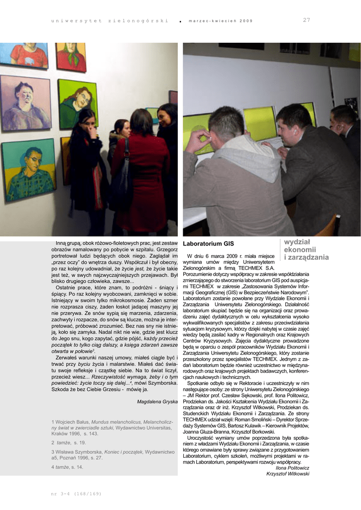 uniwersytet zielonogórski Inną grupą, obok różowo-fioletowych prac, jest zestaw obrazów namalowany po pobycie w szpitalu. Grzegorz portretował ludzi będących obok niego. Zaglądał im „przez oczy” do wnętrza duszy. Współczuł i był obecny, po raz kolejny udowadniał, że życie jest, że życie takie jest też, w swych najzwyczajniejszych przejawach. Był blisko drugiego człowieka, zawsze... Ostatnie prace, które znam, to podróżni - śniący i śpiący. Po raz kolejny wyobcowani, zamknięci w sobie. Istniejący w swoim tylko mikrokosmosie. Żaden szmer nie rozprasza ciszy, żaden łoskot jadącej maszyny jej nie przerywa. Ze snów sypią się marzenia, zdarzenia, zachwyty i rozpacze, do snów są klucze, można je interpretować, próbować zrozumieć. Bez nas sny nie istnieją, koło się zamyka. Nadal nikt nie wie, gdzie jest klucz do Jego snu, kogo zapytać, gdzie pójść, każdy przecież początek to tylko ciąg dalszy, a księga zdarzeń zawsze otwarta w połowie3. Zerwałeś warunki naszej umowy, miałeś ciągle być i trwać przy byciu życia i malarstwie. Miałeś dać światu swoje refleksje i cząstkę siebie. Na to świat liczył, przecież wiesz... Rzeczywistość wymaga, żeby i o tym powiedzieć: życie toczy się dalej...4, mówi Szymborska. Szkoda że bez Ciebie Grzesiu - mówię ja. Magdalena Gryska 1 Wojciech Bałus, Mundus melancholicus, Melancholiczny świat w zwierciadle sztuki, Wydawnictwo Universitas, Kraków 1996, s. 143. 2 tamże, s. 19. 3 Wisława Szymborska, Koniec i początek, Wydawnictwo a5, Poznań 1996, s. 27. 4 tamże, s. 14. nr 3-4 (168/169) marzec-kwiecień Laboratorium GIS 2009 27 wydział ekonomii i zarządzania W dniu 6 marca 2009 r. miała miejsce wymiana umów między Uniwersytetem Zielonogórskim a firmą TECHMEX S.A. Porozumienie dotyczy współpracy w zakresie współdziałania zmierzającego do stworzenia laboratorium GIS pod auspicjami TECHMEX w zakresie „Zastosowania Systemów Informacji Geograficznej (GIS) w Bezpieczeństwie Narodowym”. Laboratorium zostanie powołane przy Wydziale Ekonomii i Zarządzania Uniwersytetu Zielonogórskiego. Działalność laboratorium skupiać będzie się na organizacji oraz prowadzeniu zajęć dydaktycznych w celu wykształcenia wysoko wykwalifikowanych specjalistów z zakresu przeciwdziałania sytuacjom kryzysowym, którzy dzięki nabytej w czasie zajęć wiedzy będą zasilać kadry w Regionalnych oraz Krajowych Centrów Kryzysowych. Zajęcia dydaktyczne prowadzone będą w oparciu o zespół pracowników Wydziału Ekonomii i Zarządzania Uniwersytetu Zielonogórskiego, który zostanie przeszkolony przez specjalistów TECHMEX. Jednym z zadań laboratorium będzie również uczestnictwo w międzynarodowych oraz krajowych projektach badawczych, konferencjach naukowych i technicznych. Spotkanie odbyło się w Rektoracie i uczestniczyły w nim następujące osoby: ze strony Uniwersytetu Zielonogórskiego – JM Rektor prof. Czesław Sękowski, prof. Ilona Politowicz, Prodziekan ds. Jakości Kształcenia Wydziału Ekonomii i Zarządzania oraz dr inż. Krzysztof Witkowski, Prodziekan ds. Studenckich Wydziału Ekonomii i Zarządzania. Ze strony TECHMEX udział wzięli: Roman Smoliński – Dyrektor Sprzedaży Systemów GIS, Bartosz Kulawik – Kierownik Projektów, Joanna Gluza-Branna, Krzysztof Borkowski. Uroczystość wymiany umów poprzedzona była spotkaniem z władzami Wydziału Ekonomii i Zarządzania, w czasie którego omawiane były sprawy związane z przygotowaniem Laboratorium, cyklem szkoleń, możliwymi projektami w ramach Laboratorium, perspektywami rozwoju współpracy. Ilona Politowicz Krzysztof Witkowski 28 marzec-kwiecień 2009 Multimedialna wystawa Ona i on 18.03.2009 r. na Wydziale Ekonomii i Zarządzania odbył się wernisaż wystawy grafiki multimedialnej Ona i on Ilony Politowicz i Ewy Antonowicz. Prace zostały wykonane w grafice rastrowej. Do zapamiętania obrazu rastrowego potrzebna jest dwuwymiarowa tablica pikseli nazywana powszechnie bitmapą. Bitmapy są przygotowane dla grafiki nieinterakcyjnej, w której program wczytuje się uprzednio przygotowane dane i na ich podstawie tworzy wynikowy obraz. Grafiki są wynikiem czasu rzeczywistego. Dziś ekran stał się centrum dostępu do danych wszelkiego rodzaju. Można się spierać czy jesteśmy społeczeństwem symulacji czy spektaklu, ale nie ma wątpliwości, że jesteśmy społeczeństwem ekranu. Do tego coraz częściej dochodzi transmisja w czasie rzeczywistym, a technologia Wirtualnej Rzeczywistości obiecuje połączenie stymulacji dwóch – w kulturze Zachodu tradycyjnie przeciwstawnych zmysłów – wzroku i dotyku. W swoich realizacjach inspirujemy się codzienną rzeczywistością. Postrzeganie przestrzeni nie jest wyłącznie biernym doznaniem wzrokowym. To, co widzimy poddajemy analizie myślowej, konfrontujemy z odpowiadającymi im odcinkami rzeczywistości. Wyjaśniamy sens powstałych stąd wzajemnych związków i przyczyn. Odczytywanie sensów i treści postrzeganej przestrzeni będzie, zatem zarówno wynikiem postrzegania jak i kontekstów wpływających na budowę znaczeniowości obrazu. Interesuje nas ciąg przestrzeni funkcjonującej na styku nieistniejących fizycznie a tworzących się dzięki procesom intraindywidualnym i emocjonalnym, co możemy nazywać stycznością przestrzeni. Nasze rozważania dotyczą przestrzeni niematerialnej przestrzeni impulsów wirtualnych, która kreuje zjawiska wizualne w czasoprzestrzeni i odkrywa to co materialne. Rozważania o przestrzeniach tworzących się w świadomości przestrzeni własnej, odnosimy do przestrzeni multimediów, przestrzeni wirtualnej, cyber punktu, bytu przestrzeni interakcyjnej i możliwości komunikacji. Ludzie wyewoluowali w taki sposób, że jesteśmy odseparowani jeden od drugiego i zmagamy się, wysilamy, aby dotrzeć do siebie. Nasze możliwości dotarcia do uniwersytet zielonogórski duszy drugiego człowieka składają się z