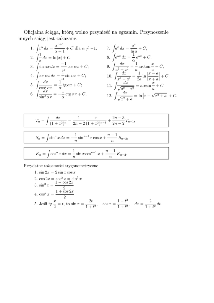 Oficjalna ściąga, którą wolno przynieść na egzamin. Przynoszenie innych ściąg jest zakazane. 1. 2. 3. 4. 5. 6. xα+1 xα dx = + C dla α 6= −1; α+1 Z 1 dx = ln |x| + C; Zx −1 sin αx dx = cos αx + C; α Z 1 cos αx dx = sin αx + C; α Z 1 dx = tg αx + C; 2 α Z cos αx dx 1 = − ctg αx + C; 2 α sin αx Z ax + C; ln a Z 1 8. eαx dx = eαx + C; α Z dx 1 x 9. = arctan + C; 2 2 a a Za + x x − a 1 dx + C; 10. = ln 2 2 2a x + a Z x −a dx x 11. √ 2 = arcsin + C; 2 a a −x Z √ dx 12. √ 2 = ln x + x2 + a + C. x +a 7. Z ax dx = Tn = Z dx 1 x 2n − 3 = + Tn−1 , 2 n 2 n−1 (1 + x ) 2n − 2 (1 + x ) 2n − 2 Sn = Z 1 n−1 Sn−2 , sinn x dx = − sinn−1 x cos x + n n Kn = Z cosn x dx = 1 n−1 sin x cosn−1 x + Kn−2 . n n Przydatne tożsamości trygonometryczne 1. sin 2x = 2 sin x cos x 2. cos 2x = cos2 x = sin2 x 1 − cos 2x 3. sin2 x = 2 1 + cos 2x 2 4. cos x = 2 x 2t 5. Jeśli tg = t, to sin x = , 2 1 + t2 cos x = 1 − t2 , 1 + t2 dx = 2 dt. 1 + t2