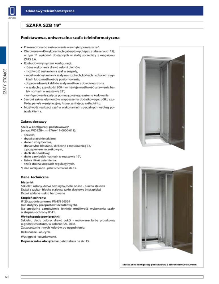 Obudowy teleinformatyczne Szafa SZB 19" SZAFY STOJĄCE Podstawowa, uniwersalna szafa teleinformatyczna • Przeznaczona do zastosowania wewnątrz pomieszczeń. • Oferowana w 40 wykonaniach gabarytowych (patrz tabela na str. 15), w tym 11 wykonań dostępnych w stałej sprzedaży z magazynu ZPAS S.A. • Rozbudowany system konfiguracji: - różne wykonania drzwi, osłon i dachów, - możliwość zestawienia szaf w zespoły, - możliwość ustawiania szafy na stopkach, kółkach i cokołach zwykłych lub z możliwością poziomowania, - doprowadzenie kabli do szafy możliwe z dowolnej strony, - w szafach o szerokości 800 mm istnieje możliwość ustawienia belek nośnych w rozstawie 21", - konfigurowanie szafy za pomocą prostego systemu kodowania. • Szeroki zakres elementów wyposażenia dodatkowego: półki, szuflady, panele wentylacyjne, listwy zasilające, zaślepki itp. • Możliwość realizacji szaf w wykonaniach specjalnych według potrzeb klienta. Zakres dostawy Szafa w konfiguracji podstawowej* (nr kat. WZ-SZB-xxx-17AA-11-0000-011): - - - - - - - - szkielet, drzwi przednie szklane, dwie osłony boczne, drzwi tylne blaszane, skrócone z maskownicą 3 U z przepustem szczotkowym, dach standardowy, dwie pary belek nośnych w rozstawie 19", listwa i linki uziemienia, szafa stoi na stopkach regulacyjnych. *) Inne konfiguracje - patrz schemat na str. 15. Dane techniczne Materiał: Szkielet, osłony, drzwi bez szyby, belki nośne - blacha stalowa Drzwi z szybą - blacha stalowa, szkło akrylowe (metapleks) Drzwi szklane - szkło hartowane Stopień ochrony: IP 20 zgodnie z normą PN-EN 60529 (nie dotyczy przepustów szczotkowych). Na specjalne zamówienie istnieje możliwość wykonania szafy o stopniu ochrony IP 41. Wykończenie powierzchni: Szkielet, dach, osłony, drzwi, cokół - malowane farbą proszkową o grubej strukturze, w kolorze RAL 7035. Zastosowanie innych kolorów po uzgodnieniu. Belki nośne - alucynk. Wysięgniki - ocynkowane. Dopuszczalne obciążenie: patrz tabela na str. 15. Szafa SZB w konfiguracji podstawowej o szerokości 600 i 800 mm 12 Obudowy teleinformatyczne Szafa SZB 19" Szafa SZB 42 U, 600x600 mm w konfiguracji podstawowej Inne wykonania i konfiguracje szaf SZB omawiane są na str. 15-18 4 12 SZAFY STOJĄCE 3 12 6 10 9 8 1 8 7 5 BUDOWA 1. Słup szkieletu 2. Płyta dolna szkieletu 3. Płyta górna szkieletu 4. Dach standardowy 5. Drzwi przednie szklane 6. Drzwi tylne blaszane, skrócone 7. Maskownica o wysokości 3 U z przepustem szczotkowym 8. Osłona boczna blaszana 9. Belka nośna 10. Ceownik 11. Stopka 12. Wyłamywana zaślepka 2 11 13 Obudowy teleinformatyczne Szafa SZB 19" Przekrój D-D 10 Belka nośna n x 44,45 12,7 50 12 380 12 7 Widok z przodu 40 SZAFY STOJĄCE 380 31,75 11 44,45 6,7 Przekrój B-B Widok z przodu Widok z boku 3 B B 32,5 2 49 30 21 24 D D H HU 5 4 C A C 10 A 9 10 11 1 WYSOKOŚĆ PODSTAWY H1 2 H1 Stopki: od 25 do 50 mm Cokół: 100 lub 200 mm Kółka typu 150: 108 mm Kółka typu 300: 129 mm 8 Przekrój A-A Przekrój C-C 6 10 11 L = 600 451 465 L = 800 Maksymalny kąt otwarcia drzwi: 110° 14 GUmax = G – 100 GU regulacja BUDOWA 380 G = 600 lub 800 380 G = 600 lub 800 1. Słup szkieletu szafy 2. Płyta dolna szkieletu 3. Płyta górna szkieletu 4. Drzwi przednie 5. Osłona boczna 6. Drzwi tylne lub osłona tylna 7. Dach 8. Podstawa (cokół, stopki lub kółka) 9. Ceownik 10. Belka nośna 11. Wysięgnik 12. Wyłamywana zaślepka Uwagi: Otwór kablowy, znajdujący się w płycie górnej szafy, jest fabrycznie zakryty przez wyłamywaną zaślepkę (poz. 12). Identyczny otwór kablowy znajduje się w dachu szafy (patrz zdjęcie dachu standardowego na str. 18). Zaślepki do otworów w płycie dolnej i górnej – patrz str. 78-79. Obudowy teleinformatyczne Szafa SZB 19" Tabela wykonań Głębokość całkowita G [mm] 800 600 800 600 800 600 Wysokość użytkowa szafy HU [U = 44,45 mm] Wysokość szkieletu H [mm] Numer wykonania 5 6 9 10 45 U 2096 17 18 21 22 42 U 1963 145 146 147 148 39 U 1830 53 54 57 58 36 U 1696 149 150 151 152 33 U 1563 153 154 155 156 30 U 1430 157 158 159 160 27 U 1296 89 90 93 94 24 U 1163 101 102 105 106 18 U 896 113 114 117 118 15 U 763 Uwaga: - Szafy w wykonaniach zaznaczonych czerwonym kolorem dostępne są w stałej sprzedaży z magazynu ZPAS S.A. (dotyczy szaf o następującej konfiguracji elementów składowych - podstawowa konfiguracja: szkielet, cztery belki nośne, dwie osłony boczne, drzwi przednie szklane, drzwi tylne blaszane - skrócone z maskownicą 3 U z przepustem szczotkowym, dach standardowy, cztery stopki regulacyjne, listwa uziemienia, linki uziemienia drzwi i osłon - nr kat. WZ-SZB-xxx-17AA-11-0000-011). - Termin wykonania pozostałych szaf wg uzgodnienia. Numer katalogowy szafy SZB Numer wykonania określający wymiary gabarytowe szafy (patrz tabela wykonań). Przed numery jednocyfrowe lub dwucyfrowe należy dopisać zera. (Uwaga: Szafy z głębokimi osłonami produkowane są tylko w wykonaniach nr 9, 21 i 147) SZAFY STOJĄCE Szerokość całkowita L [mm] rodzaj dachu: 1 - dach standardowy, 2 - dach z dodatkową perforacją 3 - dach szczelny IP 41 4 - dach z otworem pod zaślepkę Szczegółowy opis dachów - patrz str. 18, 78 WZ-SZB - XXX - XXXX - XX - XXXX - 011 PRZÓD TYŁ LEWY BOK PRAWY BOK rodzaj drzwi lub osłony: 0 - brak drzwi lub osłony 1 - drzwi szklane 2 - drzwi blaszane 3 - drzwi blaszane z perforacją w dolnej części 4 - drzwi blaszane z szybą z metapleksu 5 - drzwi blaszane z szybą z metapleksu i perforacją 7 - drzwi blaszane, skrócone + jedna maskownica 3 U z przepustem szczotkowym 9 - drzwi blaszane, skrócone + dwie maskownice 3 U z przepustem szczotkowym Z - drzwi szklane z bokami metalowymi i zamkiem baskwilowym (tylko jako drzwi przednie lub tylne do szaf o wysokości powyżej 18 U) A - osłona blaszana C - osłona blaszana, skrócona + jedna maskownica 3 U z przepustem szczotkowym E - osłona blaszana, skrócona + dwie maskownice 3 U z przepustem szczotkowym 