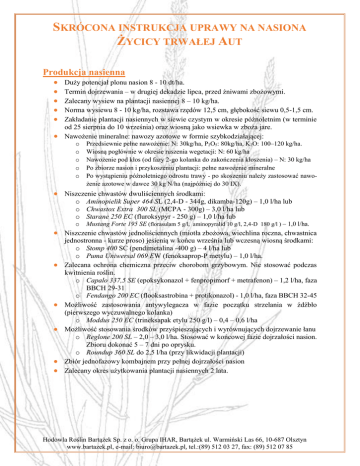 SKRÓCONA INSTRUKCJA UPRAWY NA NASIONA ŻYCICY TRWAŁEJ AUT Produkcja nasienna Duży potencjał plonu nasion 8 - 10 dt/ha. Termin dojrzewania – w drugiej dekadzie lipca, przed żniwami zbożowymi. Zalecany wysiew na plantacji nasiennej 8 – 10 kg/ha. Norma wysiewu 8 - 10 kg/ha, rozstawa rzędów 12,5 cm, głębokość siewu 0,5-1,5 cm. Zakładanie plantacji nasiennych w siewie czystym w okresie późnoletnim (w terminie od 25 sierpnia do 10 września) oraz wiosną jako wsiewka w zboża jare. Nawożenie mineralne: nawozy azotowe w formie szybkodziałającej: o o o o o Przedsiewnie pełne nawożenie: N: 30kg/ha, P2O5: 80kg/ha, K2O: 100–120 kg/ha. Wiosną pogłównie w okresie ruszenia wegetacji: N: 60 kg/ha Nawożenie pod kłos (od fazy 2-go kolanka do zakończenia kłoszenia) – N: 30 kg/ha Po zbiorze nasion i przykoszeniu plantacji: pełne nawożenie mineralne Po wystąpieniu późnoletniego odrostu trawy - po skoszeniu należy zastosować nawożenie azotowe w dawce 30 kg N/ha (najpóźniej do 30 IX). Niszczenie chwastów dwuliściennych środkami: o Aminopielik Super 464 SL (2,4-D - 344g, dikamba-120g) – 1,0 l/ha lub o Chwastox Extra 300 SL (MCPA - 300g) – 3,0 l/ha lub o Starane 250 EC (fluroksypyr - 250 g) – 1,0 l/ha lub o Mustang Forte 195 SE (florasulam 5 g/l, aminopyralid 10 g/l, 2,4-D 180 g/l ) – 1,0 l/ha. Niszczenie chwastów jednoliściennych (miotła zbożowa, wiechlina roczna, chwastnica jednostronna - kurze proso) jesienią w końcu września lub wczesną wiosną środkami: o Stomp 400 SC (pendimetalina -400 g) – 4 l/ha lub o Puma Uniwersal 069 EW (fenoksaprop-P metylu) – 1,0 l/ha. Zalecana ochrona chemiczna przeciw chorobom grzybowym. Nie stosować podczas kwitnienia roślin. o Capalo 337,5 SE (epoksykonazol + fenpropimorf + metrafenon) – 1,2 l/ha, faza BBCH 29-31 o Fendango 200 EC (flooksastrobina + protikonazol) - 1,0 l/ha, faza BBCH 32-45 Możliwość zastosowania antywylegacza w fazie początku strzelania w źdźbło (pierwszego wyczuwalnego kolanka) o Moddus 250 EC (trineksapak etylu 250 g/l) – 0,4 – 0,6 l/ha Możliwość stosowania środków przyśpieszających i wyrównujących dojrzewanie łanu o Reglone 200 SL – 2,0 – 3,0 l/ha. Stosować w końcowej fazie dojrzałości nasion. Zbioru dokonać 5 – 7 dni po oprysku. o Roundup 360 SL do 2,5 l/ha (przy likwidacji plantacji) Zbiór jednofazowy kombajnem przy pełnej dojrzałości nasion Zalecany okres użytkowania plantacji nasiennych 2 lata. Hodowla Roślin Bartążek Sp. z o. o. Grupa IHAR, Bartążek ul. Warmiński Las 66, 10-687 Olsztyn www.bartazek.pl, e-mail: [email protected], tel.:(89) 512 03 27, fax: (89) 512 07 85
