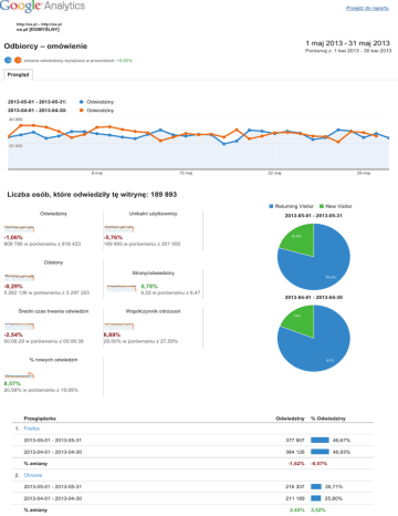Przejdź do raportu http://ox.pl – http://ox.pl ox.pl [DOMYŚLNY] 1 maj 2013 - 31 maj 2013 Odbiorcy – omówienie Porównaj z: 1 kwi 2013 - 30 kwi 2013 zmiana odwiedziny wyrażona w procentach: +0,00% Przegląd 2013-05-01 - 2013-05-31: Odwiedziny 2013-04-01 - 2013-04-30: Odwiedziny 40 000 20 000 8 maj 15 maj 22 maj 29 maj Liczba osób, które odwiedziły tę witrynę: 189 893 Returning Visitor Odwiedziny Unikalni użytkownicy -1,06% -5,76% 809 786 w porównaniu z 818 423 189 893 w porównaniu z 201 500 New Visitor 2013-05-01 - 2013-05-31 20.6% Odsłony Strony/odwiedziny 79.4% -0,29% 0,78% 5 282 136 w porównaniu z 5 297 353 6,52 w porównaniu z 6,47 Średni czas trwania odwiedzin 2013-04-01 - 2013-04-30 Współczynnik odrzuceń 19% -2,54% 6,89% 00:06:29 w porównaniu z 00:06:39 29,50% w porównaniu z 27,59% % nowych odwiedzin 81% 8,57% 20,58% w porównaniu z 18,95% Przeglądarka Odwiedziny % Odwiedziny 1. Firefox 2013-05-01 - 2013-05-31 377 907 46,67% 2013-04-01 - 2013-04-30 384 126 46,93% % zmiany -1,62% -0,57% 2. Chrome 2013-05-01 - 2013-05-31 216 307 26,71% 2013-04-01 - 2013-04-30 211 189 25,80% % zmiany 2,42% 3,52% 3. Internet Explorer 2013-05-01 - 2013-05-31 124 567 15,38% 2013-04-01 - 2013-04-30 130 090 15,90% % zmiany -4,25% -3,22% 4. Opera 2013-05-01 - 2013-05-31 61 763 7,63% 2013-04-01 - 2013-04-30 66 116 8,08% % zmiany -6,58% -5,59% 5. Android Browser 2013-05-01 - 2013-05-31 12 076 1,49% 2013-04-01 - 2013-04-30 10 898 1,33% % zmiany 10,81% 11,99% 6. Safari 2013-05-01 - 2013-05-31 9 733 1,20% 2013-04-01 - 2013-04-30 9 486 1,16% % zmiany 2,60% 3,70% 7. Opera Mini 2013-05-01 - 2013-05-31 2 681 0,33% 2013-04-01 - 2013-04-30 2 678 0,33% % zmiany 0,11% 1,18% 8. Maxthon 2013-05-01 - 2013-05-31 1 726 0,21% 2013-04-01 - 2013-04-30 861 0,11% 100,46% 102,60% 2013-05-01 - 2013-05-31 777 0,10% 2013-04-01 - 2013-04-30 388 0,05% 100,26% 102,39% 2013-05-01 - 2013-05-31 570 0,07% 2013-04-01 - 2013-04-30 601 0,07% % zmiany 9. Nokia Browser % zmiany 10. IE with Chrome Frame % zmiany -5,16% -4,15% wyświetl pełny raport © 2013 Google Przejdź do raportu http://ox.pl – http://ox.pl ox.pl [DOMYŚLNY] 1 maj 2013 - 31 maj 2013 Przegląd źródeł odwiedzin Porównaj z: 1 kwi 2013 - 30 kwi 2013 zmiana odwiedziny wyrażona w procentach: +0,00% Przegląd 2013-05-01 - 2013-05-31: Odwiedziny 2013-04-01 - 2013-04-30: Odwiedziny 40 000 20 000 8 maj 15 maj 22 maj 29 maj Osoby, które odwiedziły tę witrynę: 809 786 Odwiedziny w sieci wyszukiwania Ruch z witryn odsyłających Odwiedziny bezpośrednie Kampanie 2013-05-01 - 2013-05-31 32.5% 42.5% 25.1% 2013-04-01 - 2013-04-30 29.2% 36.1% 34.7% Źródło Odwiedziny % Odwiedziny 1. ox.pl 2013-05-01 - 2013-05-31 56 396 27,76% 2013-04-01 - 2013-04-30 87 175 30,68% % zmiany -35,31% -9,52% 2. facebook.com 2013-05-01 - 2013-05-31 45 369 22,33% 2013-04-01 - 2013-04-30 66 379 23,36% % zmiany -31,65% -4,40% 3. ogloszenia.ox.pl 2013-05-01 - 2013-05-31 23 681 11,66% 2013-04-01 - 2013-04-30 27 964 % zmiany -15,32% 9,84% 18,44% 4. pl.indeed.com 2013-05-01 - 2013-05-31 17 891 8,81% 2013-04-01 - 2013-04-30 21 395 7,53% % zmiany -16,38% 16,96% 5. m.ox.pl 2013-05-01 - 2013-05-31 11 824 5,82% 2013-04-01 - 2013-04-30 15 767 5,55% % zmiany -25,01% 4,89% 6. wiadomosci.ox.pl 2013-05-01 - 2013-05-31 8 886 4,37% 2013-04-01 - 2013-04-30 13 540 4,77% % zmiany -34,37% -8,21% 7. praca.trovit.pl 2013-05-01 - 2013-05-31 6 885 3,39% 2013-04-01 - 2013-04-30 8 213 2,89% % zmiany -16,17% 17,25% 2013-05-01 - 2013-05-31 1 786 0,88% 2013-04-01 - 2013-04-30 1 934 0,68% -7,65% 29,16% 2013-05-01 - 2013-05-31 1 634 0,80% 2013-04-01 - 2013-04-30 379 0,13% 331,13% 503,01% 2013-05-01 - 2013-05-31 1 633 0,80% 2013-04-01 - 2013-04-30 1 586 0,56% 2,96% 44,01% 8. google.pl % zmiany 9. informator.ox.pl % zmiany 10. zebrzydowice.net % zmiany wyświetl pełny raport © 2013 Google
