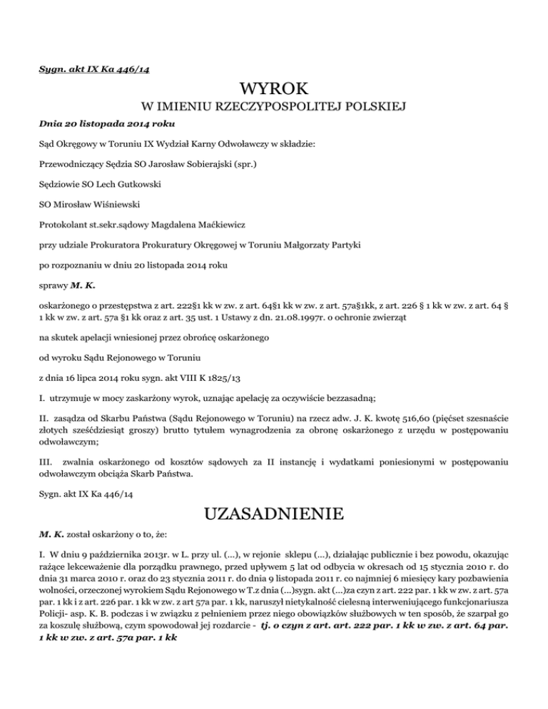 Sygn. akt IX Ka 446/14 WYROK W IMIENIU RZECZYPOSPOLITEJ POLSKIEJ Dnia 20 listopada 2014 roku Sąd Okręgowy w Toruniu IX Wydział Karny Odwoławczy w składzie: Przewodniczący Sędzia SO Jarosław Sobierajski (spr.) Sędziowie SO Lech Gutkowski SO Mirosław Wiśniewski Protokolant st.sekr.sądowy Magdalena Maćkiewicz przy udziale Prokuratora Prokuratury Okręgowej w Toruniu Małgorzaty Partyki po rozpoznaniu w dniu 20 listopada 2014 roku sprawy M. K. oskarżonego o przestępstwa z art. 222§1 kk w zw. z art. 64§1 kk w zw. z art. 57a§1kk, z art. 226 § 1 kk w zw. z art. 64 § 1 kk w zw. z art. 57a §1 kk oraz z art. 35 ust. 1 Ustawy z dn. 21.08.1997r. o ochronie zwierząt na skutek apelacji wniesionej przez obrońcę oskarżonego od wyroku Sądu Rejonowego w Toruniu z dnia 16 lipca 2014 roku sygn. akt VIII K 1825/13 I. utrzymuje w mocy zaskarżony wyrok, uznając apelację za oczywiście bezzasadną; II. zasądza od Skarbu Państwa (Sądu Rejonowego w Toruniu) na rzecz adw. J. K. kwotę 516,60 (pięćset szesnaście złotych sześćdziesiąt groszy) brutto tytułem wynagrodzenia za obronę oskarżonego z urzędu w postępowaniu odwoławczym; III. zwalnia oskarżonego od kosztów sądowych za II instancję i wydatkami poniesionymi w postępowaniu odwoławczym obciąża Skarb Państwa. Sygn. akt IX Ka 446/14 UZASADNIENIE M. K. został oskarżony o to, że: I. W dniu 9 października 2013r. w L. przy ul. (...), w rejonie sklepu (...), działając publicznie i bez powodu, okazując rażące lekceważenie dla porządku prawnego, przed upływem 5 lat od odbycia w okresach od 15 stycznia 2010 r. do dnia 31 marca 2010 r. oraz do 23 stycznia 2011 r. do dnia 9 listopada 2011 r. co najmniej 6 miesięcy kary pozbawienia wolności, orzeczonej wyrokiem Sądu Rejonowego w T.z dnia (...)sygn. akt (...)za czyn z art. 222 par. 1 kk w zw. z art. 57a par. 1 kk i z art. 226 par. 1 kk w zw. z art 57a par. 1 kk, naruszył nietykalność cielesną interweniującego funkcjonariusza Policji- asp. K. B. podczas i w związku z pełnieniem przez niego obowiązków służbowych w ten sposób, że szarpał go za koszulę służbową, czym spowodował jej rozdarcie - tj. o czyn z art. art. 222 par. 1 kk w zw. z art. 64 par. 1 kk w zw. z art. 57a par. 1 kk II. W dniu 9 października 2013r. w L. przy ul. (...), w rejonie sklepu (...), działając publicznie i bez powodu, okazując rażące lekceważenie dla porządku prawnego, działając w warunkach recydywy opisanej w punkcie I, znieważył interweniującego funkcjonariusza Policji- asp. K. B. podczas i w związku z pełnieniem przez niego obowiązków służbowych w ten sposób, że używał wobec niego słów wulgarnych i powszechnie uznanych za obelżywe - tj. o czyn z art. art. 226 par. 1 kk w zw. z art. 64 par. 1 kk w zw. z art. 57a par. 1 kk III. W nieustalonym okresie, co najmniej od kwietnia 2013 roku do 12 października 2013 roku w miejscowości M., przy ul. (...), znęcał się nad czternastoma psami w ten sposób, że poddawał je kilkutygodniowej głodówce, kilkumiesięcznemu niedoborowi pożywienia, utrzymywał w niewłaściwych warunkach bytowania i rażącego niechlujstwa, nie spełniając minimalnych warunków dla godnego bytowania zwierząt, nie stosował profilaktyki w postaci szczepień i odrobaczenia - tj. o czyn z art. 35 ust. 1 Ustawy z dnia 21 sierpnia 1997 r. o ochronie zwierząt Wyrokiem z dnia 16 lipca 2014 r. Sąd Rejonowy w Toruniu, sygn. akt VIII K 1825/13, uznał oskarżonego za winnego: - popełnienia czynów zarzucanych mu w pkt I i II aktu oskarżenia z tym ustaleniem, iż stanowią one jedno przestępstwo z art. 222§1 kk i art. 226 §1 kk w zw. z art. 11§2 kk w zw. z art. 64§1 kk w zw. z art. 57a§1kk i za to, w myśl art. 11§3 kk, na podstawie art. 222§1 kk w zw. z art. 57a§1 kk, wymierzył karę 6 miesięcy pozbawienia wolności - tego, że w okresie od sierpnia 2013 roku do 12 października 2013 roku w miejscowości M. I znęcał się nad 14 psami rasy mieszanej w ten sposób, że nie dostarczał im wystarczającej ilości pożywienia i wody oraz chował w niewłaściwych warunkach bytowych, to jest uznał go za winnego popełnienia występku z art. 35 ust. 1a ustawy z dnia 21 sierpnia 1997 r. o ochronie zwierząt i za to, na podstawie art. 35 ust. 1 a w/w ustawy, wymierzył mu karę 4 miesięcy pozbawienia wolności; na podstawie art. 85 kk i art. 86§1 kk w miejsce w/w kar jednostkowych orzekł karę łączną 8 miesięcy pozbawienia wolności, zaliczając na podstawie art. 63§1 kk, na jej poczet 4 dni zatrzymania w okresach od 9.10.2013 r. do 11.10.2013 r. oraz od 13.10.2013 r. do 15.10.2013 r. Na podstawie art. 35 ust. 3 ustawy z dnia 21 sierpnia 1997 r. o ochronie zwierząt orzekł wobec oskarżonego przepadek 14 psów zabezpieczonych na posesji M. K. w miejscowości M.w dniu 12 października 2013 roku. Na podstawie art. 57a§2 kk orzekł wobec oskarżonego na rzecz pokrzywdzonego K. B. nawiązkę w kwocie 200,00 złotych. Na podstawie art. 230§2 kpk orzekł o zwrocie Miejskiemu Schronisku dla Zwierząt dowodów rzeczowych w postaci kwestionariuszy przyjęcia zwierzęcia do schroniska znajdujących się w aktach sprawy na kartach od 192 do 205. Zasądził od Skarbu Państwa na rzecz Kancelarii Adwokackiej adw. J. K. kwotę 826,56 zł brutto tytułem zwrotu kosztów nieopłaconej pomocy prawnej udzielonej oskarżonemu z urzędu. Zwolnił oskarżonego od kosztów sądowych, wydatkami poniesionymi w sprawie obciążając Skarb Państwa. Wyrok ten zaskarżył w całości obrońca oskarżonego, zarzucając: 1. mające wpływ na treść orzeczenia naruszenie przepisów postępowania, tj. art. 7 kpk w zw. z art. 410 kpk poprzez dowolną i pomijającą okoliczności korzystne dla oskarżonego, ocenę zebranych w sprawie dowodów i odmówienie dania wiary spójnym i logicznym wyjaśnieniom oskarżonego znajdującym potwierdzenie w konsekwentnych zeznaniach jego brata oraz jednoczesne uznanie za wiarygodne depozycji pokrzywdzo