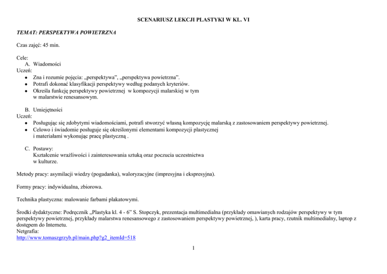 SCENARIUSZ LEKCJI PLASTYKI W KL. VI TEMAT: PERSPEKTYWA POWIETRZNA Czas zajęć: 45 min. Cele: A. Wiadomości Uczeń: Zna i rozumie pojęcia: „perspektywa”, „perspektywa powietrzna”. Potrafi dokonać klasyfikacji perspektywy według podanych kryteriów. Określa funkcję perspektywy powietrznej w kompozycji malarskiej w tym w malarstwie renesansowym. B. Umiejętności Uczeń: Posługując się zdobytymi wiadomościami, potrafi stworzyć własną kompozycję malarską z zastosowaniem perspektywy powietrznej. Celowo i świadomie posługuje się określonymi elementami kompozycji plastycznej i materiałami wykonując pracę plastyczną . C. Postawy: Kształcenie wrażliwości i zainteresowania sztuką oraz poczucia uczestnictwa w kulturze. Metody pracy: asymilacji wiedzy (pogadanka), waloryzacyjne (impresyjna i ekspresyjna). Formy pracy: indywidualna, zbiorowa. Technika plastyczna: malowanie farbami plakatowymi. Środki dydaktyczne: Podręcznik „Plastyka kl. 4 - 6” S. Stopczyk, prezentacja multimedialna (przykłady omawianych rodzajów perspektywy w tym perspektywy powietrznej, przykłady malarstwa renesansowego z zastosowaniem perspektywy powietrznej, ), karta pracy, rzutnik multimedialny, laptop z dostępem do Internetu. Netgrafia: http://www.tomaszgrzyb.pl/main.php?g2_itemId=518 1 Przebieg lekcji: I FAZA WPROWADZAJĄCA 1. Czynności organizacyjno-porządkowe – przygotowanie stanowisk pracy. 2. Podanie i zapis tematu w zeszytach uczniów (slajd) 3. Przedstawienie celów lekcji w języku ucznia (slajd) Na dzisiejszej lekcji: Przypomnisz sobie, co to jest „perspektywa”? Co znaczy pojęcie: „perspektywa powietrzna”? Będziesz potrafi ł/a dokonać podziału perspektywy według podanych kryteriów. Określisz funkcję perspektywy powietrznej w kompozycji malarskiej. Posługując się zdobytymi wiadomościami, stworzysz własną kompozycję malarską z zastosowaniem perspektywy powietrznej. Wykonując pracę plastyczną, wybierzesz określone elementy kompozycji plastycznej i materiały. 4. Nawiązanie do tematu lekcji – rozmowa z uczniami i przypomnienie wiadomości nt. pojęcia „perspektywy”. Przypomnienie poznanych, podstawowych rodzajów perspektywy (pokaz slajdów). II FAZA REALIZACYJNA 1. Określenie tematu lekcji – informacja nt. pojęcia „perspektywy powietrznej” (pokaz reprodukcji z uwzględnieniem perspektywy powietrznej w malarstwie renesansowym). Kiedy w otoczeniu możemy zaobserwować perspektywę powietrzną? 2. Rozdanie karty pracy i wyjaśnienie zadania (praca domowa). 3. Określenie zadania plastycznego uczniów (slajd). Wyjaśnienie zadania plastycznego - zadanie polega na wykonaniu pracy plastycznej – pejzażu z uwzględnieniem perspektywy powietrznej.(inspiracja uczniów poprzez pokaz zdjęć pejzażu z zastosowaniem perspektywy powietrznej: http://www.tomaszgrzyb.pl/main.php?g2_itemId=518). 2 1. Określenie i podanie wymagań wg elementów oceniania kształtującego (NA CO BE ZU) (slajd): Wykonanie pracy malarskiej zgodnie z podanym tematem. Uwzględnienie perspektywy powietrznej w pracy. Uwzględnienie elementów kompozycji plastycznej i właściwych materiałów. Estetyka pracy plastycznej. 4. W celu utrwalenia poznanych wiadomości, uczniowie wykonują indywidualnie ćwiczenie plastyczne. Podczas pracy uczniów, nauczyciel dokonuje stosownej korekty, zastosowanie pozytywnych wzmocnień w postaci pochwał oraz „plusów” III FAZA PODSUMOWUJĄCA 1. Podsumowanie zajęć – prezentacja wyników pracy poszczególnych uczniów (gotowe prace uczniowie wieszają w klasowej galerii).Uczniowie na podstawie podanych kryteriów oceniania recenzują swoje prace, dając sobie wskazówki, jak je poprawić. 2. Podanie pytania kluczowego (slajd): Jakie znaczenie ma w malarstwie perspektywa powietrzna? – sprawdzenie realizacji celów zajęć. 3. Zakończenie lekcji, porządkowanie stanowisk pracy. Opracowała: Małgorzata Oktaba 3 KARTA PRACY Uzupełnij rysunki w dodatkowy element (zastosuj odpowiednią kolorystykę) i dopisz właściwą definicję perspektywy. Perspektywa linearna - Perspektywa kulisowa - Perspektywa malarska - Perspektywa rzędowa - Perspektywa powietrzna - 4