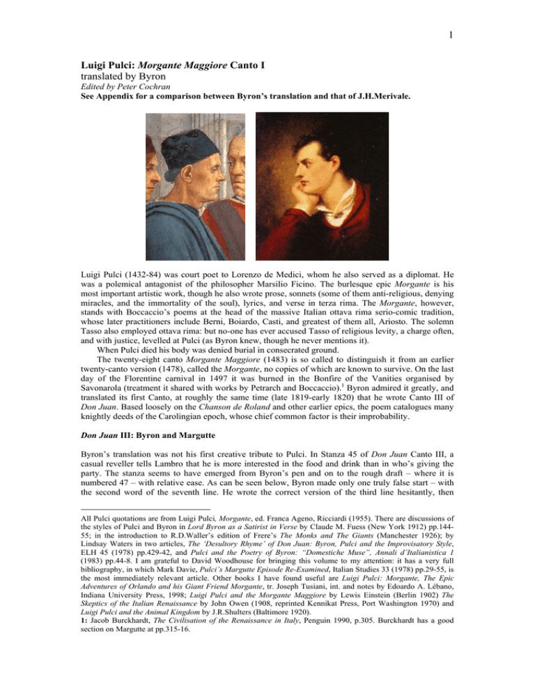 Byron’s translation was not his first creative tribute to Pulci. In Stanza 45 of Don Juan Canto III, a