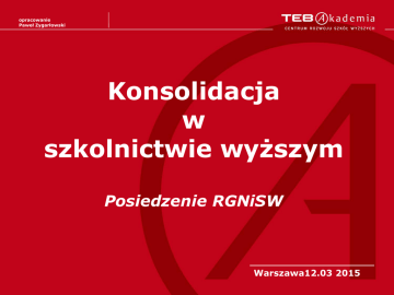 opracowanie 1 | Tytuł Paweł Zygarłowski Konsolidacja w szkolnictwie wyższym Posiedzenie RGNiSW Warszawa12.03 2015 www.teb-akademia.pl 2 | Tytuł Agenda 1. Kluczowe uwarunkowania Przesłanki 2. 3. 4. 5. 6. 7. Formy konsolidacji Przejęcia uczelni Konsolidacja uczelni w Polsce – dane Proces konsolidacji Wnioski Literatura www.teb-akademia.pl 3 | Tytuł Kluczowe uwarunkowania • • • • • • • • Sytuacja demograficzna Umasowienie szkolnictwa wyższego Utworzenie sektora uczelni niepublicznych System prawny System finansowania szkolnictwa wyższego Dywersyfikacja geograficzna podaży Globalna konkurencja uniwersytetów Zmiana postrzegania roli uczelni wyższych • Świątynie wiedzy • Fabryki kapitału ludzkiego (kwalifikacji) i innowacji www.teb-akademia.pl 4 | Tytuł Liczba uczelni w Polsce 500 456 453 325 321 131 132 427 450 400 350 310 301 300 250 213 195 200 150 124 114 106 18 99 115 126 100 50 0 Publiczne Niepubliczne Razem www.teb-akademia.pl 5 | Tytuł Liczba studentów (w tys.) 2500 1953,8 2000 1343,9 1500 1000 660,4 500 0 Publiczne Niepubliczne Razem www.teb-akademia.pl 6 | Tytuł Dynamika liczby studentów (rok do roku) 200,00% 180,24% 180,00% 160,00% 140,00% 115,88% 120,00% 117,71% 100,00% 80,00% Publiczne Niepubliczne Razem www.teb-akademia.pl 7 | Tytuł Dynamika liczby studentów (rok do roku) 115,00% 110,00% 105,00% 100,00% 95,00% 90,00% 85,00% 2000 2001 2002 2003 2004 2005 2006 2007 2008 2009 2010 2011 2012 Publiczne Niepubliczne Razem www.teb-akademia.pl 8 | Tytuł 12,00 Przeciętna wielkość uczelni (w tys. studentów) 10,67 10,00 9,22 8,00 6,00 5,11 3,70 4,00 3,61 2,00 2,42 1,43 0,00 Publiczne Niepubliczne Razem www.teb-akademia.pl 9 | Tytuł Wnioski - - - Czynniki demograficzne oddziałują negatywnie z większą siłą na uczelnie niepubliczne niż na uczelnie publiczne Uczelnie niepubliczne odgrywają rolę „zbiornika wyrównawczego” dostosowującego poziom popytu i podaży usług szkolnictwa wyższego Procesy konsolidacyjne następują wolniej niż spadek liczby studentów spowodowany demografią Przyczyną takiego stanu rzeczy są: - System finansowania uczelni publicznych - Wewnętrzne działania restrukturyzacyjne uczelni - Środki zewnętrzne – programy Unii Europejskiej - Dywersyfikacja źródeł przychodów uczelni - Błędy w zarządzaniu strategicznym www.teb-akademia.pl 10 | Tytuł Koncentracja popytu na studia ? www.teb-akademia.pl 11 | Tytuł Uczelnie publiczne – studenci 1400 35,00% 1200 33,00% 1000 800 30,57% 30,40% 30,46% 30,45% 30,78% 600 31,00% 29,00% 400 374,8 1217,5 379,4 1245,9 384,1 1261,1 385,1 1266,9 387,7 200 1268,4 27,00% 0 25,00% 2008 2009 Studenci 2010 Studenci 10 największych 2011 2012 Udział Top 10 www.teb-akademia.pl 12 | Tytuł Uczelnie niepubliczne – stacjonarne I rok 30 000 53,19% 55,00% 50,61% 25 000 48,97% 50,00% 47,47% 20 000 45,00% 15 000 40,00% 11 093 20 857 11 443 22 608 10 264 21 620 12 006 24 519 35,00% 9 446 5 000 36,38% 25 754 10 000 0 30,00% 2009 2010 I rok ogółem 2011 I rok - 10 największych 2012 2013 Udział Top 10 www.teb-akademia.pl 13 | Tytuł Uczelnie niepubliczne – niestacjonarne I rok 120 000 40,00% 38,00% 100 000 35,14% 32,95% 80 000 36,00% 34,00% 32,00% 60 000 26,54% 28,00% 19 509 55 512 21 478 65 189 22 275 78 820 24 423 26,00% 92 017 27 140 20 000 25,78% 105 255 40 000 30,00% 28,26% 0 24,00% 22,00% 20,00% 2009 2010 I rok ogółem 2011 I rok - 10 największych 2012 2013 Udział Top 10 www.teb-akademia.pl 14 | Tytuł Koncentracja - wnioski • W sektorze uczelni publicznych nie występuje w ostatnich latach zjawisko zwiększania koncentracji popytu w największych uczelniach • W sektorze uczelni niepublicznych w ostatnich latach występuje silna tendencja do koncentracji studentów w największych podmiotach. Występuje ona szczególnie mocno w zakresie studiów stacjonarnych • Zwiększenie skali koncentracji na rynku będzie pozytywnie stymulować procesy konsolidacyjne: - duże podmioty zyskują potencjał do konsolidowania - małe podmioty szybciej tracą zdolność do konkurowania www.teb-akademia.pl 15 | Tytuł Przesłanki konsolidacji systemowe • Presja demograficzna • Reformy systemowe • Zwiększenie efektywności sektora szkolnictwa wyższego (w tym efektywności ekonomicznej) • Reorganizacja sektora szkolnictwa wyższego (np. ujednolicenie: wyższe szkoły zawodowe vs. uniwersytety) www.teb-akademia.pl 16 | Tytuł Przesłanki konsolidacji indywidualne • Podniesienie statusu uczelni (tworzenie „nowych uniwersytetów) • Uniknięcie bankructwa • Ambicje • Optymalizacja kosztów, systemu zarządzania www.teb-akademia.pl 17 | Tytuł Konsolidacja a konkurencyjność • • • • • Pozyskanie unikalnych zasobów Obniżenie siły konkurencji wewnątrzsektorowej Korzyści skali Efekty synergetyczne Warunek konieczny konkurowania globalnego www.teb-akademia.pl 18 | Tytuł Konsolidacja a konkurencyjność uczelni Przykład – fuzja Manchester University 2004 www.teb-akademia.pl 19 | Tytuł Konsolidacja a inne formy współpracy uniwersytetów Kontinuum modeli współpracy jednostek akademickich Współpraca nieformalna Afiliacja KOOPERACJA Konsorcjum Jednostka wspólna KOORDYNACJA Fuzja - struktura federacyjna Fuzja - struktura zunifikowana FUZJA Źródło: Harman G., Harman K., (2003), Institutional Mergers in Higher Education: Lessons from International Experience, w: Tertiary Education and Management, Volume 9, Issue 1, s. 30. www.teb-akademia.pl 20 | Tytuł Konsolidacja - formy • Konsolidacja dobrowolna • Konsolidacja stymulowana systemowo • Konsolidacja przymusowa www.teb-akademia.pl 21 | Tytuł Konsolidacja - formy Ustawowe: • Ustawa szczególna • Połączenie uczelni • Włączenie uczelni (Połączenie przez włączenie – do 2014 – uczelnie niepubliczne - NP) • Włączenie kolegium (językowego, nauczycielskiego) • Związek uczelni Nieopisane w ustawie: • Zakup spółki założycielskiej (NP) • Prywatny system uniwersyteck