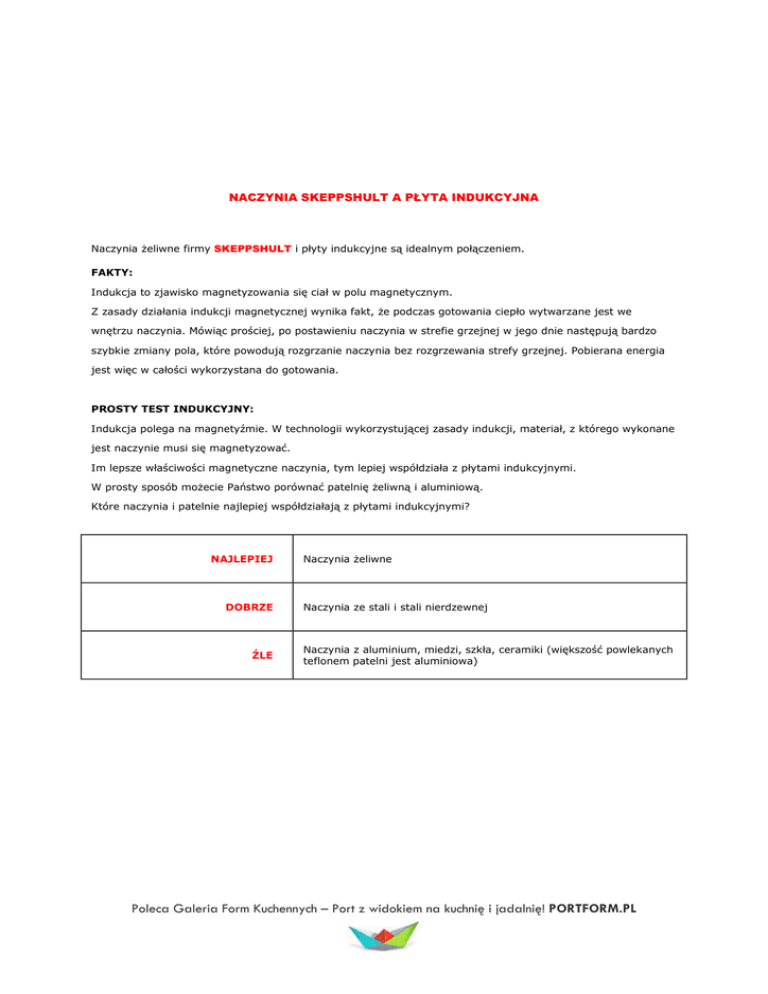 NACZYNIA SKEPPSHULT A PŁYTA INDUKCYJNA Naczynia Ŝeliwne firmy SKEPPSHULT i płyty indukcyjne są idealnym połączeniem. FAKTY: Indukcja to zjawisko magnetyzowania się ciał w polu magnetycznym. Z zasady działania indukcji magnetycznej wynika fakt, Ŝe podczas gotowania ciepło wytwarzane jest we wnętrzu naczynia. Mówiąc prościej, po postawieniu naczynia w strefie grzejnej w jego dnie następują bardzo szybkie zmiany pola, które powodują rozgrzanie naczynia bez rozgrzewania strefy grzejnej. Pobierana energia jest więc w całości wykorzystana do gotowania. PROSTY TEST INDUKCYJNY: Indukcja polega na magnetyźmie. W technologii wykorzystującej zasady indukcji, materiał, z którego wykonane jest naczynie musi się magnetyzować. Im lepsze właściwości magnetyczne naczynia, tym lepiej współdziała z płytami indukcyjnymi. W prosty sposób moŜecie Państwo porównać patelnię Ŝeliwną i aluminiową. Które naczynia i patelnie najlepiej współdziałają z płytami indukcyjnymi? NAJLEPIEJ DOBRZE ŹLE Naczynia Ŝeliwne Naczynia ze stali i stali nierdzewnej Naczynia z aluminium, miedzi, szkła, ceramiki (większość powlekanych teflonem patelni jest aluminiowa) Poleca Galeria Form Kuchennych – Port z widokiem na kuchnię i jadalnię! PORTFORM.PL