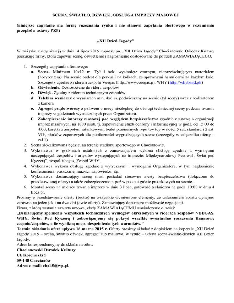 SCENA, ŚWIATŁO, DŹWIĘK, OBSŁUGA IMPREZY MASOWEJ (niniejsze zapytanie ma formę rozeznania rynku i nie stanowi zapytania ofertowego w rozumieniu przepisów ustawy PZP) „XII Dzień Jagody” W związku z organizacją w dniu 4 lipca 2015 imprezy pn. „XII Dzień Jagody” Chocianowski Ośrodek Kultury poszukuje firmy, która zapewni scenę, oświetlenie i nagłośnienie dostosowane do potrzeb ZAMAWIAJĄCEGO. 1. Szczegóły zapytania ofertowego: a. Scena. Minimum 10x12 m. Tył i boki wysłonięte czarnym, nieprześwitującym materiałem (horyzontem). Na scenie podest dla perkusji na kółkach, ze sprawnymi hamulcami na każdym kole. Szczegóły zgodne z riderem zespołu Veegas (http://www.veegas.p), WHY (http://whyband.pl/) b. Oświetlenie. Dostosowane do rideru zespołów c. Dźwięk. Zgodny z riderem technicznym zespołów d. Telebim sceniczny o wymiarach min. 4x6 m. podwieszany na scenie (tył sceny) wraz z realizatorem z kamerą e. Agregat prądotwórczy z paliwem o mocy niezbędnej do obsługi technicznej sceny podczas trwania imprezy w godzinach wyznaczonych przez Organizatora. f. Zabezpieczenie imprezy masowej pod względem bezpieczeństwa zgodnie z ustawą o organizacji imprez masowych, na 1000 osób, tj. zapewnienie służb ochrony i informacyjnej w godz. od 15:00 do 4:00, karetki z zespołem ratunkowym, toalet przenośnych typu toy toy w ilości 5 szt. standard i 2 szt. VIP, płotków zaporowych dla publiczności wygradzających scenę (szczegóły w załączniku oferty – zał.1) 2. Scena zlokalizowana będzie, na terenie stadionu sportowego w Chocianowie. 3. Wykonawca w godzinach ustalonych z zamawiającym wykona obsługę zgodnie z wymogami następujących zespołów i artystów występujących na imprezie: Międzynarodowy Festiwal „Świat pod Kyczerą”, zespół Veegas, Zespół WHY, 4. Wykonawca wykona obsługę zgodnie z wytycznymi i wymogami Organizatora, w tym nagłośnienie konferansjera, puszczanej muzyki, zapowiedzi, itp. 5. Wykonawca dostarczający scenę musi posiadać stosowne atesty bezpieczeństwa (dołączone do przedstawionej oferty) a także zabezpieczenie p-poż w postaci gaśnic proszkowych na scenie. 6. Montaż sceny na miejscu trwania imprezy w dniu 3 lipca, gotowość techniczna na godz. 10:00 w dniu 4 lipca br. Prosimy o przedstawienie oferty (brutto) na wszystkie wymienione elementy, ze wskazaniem kosztu wynajmu zarówno na jeden jak i na dwa dni (dwie oferty). Zamawiający dopuszcza możliwość negocjacji. Firma, z którą zostanie zawarta umowa, złoży ZAMAWIAJĄCEMU oświadczenie o treści: „Deklarujemy spełnienie wszystkich technicznych wymogów określonych w riderach zespołów VEEGAS, WHY, Świat Pod Kyczerą i zobowiązujemy się pokryć wszelkie ewentualne roszczenia finansowe zespołu/zespołów, o ile wynikną one z niespełnienia tych warunków." Termin składania ofert upływa 16 marca 2015 r. Oferty prosimy składać z dopiskiem na kopercie „XII Dzień Jagody 2015 – scena, światło dźwięk, agregat" lub mailowo, w tytule – Oferta scena-światło-dźwięk XII Dzień Jagody. Adres korespondencyjny do składania ofert: Chocianowski Ośrodek Kultury Ul. Kościuszki 5 59-140 Chocianów Adres e-mail: [email protected]. Zał. 1 Ochrona, zabezpieczenie medyczne. 1.Zakres prac obejmuje usługę: zapewnienie ochrony imprezy masowej „XII Dzień Jagody” oraz zabezpieczenia medycznego (zgodnie z Ustawą o bezpieczeństwie imprez masowych oraz Rozporządzeniem Rady Ministrów z dnia 23 marca 2010 r. w sprawie wymogów, jakie powinni spełniać kierownik do spraw bezpieczeństwa, służby porządkowe, służby informacyjne organizatora imprezy masowej w zakresie wyszkolenia i wyposażenia oraz szczegółowych warunków i sposobów ich działania) organizowanej przez Chocianowski Ośrodek Kultury. 2.Wykonawca winien przedłożyć następujące dokumenty: - koncesję na wykonywanie działalności gospodarczej w zakresie przedmiotowej usługi. - polisę ubezpieczeniową dotyczącą ubezpieczenia odpowiedzialności cywilnej. - aktualny odpis z właściwego rejestru albo aktualne zaświadczenie o wpisie do ewidencji działalności gospodarczej, jeżeli odrębne przepisy wymagają wpisu do rejestru lub zgłoszenia do ewidencji działalności gospodarczej, wystawiony nie wcześniej niż 6 miesięcy przed upływem terminu składania ofert. W przypadku Wykonawcy działającego w ramach spółki cywilnej do oferty należy dołączyć umowę spółki. - wykaz, co najmniej dwóch usług wykonanych w okresie ostatnich trzech lat odpowiadających swoim rodzajem usługom stanowiącym przedmiot zamówienia, z podaniem ich wartości, przedmiotu, dat wykonania i odbiorców oraz załączenie dokumentów potwierdzających, że w/w usługi zostały wykonane należycie - wykaz osób, które będą uczestniczyć w wykonywaniu zamówienia posiadających uprawnienia kierownika ds. bezpieczeństwa imprez masowych, o których mowa w Rozporządzeniu Rady Ministrów z dnia 23 marca 2010 r. w sprawie wymogów, jakie powinni spełniać kierownik do spraw bezpieczeństwa, służby porządkowe i służby informacyjne wraz z informacjami na temat zakresu wykonywanych przez nie czynności. Termin składania ofert – jak w ofercie.