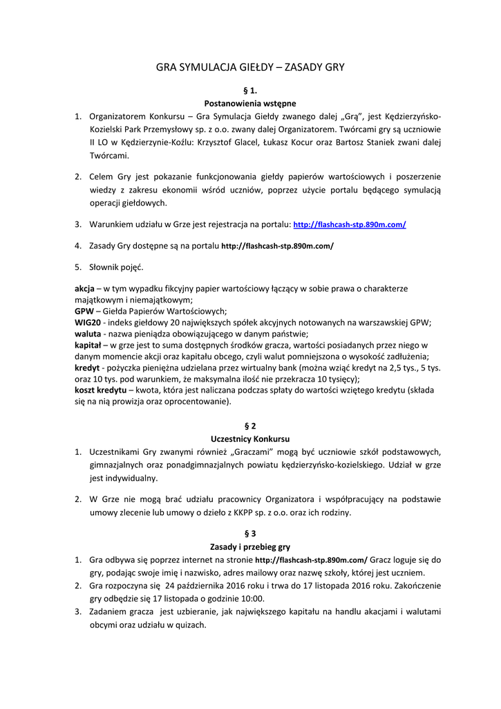 GRA SYMULACJA GIEŁDY – ZASADY GRY § 1. Postanowienia wstępne 1. Organizatorem Konkursu – Gra Symulacja Giełdy zwanego dalej „Grą”, jest KędzierzyoskoKozielski Park Przemysłowy sp. z o.o. zwany dalej Organizatorem. Twórcami gry są uczniowie II LO w Kędzierzynie-Koźlu: Krzysztof Glacel, Łukasz Kocur oraz Bartosz Staniek zwani dalej Twórcami. 2. Celem Gry jest pokazanie funkcjonowania giełdy papierów wartościowych i poszerzenie wiedzy z zakresu ekonomii wśród uczniów, poprzez użycie portalu będącego symulacją operacji giełdowych. 3. Warunkiem udziału w Grze jest rejestracja na portalu: http://flashcash-stp.890m.com/ 4. Zasady Gry dostępne są na portalu http://flashcash-stp.890m.com/ 5. Słownik pojęd. akcja – w tym wypadku fikcyjny papier wartościowy łączący w sobie prawa o charakterze majątkowym i niemajątkowym; GPW – Giełda Papierów Wartościowych; WIG20 - indeks giełdowy 20 największych spółek akcyjnych notowanych na warszawskiej GPW; waluta - nazwa pieniądza obowiązującego w danym paostwie; kapitał – w grze jest to suma dostępnych środków gracza, wartości posiadanych przez niego w danym momencie akcji oraz kapitału obcego, czyli walut pomniejszona o wysokośd zadłużenia; kredyt - pożyczka pieniężna udzielana przez wirtualny bank (można wziąd kredyt na 2,5 tys., 5 tys. oraz 10 tys. pod warunkiem, że maksymalna ilośd nie przekracza 10 tysięcy); koszt kredytu – kwota, która jest naliczana podczas spłaty do wartości wziętego kredytu (składa się na nią prowizja oraz oprocentowanie). §2 Uczestnicy Konkursu 1. Uczestnikami Gry zwanymi również „Graczami” mogą byd uczniowie szkół podstawowych, gimnazjalnych oraz ponadgimnazjalnych powiatu kędzierzyosko-kozielskiego. Udział w grze jest indywidualny. 2. W Grze nie mogą brad udziału pracownicy Organizatora i współpracujący na podstawie umowy zlecenie lub umowy o dzieło z KKPP sp. z o.o. oraz ich rodziny. §3 Zasady i przebieg gry 1. Gra odbywa się poprzez internet na stronie http://flashcash-stp.890m.com/ Gracz loguje się do gry, podając swoje imię i nazwisko, adres mailowy oraz nazwę szkoły, której jest uczniem. 2. Gra rozpoczyna się 24 października 2016 roku i trwa do 17 listopada 2016 roku. Zakooczenie gry odbędzie się 17 listopada o godzinie 10:00. 3. Zadaniem gracza jest uzbieranie, jak największego kapitału na handlu akacjami i walutami obcymi oraz udziału w quizach. 4. Każdy gracz otrzymuje na start 10 tysięcy wirtualnych złotych. Środki te może przeznaczad na zakup akcji 20 największych firm notowao indeksu WIG20 lub zakup walut. 5. Handel akcjami odbywa się na podstawie bieżących kursów akcji , które pobierane są automatycznie ze strony GPW indeksu WIG20. Gracz może kupowad i sprzedawad swoje akcje. Gracz może także zarabiad na handlu (kupno-sprzedaż) czterema walutami obcymi – Euro (EUR), Frank Szwajcarski (CHF), Funt Brytyjski( GBP), Dolar Amerykaoski(USD). 6. Dodatkowe środki finansowe gracz możne zdobyd rozwiązując quizy. Raz w tygodniu (poniedziałek) będzie się pojawiał nowy quiz składający się z 10 pytao. Za każdą poprawną odpowiedź gracz otrzymuje 500 wirtualnych zł. Środki finansowe otrzymuje się za dane pytanie tylko raz. Za rozwiązanie poprawnie całego quizu za pierwszym razem, gracz otrzymuje dodatkowo premię w wysokości 2000 wirtualnych złotych. 7. W trakcie gry gracz ma możliwośd wzięcia kredytu. Łączna suma wszystkich zaciągniętych kredytów nie może przekroczyd 10 tysięcy wirtualnych złotych. Do wyboru są kredyty w wysokości – 2500, 5000, 10 000 wirtualnych złotych. Spłata kredytu może się odbyd dobrowolnie w każdym momencie gry poprzez kliknięcie „Spład kredyt”. W przypadku posiadania przez gracza kredytu na moment zakooczenia gry tj. 17.10 godz. 10.00 jego spłata zostanie dokonana automatycznie. 1. 2. 3. 4. 5. §4 Rozstrzygnięcie Konkursu Zwycięzcy zostaną wyłonieni w 3 kategoriach: szkoła podstawowa, szkoła gimnazjalna, szkoła ponadgimnazjalna. Nagrody zostaną przyznane za zajęcie 3 pierwszych miejsc w każdej kategorii. Zwycięzcami zostaną osoby, które na w moment zakooczenia gry będą posiadad największy kapitał. Na wysokośd kapitału będą się składad: dostępne wolne środki, wartośd posiadanych przez gracza akcji wycenionych na dzieo 17 listopada 2016r. godz. 10:00 , wartośd posiadanych przez gracza walut obcych przeliczonych po kursie z godz. 10:00 w dniu 17 listopada 2016r., środki pozyskane za prawidłowe odpowiedzi w quizach ekonomicznych. Oficjalne ogłoszenie wyników konkursu odbędzie się 18 listopada 2016r podczas Dnia Młodzieży w Miejskim Ośrodku Kultury Chemik w Kędzierzynie-Koźlu. 17 listopada 2016r szkoły, do których uczęszczają zdobywcy I, II, III miejsca we wszystkich kategoriach, zostaną poinformowane o sukcesie swoich uczniów. W przypadku, gdyby nie było możliwości zidentyfikowania zwycięscy (brak nazwiska, brak podanej nazwy szkoły itp.), nagrody otrzymają następne osoby w kolejności w danej kategorii. Organizator konkursu zastrzega sobie prawo do opublikowania imienia i nazwiska zwycięzców oraz nazwy ich szkół oraz umieszczanie tych informacji w materiałach promocyjnych i reklamowych Organizatora. §5 Nagrody 1. Organizator za zdobycie I,II i III miejsca w każdej kategorii otrzymają przyzna zwycięzcom atrakcyjne nagrody. 2. Nagrody zostaną wręczone podczas Dnia Młodzieży 18.11.2016r. w MOK w KędzierzynieKoźlu. 1. 2. 3. 4. 5. 6. 7. §6 Postanowienia końcowe Niniejsze zasady są jedynym i wyłącznym dokumentem określającym warunki i zasady prowadzenia Gry. Organizator Gry zastrzega sobie prawo do zakooczenia Gry bez przyznawania Nagrody. Organizator może wykluczyd gracza z udziału w Grze w przypadku naruszenia przez gracza postanowieo niniejszych zasad. Twórcy nie ponoszą odpowiedzialności za ewentualne problemy techniczne wynikające z zaprzestania działani