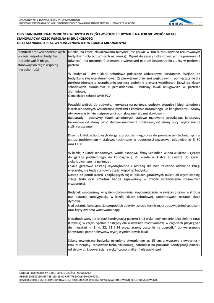 ZAŁĄCZNIK NR 1 DO PROSPEKTU INFORMACYJNEGO BUDYNKU MIESZKALNEGO WIELORODZINNEGO ZLOKALIZOWANEGO PRZY UL. LIPOWEJ 21 W ŁODZI OPIS STANDARDU PRAC WYKOŃCZENIOWYCH W CZĘŚCI WSPÓLNEJ BUDYNKU I NA TERENIE WOKÓŁ NIEGO, STANOWIĄCYM CZĘŚĆ WSPÓLNĄ NIERUCHOMOŚCI ORAZ STANDARDU PRAC WYKOŃCZENIOWYCH W LOKALU MIESZKALNYM Standard prac wykończeniowych w części wspólnej budynku i terenie wokół niego, stanowiącym część wspólną nieruchomości Działka, na której zlokalizowano budynek jest prawie w 100 % zabudowana realizowanym budynkiem (Oprócz płn-zach narożnika). Wjazd do garaży zlokalizowanych na poziomie -1 (piwnica) i na poziomie 0 bramami otwieranymi pilotem bezpośrednio z ulicy w poziomie parteru. W budynku - dwie klatki schodowe połączone zadaszonym korytarzem. Wejście do budynku w ślusarce aluminiowej. Za pierwszymi drzwiami wejściowymi pomieszczenie dla portiera (decyzję o zatrudnieniu portiera podejmie przyszła wspólnota). Drzwi do klatek schodowych aluminiowe z przeszkleniem. Witryny lokali usługowych w parterze aluminiowe. Okna klatek schodowych PCV . Posadzki wejścia do budynku, korytarza na parterze, podesty, stopnice i biegi schodowe klatek schodowych wykończone płytkami z kamienia naturalnego lub konglomeratu. Ściany otynkowane tynkiem gipsowym i pomalowane farbami akrylowymi. Balustrady i pochwyty klatek schodowych stalowe malowane proszkowo. Balustrady balkonowe od strony patio stalowe malowane proszkowo, od strony ulicy wykonane ze stali nierdzewnej. Drzwi z klatek schodowych do garażu podziemnego oraz do pomieszczeń technicznych w garażu podziemnym – stalowe, techniczne w odporności pożarowej odpowiednio EI 30 oraz EI 60. W każdej z klatek schodowych winda osobowa firmy Schindler, Winda w klatce 1 zjeżdża do garażu podziemnego na kondygnację -1, winda w klatce 2 zjeżdża do garażu zlokalizowanego na parterze . Lokale garażowe zostaną wyodrębnione i zostaną dla nich założone oddzielne księgi wieczyste, nie będą stanowiły części wspólnej budynku. Dostęp do pomieszczeń znajdujących się w lokalach garażowych takich jak węzeł cieplny, stacja trafo oraz śmietnik będzie zapewniony w drodze ustanowienia stosownych służebności. Budynek wyposażony w system oddymiania i napowietrzania, w związku z czym w stropie nad ostatnią kondygnacją, w każdej klatce schodowej, zamontowana zostanie klapa dymowa. Nad ostatnią kondygnacją stropodach pokryty izolacją termiczną z odpowiednimi spadkami oraz kryty dwiema warstwami papy. Niezabudowany teren nad kondygnacją parteru (+1) wykonany zostanie jako zielony taras (trawnik) w części ogólnie dostępny dla wszystkich mieszkańców, w częściach przyległych do mieszkań nr 1, 4, 22, 23 i 24 przeznaczony zostanie na „ogródki” do wyłącznego korzystania przez nabywców wyżej wymienionych lokali. Ściany zewnętrzne budynku ocieplone styropianem gr. 15 cm, z wyprawą elewacyjną – tynk mineralny malowany farbą silikonową, natomiast na poziomie kondygnacji parteru od strony ul. Lipowej ściana wykończona płytkami elewacyjnymi UNIBUD I PARTNERZY SP. Z O.O. 90-031 ŁÓDŹ UL. NOWA 6/12 REGON 100352256 NIP 728-265-19-00 KAPITAŁ SPÓŁKI 50 000,00 ZŁ KRS 0000280141 SĄD REJONOWY DLA ŁODZI ŚRÓDMIEŚCIA W ŁODZI XX WYDZIAŁ KRAJOWEGO REJESTRU SĄDOWEGO ZAŁĄCZNIK NR 1 DO PROSPEKTU INFORMACYJNEGO BUDYNKU MIESZKALNEGO WIELORODZINNEGO ZLOKALIZOWANEGO PRZY UL. LIPOWEJ 21 W ŁODZI Budynek podłączony do sieci centralnego ogrzewania DALKIA Łódź SA, sieci energetycznej PGE Dystrybucja SA, miejskiej sieci wodno-kanalizacyjnej ZWiK Sp. z o.o., sieci telewizji kablowej TOYA oraz sieci telefonii stacjonarnej TP S.A. Wykonane zostanie również oprzewodowanie umożliwiające instalację monitoringu. W budynku poprowadzona zostanie instalacja domofonowa oraz oprzewodowanie instalacji umożliwiającej podłączenie do sieci internetowej pod warunkiem wykonania podłączenia do sieci wybranego dostawcy usług internetowych. Budynek nie będzie podłączony do sieci gazu. Standardu prac wykończeniowych lokalu mieszkalnego Lokale mieszkalne wykonane są w stanie deweloperskim do wykończenia przez nabywcę wg własnych upodobań tzn.: na ścianach i sufitach tynki gipsowe, na posadzce - wylewka cementowa, na której wykonać będzie można dowolny rodzaj wykończenia podłogi, posadzka balkonów w formie gładzi cementowej. Drzwi wejściowe do mieszkania antywłamaniowe klasy C. Mieszkanie nie jest wyposażone w drzwi wewnętrzne. Okna zamontowane w mieszkaniu będą oknami 5-komorowymi PCV , od wewnątrz w kolorze białym, od zewnątrz w kolorze 'Złoty dąb' wg wzornika producenta. Parapety wewnętrzne wykonane będą z kamienia naturalnego bądź konglomeratu. W mieszkaniach w wylewce cementowej rozprowadzona będzie instalacja wewnętrzna C.O., wykonana wraz z grzejnikami (typ Purmo, drabinkowe w łazienkach) i opomiarowaniem. Liczniki ciepła w szafkach na klatce schodowej. Instalacja wod-kan wykonana w zakresie podejść z szachtów z wodomierzami (wodomierze w szachcie mieszkaniowym); (nie zaleca się wkuwania rur wod-kan w ściany). Mieszkań nie wyposaża się w urządzenia sanitarne (wanny, brodziki, umywalki, miski ustępowe, zlewozmywaki. baterie itp.). W budynku nie ma instalacji gazowej, technologia kuchni może być wykonana tylko w oparciu o instalację elektryczną (zasilanie 3-fazowe). Instalacja elektryczna w mieszkaniu wykonana wraz z osprzętem tj. z gniazdami, przełącznikami i wyłącznikami. W mieszkaniach nie będą zamontowane kuchenki elektryczne ani inne urządzenia. Nabywca mieszkania zawiera indywidualną umowę . na kupno energii elektrycznej, w tym montaż licznika. W mieszkaniu będzie rozprowadzona instalacja kablowa TV, telefoniczna oraz instalacja umożliwiająca podłączenie do sieci internetowej. Do mieszkania doprowadzona będzie instalacja domofonowa z zamontowaną słuchawką domofonową. UNIBUD I PARTNERZY SP. Z O.O. 90-