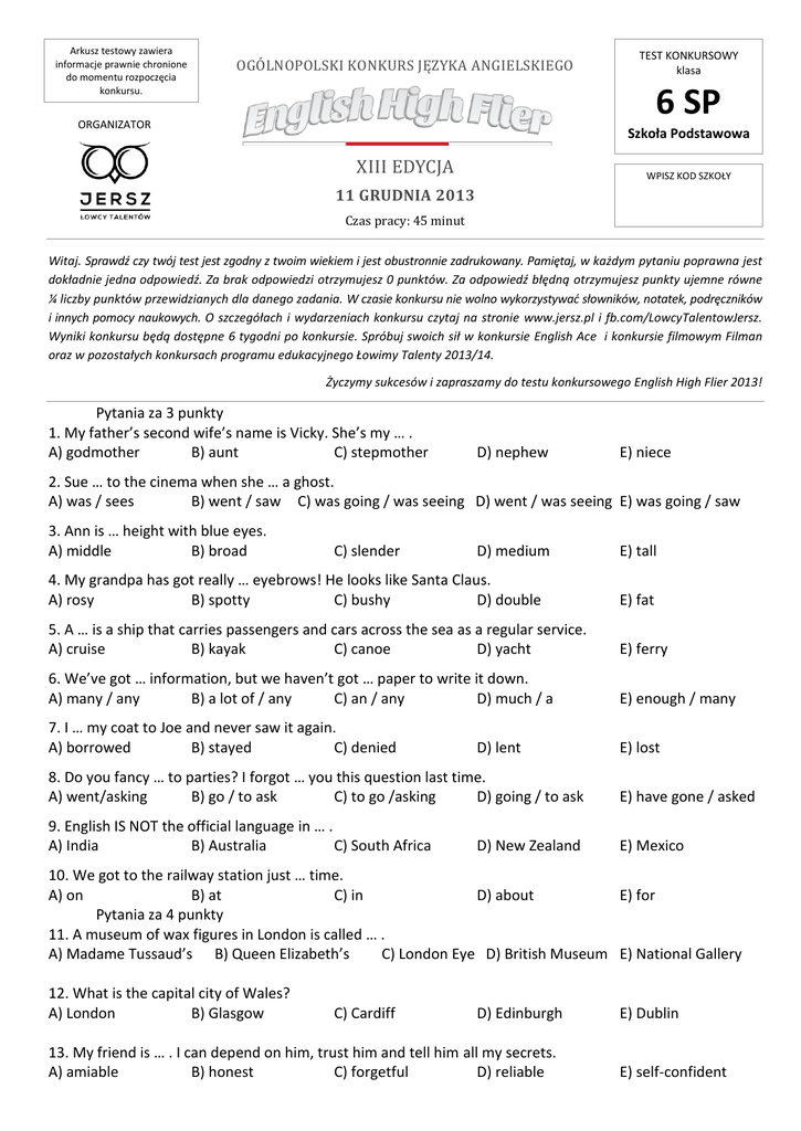 Arkusz testowy zawiera informacje prawnie chronione do momentu rozpoczęcia konkursu. OGÓLNOPOLSKI KONKURS JĘZYKA ANGIELSKIEGO TEST KONKURSOWY klasa 6 SP ORGANIZATOR Szkoła Podstawowa XIII EDYCJA WPISZ KOD SZKOŁY 11 GRUDNIA 2013 Czas pracy: 45 minut Witaj. Sprawdź czy twój test jest zgodny z twoim wiekiem i jest obustronnie zadrukowany. Pamiętaj, w każdym pytaniu poprawna jest dokładnie jedna odpowiedź. Za brak odpowiedzi otrzymujesz 0 punktów. Za odpowiedź błędną otrzymujesz punkty ujemne równe ¼ liczby punktów przewidzianych dla danego zadania. W czasie konkursu nie wolno wykorzystywać słowników, notatek, podręczników i innych pomocy naukowych. O szczegółach i wydarzeniach konkursu czytaj na stronie www.jersz.pl i fb.com/LowcyTalentowJersz. Wyniki konkursu będą dostępne 6 tygodni po konkursie. Spróbuj swoich sił w konkursie English Ace i konkursie filmowym Filman oraz w pozostałych konkursach programu edukacyjnego Łowimy Talenty 2013/14. Życzymy sukcesów i zapraszamy do testu konkursowego English High Flier 2013! Pytania za 3 punkty 1. My father’s second wife’s name is Vicky. She’s my … . A) godmother B) aunt C) stepmother D) nephew E) niece 2. Sue … to the cinema when she … a ghost. A) was / sees B) went / saw C) was going / was seeing D) went / was seeing E) was going / saw 3. Ann is … height with blue eyes. A) middle B) broad C) slender D) medium E) tall 4. My grandpa has got really … eyebrows! He looks like Santa Claus. A) rosy B) spotty C) bushy D) double E) fat 5. A … is a ship that carries passengers and cars across the sea as a regular service. A) cruise B) kayak C) canoe D) yacht E) ferry 6. We’ve got … information, but we haven’t got … paper to write it down. A) many / any B) a lot of / any C) an / any D) much / a E) enough / many 7. I … my coat to Joe and never saw it again. A) borrowed B) stayed C) denied E) lost D) lent 8. Do you fancy … to parties? I forgot … you this question last time. A) went/asking B) go / to ask C) to go /asking D) going / to ask E) have gone / asked 9. English IS NOT the official language in … . A) India B) Australia C) South Africa E) Mexico D) New Zealand 10. We got to the railway station just … time. A) on B) at C) in D) about E) for Pytania za 4 punkty 11. A museum of wax figures in London is called … . A) Madame Tussaud’s B) Queen Elizabeth’s C) London Eye D) British Museum E) National Gallery 12. What is the capital city of Wales? A) London B) Glasgow C) Cardiff D) Edinburgh 13. My friend is … . I can depend on him, trust him and tell him all my secrets. A) amiable B) honest C) forgetful D) reliable E) Dublin E) self-confident 14. It’s very hot in Africa in summer. You … take a jacket. A) have to B) must C) mustn’t D) must to E) don’t have to 15. We … to Krakow five times since we moved to Warsaw. A) had been B) were C) have been D) have spent E) went 16. A man can get a haircut at the … . A) goldsmith’s B) tailor’s D) launderette E) court 17. Sherlock Holmes has got a friend Dr … . A) Jekyll B) Martens C) Pepper D) Watson E) Seuss 18. The bear was … attack Jack, but he ran away. A) going B) will C) will be D) probable E) about to C) barber’s 19. She was offered two million dollars for the job. She …, however. She said she didn’t like it. A) took it away B) put it off C) set it up D) sorted it out E) turned it down 20. Who plays Harry Potter in the Harry Potter film series? A) David Heyman B) Daniel Radcliffe C) Rupert Grint D) J.K. Rowling E) Ron Weasley Pytania za 5 punkty 21. The last time we …. both of us …. new jobs. A) met / have started B) had met / started C) had met / had started D) met / had started E) were meeting / have started 22. Suddenly I … a loud noise. I came closer … the fact that I was really afraid. A) listened / even though B) heard / despite C) hear / in spite D) listened to / despite of E) heard to / although 23. When he heard a … of thunder, Greg's house was … by lightning during the storm. A) flash / strike B) clap / stroke C) bang / stroked D) bolt / striked E) roll / struck 24. Ann … the dream if she … a photo of the same girl on TV a few days later. A) would forget / didn’t see B) might have forgotten / hadn’t seen D) wouldn’t have forgotten / saw E) forgets / will see C) didn’t forget / had seen 25. I’d like to buy … paper. I’ll take The Daily Telegraph. A) any B) a C) an D) --- E) some 26. Fred is a party animal. He … parties every weekend. A) throws B) does C) makes D) takes E) dissolves 27. … was an English writer who was born in India and wrote The Jungle Book. A) William Shakespeare B) Mark Twain C) Rudyard Kipling D) Jane Austen E) Geoffrey Chaucer 28. A small sweet cake eaten at Easter in the UK is called … . A) pudding B) haggis C) custard E) curd D) hot cross bun 29. In 2003 … became the youngest football player to score for England. A) David Beckham B) Wayne Rooney C) Michael Owen D) Ian Wright E) John Terry 30. This band’s song Bohemian Rhapsody was No. 1 in Britain. The band’s name is … . A) Oasis B) the Beatles C) Genesis D) Queen E) Spice Girls PATRONI PARTNERZY © COPYRIGHT BY ŁOWCY TALENTÓW – JERSZ. WILCZYN 2013