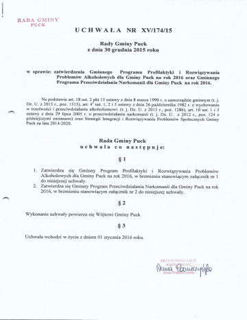 Załącznik nr 1 do Uchwały nr XV/174/15 Rady Gminy Puck z dnia 30 grudnia 2015 roku Gminny Program Profilaktyki i Rozwiązywania Problemów Alkoholowych dla Gminy Puck na rok 2016 I. PODSTAWA PRAWNA 1. Ustawa z dnia 26 października 1982 r. o wychowaniu w trzeźwości i przeciwdziałaniu alkoholizmowi 2. 3. 4. 5. 6. 7. 8. (t. j. Dz. U. z 2015 r., poz. 1286) Ustawa z dnia 29 lipca 2005 r. o przeciwdziałaniu przemocy w rodzinie (Dz. U. z 2015 r., poz. 1390) Ustawa z dnia 9 czerwca 2011 r. o wspieraniu rodziny i systemie pieczy zastępczej (t. j. Dz. U. z 2015 r., poz. 332 z późniejszymi zmianami) Ustawa o samorządzie gminnym z dnia 8 marca 1990 r. (t. j. Dz. U. z 2015 r., poz. 1515) Narodowy Program Profilaktyki i Rozwiązywania Problemów Alkoholowych na lata 2011 – 2015 Wojewódzki Program Profilaktyki i Rozwiązywania Problemów Alkoholowych na lata 2011 - 2015 Program Przeciwdziałania Przemocy w Rodzinie oraz Ochrony Ofiar Przemocy w Rodzinie dla Gminy Puck na lata 2012 - 2018 Strategia Integracji i Rozwiązywania Problemów Społecznych Gminy Puck na lata 2014-2020 II. WSTĘP „Uzależnienie od alkoholu jest chorobą chroniczną, postępującą i potencjalnie śmiertelną. Nie jest możliwe całkowite jej wyleczenie, a jedynie zahamowania narastania jej objawów i szkód zdrowotnych z nią związanych. W świetle nowoczesnej wiedzy uzależnienie od alkoholu jest chorobą wieloczynnikową, bio-psychospołeczną, uszkadzającą funkcjonowanie człowieka w sferze somatycznej, psychologicznej, społecznej i duchowej” (Państwowa Agencja Rozwiązywania Problemów Alkoholowych). Problemy wynikające z picia alkoholu oraz stosowania środków uzależniających stanowią obecnie jedną z ważniejszych kwestii społecznych. Zjawiska te mają bowiem istotny wpływ zarówno na poczucie bezpieczeństwa społecznego, ogólny stan zdrowia Polaków, zdolność do konkurencji na wymagającym rynku pracy, a także na relacje interpersonalne w środowisku rodzinnym. Według Światowej Organizacji Zdrowia, alkohol znajduje się na trzecim miejscu wśród czynników ryzyka dla zdrowia populacji. Większe ryzyko niesie za sobą palenie tytoniu i nadciśnienie tętnicze. Ponad 60 rodzajów chorób i urazów ma związek ze spożywaniem alkoholu. Szkody wynikające z jego nadużywania występują w bardzo różnych obszarach polskiej rzeczywistości. Nie można ich uniknąć, ale można zmniejszyć ich rozmiary i dotkliwość. Picie alkoholu w dalszym ciągu postrzegane jest jako swoisty sposób na życie, na rozwiązywanie problemów. Należy stwierdzić, że alkohol we wszystkich jego postaciach jest łatwo dostępny i nie ma problemu z jego nabyciem. Istotny jest również fakt nasilania się zjawiska systematycznego picia oraz zwiększenia picia wśród młodzieży, jak również ścisły związek między wczesną inicjacją alkoholową a spożywaniem dużych ilości alkoholu, zażywania narkotyków i przestępczością. Używanie alkoholu jest istotnym czynnikiem ryzyka wystąpienia przemocy w rodzinie. Zależność pomiędzy stanem nietrzeźwości sprawcy a stosowaniem przez niego agresywnych zachowań podkreślają członkowie rodzin, w których dochodzi do przemocy. Problem uzależnienia od alkoholu jest znaczący zarówno w skali kraju, jak również w wymiarze lokalnym i regionalnym. Dlatego też, obowiązek podejmowania działań w zakresie profilaktyki i rozwiązywania problemów alkoholowych należy do zadań własnych Gminy. III. SKALA PROBLEMU Według wyliczeń Państwowej Agencji Rozwiązywania Problemów Alkoholowych, problem uzależnienia dotyczy ok. 2% mieszkańców Polski. 4% Polaków to dorośli żyjący w otoczeniu alkoholika. Identyczny odsetek dzieci wychowuje się w rodzinach alkoholików. 5% populacji kraju to osoby pijące szkodliwe, zaś ok. 66% członków rodzin alkoholików (zarówno dorosłych jak i dzieci) staje się ofiarami przemocy domowej. Zmniejszając skalę do poziomu Gminy, otrzymujemy następujące liczby: Gmina Puck 24 tys. mieszkańców Liczba osób uzależnionych od alkoholu ok. 2% populacji 480 Dorośli żyjący w otoczeniu alkoholika (współmałżonkowie, rodzice) ok. 4% populacji 960 Dzieci wychowujące się w rodzinach alkoholików ok. 4% populacji 960 ok. 5-7% populacji 1.200 – 1.680 ok. 66% osób dorosłych oraz ok. 66% dzieci z tych rodzin 1270 Osoby pijące szkodliwie Ofiary przemocy domowej w rodzinach z problemem alkoholowym (Obliczenia na podstawie danych szacunkowych PARPA) Przeprowadzone w 2014 roku, na zlecenie Ministerstwa Pracy i Polityki Społecznej, badania pokazują, że prawie 37% Polaków zna przypadki przemocy wobec kobiet, a w 20% - przemocy wobec mężczyzn. 24,7% respondentów doświadczyło co najmniej jeden z form przemocy (psychicznej, fizycznej, ekonomicznej, seksualnej). Ankietowane osoby dorosłe doznające przemocy w rodzinie stwierdziły, że najczęstszą okolicznością towarzyszącą przemocy jest alkohol. Ponadto z badań wynika, że przemocy fizycznej częściej doświadczają dzieci i młodzież, których rodzice nadużywają alkohol. Pod koniec roku 2013, Studio Diagnozy i Profilaktyki z Krakowa przeprowadziło badania diagnostyczne zagrożeń społecznych na terenie Gminy Puck. Na podstawie tej diagnozy powstała Strategia Rozwiązywania Problemów Społecznych Gminy Puck na lata 2014 - 2020, która jest również podstawą do określenia głównych kierunków działań w ramach lokalnego Programu Profilaktyki i Rozwiązywania Problemów Alkoholowych Gminy Puck na rok 2015. W badaniu osób dorosłych uwzględnione zostały takie obszary jak bezrobocie i wykluczenie społeczne, spożywanie alkoholu i zagrożenia z tym związane, używanie narkotyków, przemoc domowa czy hazard. W badaniu młodych mieszkańców uwzględnione zostały takie obszary jak spożywanie alkoholu, palenie tytoniu, używanie narkotyków oraz dopalaczy, przemoc rówieśnicza oraz domowa, hazard oraz inne ryzykowne zachowania. Badaniem zos