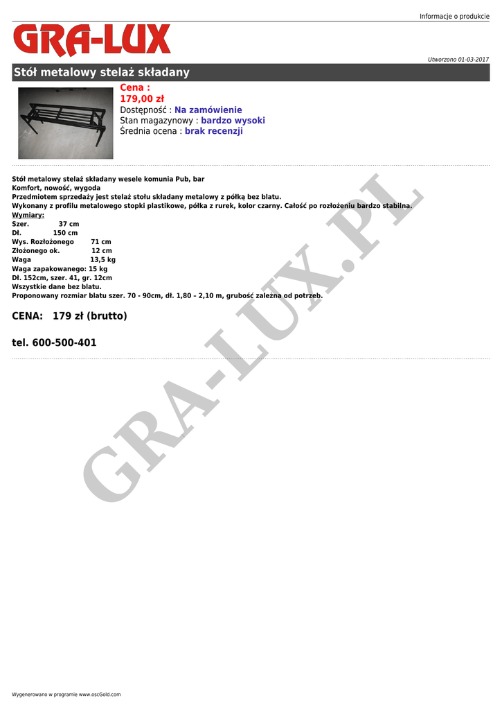 Informacje o produkcie Utworzono 01-03-2017 Stół metalowy stelaż składany Cena : 179,00 zł Dostępność : Na zamówienie Stan magazynowy : bardzo wysoki Średnia ocena : brak recenzji CENA: 179 zł (brutto) G R A- tel. 600-500-401 LU X. PL Stół metalowy stelaż składany wesele komunia Pub, bar Komfort, nowość, wygoda Przedmiotem sprzedaży jest stelaż stołu składany metalowy z półką bez blatu. Wykonany z profilu metalowego stopki plastikowe, półka z rurek, kolor czarny. Całość po rozłożeniu bardzo stabilna. Wymiary: Szer. 37 cm Dł. 150 cm Wys. Rozłożonego 71 cm Złożonego ok. 12 cm Waga 13,5 kg Waga zapakowanego: 15 kg Dł. 152cm, szer. 41, gr. 12cm Wszystkie dane bez blatu. Proponowany rozmiar blatu szer. 70 - 90cm, dł. 1,80 – 2,10 m, grubość zależna od potrzeb. Wygenerowano w programie www.oscGold.com