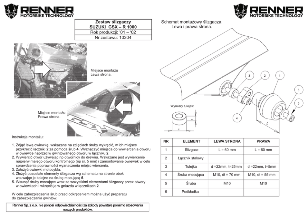 Zestaw œlizgaczy SUZUKI GSX – R 1000 Rok produkcji: ’01 – ‘02 Nr zestawu: 10304 Schemat monta¿owy œlizgacza. Lewa i prawa strona. Miejsce monta¿u Lewa strona. 3 2 1 6 5 Wymiary tulejek: Miejsce monta¿u Prawa strona. t 4 L d Instrukcja monta¿u: 1. Zdj¹æ lew¹ owiewkê, wskazane na zdjêciach œruby wykrêciæ, w ich miejsce przykrêciæ ³¹czniki 2 za pomoc¹ œrub 4. Wyznaczyæ miejsca do wywiercenia otworu w owiewce naprzeciw gwintowanego otworu w ³¹czniku 2. 2. Wywierciæ otwór u¿ywaj¹c np otwornicy do drewna. Wskazane jest wywiercenie najpierw ma³ego otworu kontrolnego (np œr. 5 mm) i zamontowanie owiewek w celu sprawdzenia poprawnoœci wyznaczenia miejsc wiercenia. 3. Za³o¿yæ owiewki motocykla. 4. Z³o¿yæ pozosta³e elementy œlizgacza wg schematu na stronie obok wsuwaj¹c je kolejno na œrubê mocuj¹c¹ 5. 5. Wsun¹æ œruby mocuj¹ce wraz ze wszystkimi elementami œlizgaczy przez otwory w owiewkach i wkrêciæ je w gniazda w ³¹cznikach 2. W celu zabezpieczenia œrub przed odkrêceniem mo¿na u¿yæ preparatu do zabezpieczania gwintów. Renner Sp. z o.o. nie ponosi odpowiedzialnoœci za szkody powsta³e pomimo stosowania naszych produktów. NR ELEMENT LEWA STRONA PRAWA 1 Œlizgacz L = 60 mm L = 60 mm 2 £¹cznik stalowy 3 Tulejka d =22mm, t=25mm d =22mm, t=5mm 4 Œruba mocuj¹ca M10, d³ = 70 mm M10, d³ = 55 mm 5 Œruba M10 6 Podk³adka M10