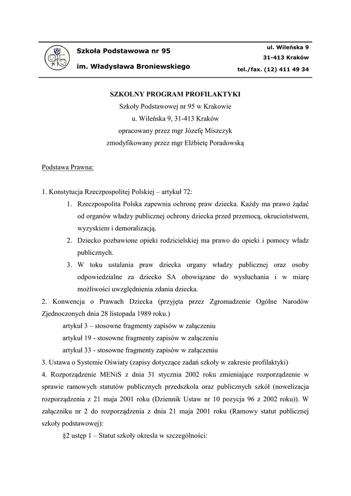 ul. Wileńska 9 Szkoła Podstawowa nr 95 im. Władysława Broniewskiego 31-413 Kraków tel./fax. (12) 411 49 34 SZKOLNY PROGRAM PROFILAKTYKI Szkoły Podstawowej nr 95 w Krakowie u. Wileńska 9, 31-413 Kraków opracowany przez mgr Józefę Miszczyk zmodyfikowany przez mgr Elżbietę Poradowską Podstawa Prawna: 1. Konstytucja Rzeczpospolitej Polskiej – artykuł 72: 1. Rzeczpospolita Polska zapewnia ochronę praw dziecka. Każdy ma prawo żądać od organów władzy publicznej ochrony dziecka przed przemocą, okrucieństwem, wyzyskiem i demoralizacją. 2. Dziecko pozbawione opieki rodzicielskiej ma prawo do opieki i pomocy władz publicznych. 3. W toku ustalania praw dziecka organy władzy publicznej oraz osoby odpowiedzialne za dziecko SA obowiązane do wysłuchania i w miarę możliwości uwzględnienia zdania dziecka. 2. Konwencja o Prawach Dziecka (przyjęta przez Zgromadzenie Ogólne Narodów Zjednoczonych dnia 28 listopada 1989 roku.) artykuł 3 – stosowne fragmenty zapisów w załączeniu artykuł 19 - stosowne fragmenty zapisów w załączeniu artykuł 33 - stosowne fragmenty zapisów w załączeniu 3. Ustawa o Systemie Oświaty (zapisy dotyczące zadań szkoły w zakresie profilaktyki) 4. Rozporządzenie MENiS z dnia 31 stycznia 2002 roku zmieniające rozporządzenie w sprawie ramowych statutów publicznych przedszkola oraz publicznych szkół (nowelizacja rozporządzenia z 21 maja 2001 roku (Dziennik Ustaw nr 10 pozycja 96 z 2002 roku)). W załączniku nr 2 do rozporządzenia z dnia 21 maja 2001 roku (Ramowy statut publicznej szkoły podstawowej): §2 ustęp 1 – Statut szkoły okresla w szczególności: 1. cele i zadania szkoły wynikające z przepisów prawa oraz uwzględniające program wychowawczy szkoły i program profilaktyki dostosowany do potrzeb rozwojowych uczniów oraz potrzeb danego środowiska, o którym mowa w odrębnych przepisach. 9. Ustawa z dnia 26 października 1982 roku o wychowaniu w trzeźwości i przeciwdziałaniu alkoholizmowi (Dziennik Ustaw z 2007 roku nr 70 pozycja 473) 10 Ustawa z dnia 26 października 1982 roku o postępowaniu w sprawach nieletnich (Dziennik Ustaw w 2002 roku nr 11 pozycja 109 wraz z późniejszymi zmianami) Program profilaktyczny, który został opracowany w Szkole Podstawowej nr 95 w Krakowie, stanowi integralna część „Programu Wychowawczego” placówki. Powstał w wyniku diagnozy środowiska lokalnego, zgodnie z programem wychowawczym szkoły i aktami prawa oświatowego. Głównymi założeniami jest kreowanie zdrowego stylu życia, zapobieganie zachowaniom agresywnym, profilaktyka uzależnień oraz szeroko rozumiana edukacja niezbędna do kształtowania właściwych postaw i zachowań. Zamierzone działania wychowawcze i profilaktyczne obejmują: 1) Budowanie obrazu własnej osoby na podstawie rzetelnej samooceny 2) Wychowanie dziecka do samo rozwoju i odpowiedzialności z własne życie 3) Kształtowanie umiejętności współistnienia i współdziałania w grupie klasowej i szkolnej 4) Dostarczenie dzieciom wiedzy na temat prawa dziecka i sposobów radzenia sobie w sytuacjach, gdy są one łamane 5) Wypracowanie akceptowanych przez środowisko szkolne sposobów radzenia sobie w sytuacjach trudnych 6) Wprowadzenie dziecka w życie społeczności lokalnej przez udział w pracach Małego Samorządu i Samorządu Szkolnego 7) Uczenie dbałości o zdrowie, a w szczególności tworzenie systemu wartości i postaw sprzyjających ograniczaniu kontaktu dziecka z substancjami szkodliwymi 8) Rozbudzanie uczuć patriotycznych 9) Budzenie w dziecku poczucia odpowiedzialności za losy otaczającego je świata. Na podstawie: a) Występowania w środowisku szkolnym zagrożeń z uwzględnieniem ich rozwoju, nasilenia i specyfiki b) Tematyki działań profilaktycznych Stwierdzono, że środowisko szkolne wymaga prowadzenia profilaktyki pierwszorzędowej. Cechy programu: a) Jest adekwatny – uwzględnia rzeczywiste problemy i realne zagrożenia b) Jest dostosowany do potrzeb i problemów dzieci w szkole c) Jest skuteczny (dostarcza rzetelnej wiedzy, atrakcyjnych form i metod pracy) d) Daje poczucie bezpieczeństwa (ochronę prywatności, poszanowanie godności uczniów) e) Zakłada kontynuację oddziaływań profilaktycznych na poszczególnych etapach edukacyjnych Zadania szczegółowe: Przeprowadzenie ankiet wśród rodziców dotyczącej ich oczekiwań względem szkoły (klasy I-VI) (wychowawcy klas) Prowadzenie działań diagnozujących stan zagrożenia nikotynizmem, alkoholizmem, narkomanią, zachowaniami agresywno-przemocowymi wśród uczniów klas VI (wychowawcy klas, pedagog szkolny, psycholog szkolny) Stała analiza i diagnoza problemów w poszczególnych klasach, omawianie problemów na zebraniach Zespołów Wychowawców Klasowych, przedstawienie wyników na zebraniach Rady Pedagogicznej przez wychowawców klas, pedagoga szkoły (pedagog szkolny, psycholog szkolny) oraz dyrektora szkoły. Prowadzenie działań profilaktycznych w klasach w oparciu o program „Spójrz inaczej”, „Saper”, pakiet edukacyjny „Moje zdrowie” i inne materiały oraz programy profilaktyczne. Udział uczniów w warsztatach i zajęciach profilaktycznych – edukatorzy zewnętrzni, psycholog szkolny, wychowawca, Liderzy Zdrowia, pielęgniarka szkolna. Sporządzanie listy uczniów z rodzin dysfunkcyjnych, którzy wymagają zapewnienia dodatkowej pomocy w nauce. Prowadzenie pogadanek oraz organizowanie i udział w konkursach z zakresu zasad dobrego wychowania (Samorząd Szkolny, Mały Samorząd, biblioteka, świetlica szkolna). Promowanie zdrowego stylu życia: aktywność turystyczna, sport, koła zainteresowań, edukacja ekologiczna. Podejmowanie działań promujących zdrowe odżywianie. Zorganizowanie prelekcji dla rodziców NT. zagrożeń (pedagog szkolny, psycholog szkolny) Zakup do biblioteki szkolnej odpowiedniej literatury fachowej, czasopism, kaset, nowości tematyczne, artykuły, programy profilaktyczne (lekcje wychowawcze w klasach IV-VI)