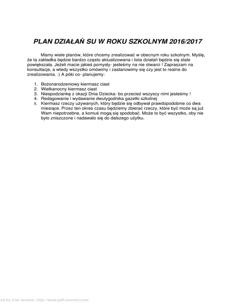 PLAN DZIAŁAŃ SU W ROKU SZKOLNYM 2016/2017 Mamy wiele planów, które chcemy zrealizować w obecnym roku szkolnym. Myślę, że ta zakładka będzie bardzo często aktualizowana i lista działań będzie się stale powiększała. Jeżeli macie jakieś pomysły- jesteśmy na nie otwarci ! Zapraszam na konsultacje, a wtedy wszystko omówimy i zastanowimy się czy jest to realne do zrealizowania. :) A póki co- planujemy: 1. 2. 3. 4. Bożonarodzeniowy kiermasz ciast Wielkanocny kiermasz ciast Niespodziankę z okazji Dnia Dziecka- bo przecież wszyscy nimi jesteśmy ! Redagowanie i wydawanie dwutygodnika gazetki szkolnej 5. Kiermasz rzeczy używanych, który będzie się odbywał prawdopodobnie co dwa miesiące. Przez ten okres czasu będziemy zbierać rzeczy, które być może są już Wam niepotrzebne, a komuś mogą się spodobać. Może to być wszystko, oby nie było zniszczone i nadawało się do dalszego użytku. ted by trial version, http://www.pdf-convert.com