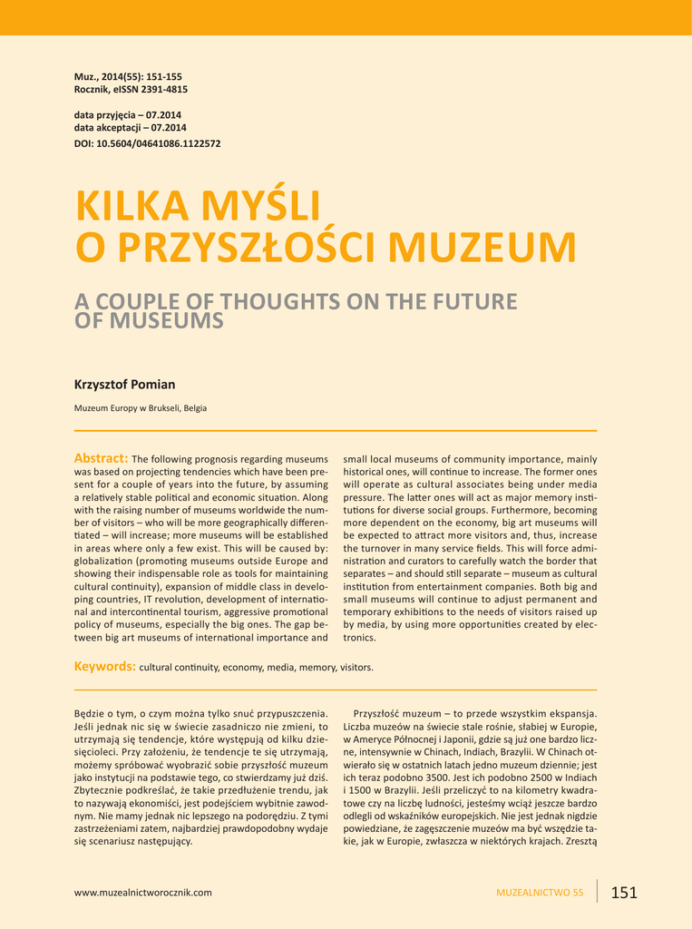 muzea a nauka Muz., 2014(55): 151-155 Rocznik, eISSN 2391-4815 data przyjęcia – 07.2014 data akceptacji – 07.2014 DOI: 10.5604/04641086.1122572 KILKA MYŚLI O PRZYSZŁOŚCI MUZEUM A COUPLE OF THOUGHTS ON THE FUTURE OF MUSEUMS Krzysztof Pomian Muzeum Europy w Brukseli, Belgia Abstract: The following prognosis regarding museums was based on projecting tendencies which have been present for a couple of years into the future, by assuming a relatively stable political and economic situation. Along with the raising number of museums worldwide the number of visitors – who will be more geographically differentiated – will increase; more museums will be established in areas where only a few exist. This will be caused by: globalization (promoting museums outside Europe and showing their indispensable role as tools for maintaining cultural continuity), expansion of middle class in developing countries, IT revolution, development of international and intercontinental tourism, aggressive promotional policy of museums, especially the big ones. The gap between big art museums of international importance and small local museums of community importance, mainly historical ones, will continue to increase. The former ones will operate as cultural associates being under media pressure. The latter ones will act as major memory institutions for diverse social groups. Furthermore, becoming more dependent on the economy, big art museums will be expected to attract more visitors and, thus, increase the turnover in many service fields. This will force administration and curators to carefully watch the border that separates – and should still separate – museum as cultural institution from entertainment companies. Both big and small museums will continue to adjust permanent and temporary exhibitions to the needs of visitors raised up by media, by using more opportunities created by electronics. Keywords: cultural continuity, economy, media, memory, visitors. Będzie o tym, o czym można tylko snuć przypuszczenia. Jeśli jednak nic się w świecie zasadniczo nie zmieni, to utrzymają się tendencje, które występują od kilku dziesięcioleci. Przy założeniu, że tendencje te się utrzymają, możemy spróbować wyobrazić sobie przyszłość muzeum jako instytucji na podstawie tego, co stwierdzamy już dziś. Zbytecznie podkreślać, że takie przedłużenie trendu, jak to nazywają ekonomiści, jest podejściem wybitnie zawodnym. Nie mamy jednak nic lepszego na podorędziu. Z tymi zastrzeżeniami zatem, najbardziej prawdopodobny wydaje się scenariusz następujący. www.muzealnictworocznik.com Przyszłość muzeum – to przede wszystkim ekspansja. Liczba muzeów na świecie stale rośnie, słabiej w Europie, w Ameryce Północnej i Japonii, gdzie są już one bardzo liczne, intensywnie w Chinach, Indiach, Brazylii. W Chinach otwierało się w ostatnich latach jedno muzeum dziennie; jest ich teraz podobno 3500. Jest ich podobno 2500 w Indiach i 1500 w Brazylii. Jeśli przeliczyć to na kilometry kwadratowe czy na liczbę ludności, jesteśmy wciąż jeszcze bardzo odlegli od wskaźników europejskich. Nie jest jednak nigdzie powiedziane, że zagęszczenie muzeów ma być wszędzie takie, jak w Europie, zwłaszcza w niektórych krajach. Zresztą MUZEALNICTWO 55 151 można przypuszczać, że kiedy w Chinach, Indiach i Brazylii tempo wzrostu ulegnie spowolnieniu, sztafetę przejmą kraje islamskie i Afryka na południe od Sahary. I tu, i tam muzea są niemal nieobecne. I tu, i tam wzrost liczby muzeów zależy jednak przede wszystkim od przemian kulturowych i gospodarczych, które zachodzą powoli. W każdym razie nic nie wskazuje na to, by wzrost ilościowy i terytorialna ekspansja muzeów miały w przewidywalnej przyszłości ulec zatrzymaniu. Równocześnie będzie rosła liczba osób zwiedzających muzea –zwłaszcza wielkie i sławne – i to nie tylko w Europie i w Stanach Zjednoczonych, ale również w Chinach, Indiach, Japonii, Brazylii czy Meksyku. Będzie rosła mechanicznie wraz ze zwiększaniem się liczby muzeów, ale będzie rosła przede wszystkim z uwagi na szerzenie się poza Europą i Ameryką Północną, gdzie jest ono obecne od dawna, zainteresowania przeszłością i kulturą własną oraz kulturami, a zwłaszcza sztuką innych społeczeństw. Już dziś w muzeach stolic europejskich słyszy się coraz częściej rosyjski i chiński i spotyka Hindusów, a Europejczycy i Amerykanie odwiedzają coraz liczniej muzea w Chinach i Japonii. W przyszłości publiczność muzeów będzie jeszcze bardziej geograficznie zróżnicowana. Są też inne przejawy tego zainteresowania, z których dwa przynajmniej trzeba odnotować. Należy do nich wykupywanie na międzynarodowym rynku sztuki dzieł islamskich, chińskich, hinduskich czy rosyjskich, by sprowadzić je do krajów, z których pochodzą bądź do prywatnych kolekcji, bądź do muzeów. I należy do nich nasilenie się roszczeń krajów ongiś skolonizowanych przez mocarstwa europejskie lub od nich uzależnionych, które domagają się zwrotu dzieł sztuki i zabytków przetransportowanych swego czasu do metropolii. Warto zastanowić się nad przyczynami wzrostu liczby muzeów i ich publiczności. Pierwszą jest globalizacja, która, wbrew pozorom, dotyczy nie tylko gospodarki. Upowszechniła ona instytucje i wzory artystyczne, pierwotnie europejskie, również na obszarach innych kultur, wprowadzając ich różnorakie wytwory do kultury europejskiej, dziś raczej euro-amerykańskiej. Podczas pierwszych czterystu lat swej historii muzeum zadomowiło się w niemal wszystkich krajach europejskich, przy czym okazało się instytucją zdumiewająco elastyczną, zdolną odpowiedzieć w najróżniejszych dziedzinach na potrzebę zapewnienia więzi przyszłości z przeszłością ilekroć ulegała ona zerwaniu. Odpowiedź ta polega na stworzeniu przestrzeni świeckiej, zamkniętej, chronionej i dostosowanej do przechowywania wszelkich szczątk