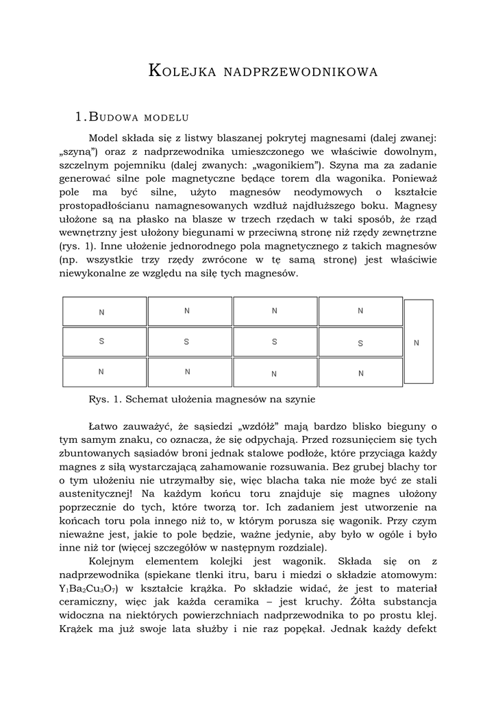 K OLEJKA 1.B UDOWA NADPRZEWODNIKOWA MODELU Model składa się z listwy blaszanej pokrytej magnesami (dalej zwanej: „szyną”) oraz z nadprzewodnika umieszczonego we właściwie dowolnym, szczelnym pojemniku (dalej zwanych: „wagonikiem”). Szyna ma za zadanie generować silne pole magnetyczne będące torem dla wagonika. Ponieważ pole ma być silne, użyto magnesów neodymowych o kształcie prostopadłościanu namagnesowanych wzdłuż najdłuższego boku. Magnesy ułożone są na płasko na blasze w trzech rzędach w taki sposób, że rząd wewnętrzny jest ułożony biegunami w przeciwną stronę niż rzędy zewnętrzne (rys. 1). Inne ułożenie jednorodnego pola magnetycznego z takich magnesów (np. wszystkie trzy rzędy zwrócone w tę samą stronę) jest właściwie niewykonalne ze względu na siłę tych magnesów. Rys. 1. Schemat ułożenia magnesów na szynie Łatwo zauważyć, że sąsiedzi „wzdółż” mają bardzo blisko bieguny o tym samym znaku, co oznacza, że się odpychają. Przed rozsunięciem się tych zbuntowanych sąsiadów broni jednak stalowe podłoże, które przyciąga każdy magnes z siłą wystarczającą zahamowanie rozsuwania. Bez grubej blachy tor o tym ułożeniu nie utrzymałby się, więc blacha taka nie może być ze stali austenitycznej! Na każdym końcu toru znajduje się magnes ułożony poprzecznie do tych, które tworzą tor. Ich zadaniem jest utworzenie na końcach toru pola innego niż to, w którym porusza się wagonik. Przy czym nieważne jest, jakie to pole będzie, ważne jedynie, aby było w ogóle i było inne niż tor (więcej szczegółów w następnym rozdziale). Kolejnym elementem kolejki jest wagonik. Składa się on z nadprzewodnika (spiekane tlenki itru, baru i miedzi o składzie atomowym: Y1Ba2Cu3O7) w kształcie krążka. Po składzie widać, że jest to materiał ceramiczny, więc jak każda ceramika – jest kruchy. Żółta substancja widoczna na niektórych powierzchniach nadprzewodnika to po prostu klej. Krążek ma już swoje lata służby i nie raz popękał. Jednak każdy defekt obniża sprawność działania nadprzewodnika, a szczególnie tak duży jak poklejone pęknięcie! Krążek należy umieścić w jakimkolwiek naczyniu o płaskim denku, które musi być szczelne, ponieważ do pojemnika wlewana jest ciecz. Dobrym pomysłem jest zastosowanie pojemnika o słabej przewodności cieplnej (kubek styropianowy) lub izolowanego w inny sposób, co znacznie wydłuży czas pracy nadprzewodnika. Do rozpoczęcia pokazu niezbędny jest styropianowy dzbanek oraz diuar z ciekłym azotem. 2.D ZIAŁANI E M ODELU JAKAKOLWIEK zmiana pola magnetycznego w pobliżu materiału przewodzącego prąd (czy to przewodnika czy nadprzewodnika) powoduje wytworzenie prądu wewnątrz tego materiału. Płynący prąd elektryczny zawsze wytwarza wokół siebie pole magnetyczne. Jeśli prąd ten jest wzbudzony zmianą pola magnetycznego, to pole powstałe z powodu płynącego prądu będzie przeciwne do ruchu pola zewnętrznego. Dla przykładu: magnetyczny walec wrzucony do pionowej, miedzianej rury nie spadnie swobodnie. Będzie spadał bardzo wolno, ponieważ jego ruch powoduje powstawanie prądu wirowego w rurze. Ten prąd z kolei wytwarza pole magnetyczne pchające magnes z powrotem do góry. Magnes jednak zsunie się w dół, ponieważ wzbudzony prąd wirowy zaniknie z czasem w wyniku istnienia oporu wewnątrz przewodnika. Zatem wraz z prądem zaniknie siła podtrzymująca magnes. Ten opada więc dalej, znowu tworząc spowalniający go prąd wirowy, itd. Opisany wyżej przykład dotyczy przewodnika. Jeśli zastosować nadprzewodnik, to wzbudzony prąd nie będzie zanikał z czasem. Magnes wrzucony do rury z nadprzewodnika nie spadłby na dół, ponieważ wzbudziłby nie zanikający prąd wirowy, a zatem i stałe, przeciwne pole, wystarczające do zrównoważenia siły ciężkości magnesu. Dlatego właśnie możliwa jest analogiczna lewitacja nadprzewodnika nad magnesem (patrz: rozdział 3). Efekt ten może przypominać wypychanie pola magnetycznego przez nadprzewodnik, jednak to słabe wyjaśnienie dla wszystkich obserwowanych zjawisk. Może pojawić się pytanie: dlaczego krążek zamrożony wewnątrz pola zostaje w tym polu, a zamrożony poza polem nie daje się do niego „włożyć”? Stosowany krążek ceramiczny jest izolatorem w temperaturze pokojowej, natomiast nadprzewodnikiem staje się dopiero w temperaturze poniżej 80 K. Jest to temperatura osiągalna za pomocą ciekłego azotu (około 70 K), łatwo dostępnego na Wydziale. Zamrożenie go poza polem i zbliżanie do magnesu powoduje, że zbliżany jest nadprzewodnik do magnesu. Powstaje siła przeciwdziałająca temu ruchowi. W drugim zaś przypadku zbliżamy izolator do magnesu – brak siły „przekory”. Następnie zamrożenie krążka i przejście w stan nadprzewodnictwa wewnątrz dowolnego pola magnetycznego spowoduje, że jakakolwiek próba zmiany położenia tak zamrożonego krążka będzie tożsama ze zmianą pola magnetycznego w jego otoczeniu, a w konsekwencji pojawi się prąd wirowy i przeciwna do ruchu siła oporu. Oczywiście, oderwanie siłą wagonika od toru jest możliwe, tylko po co? Wagonik poruszający się po torze znajduje się w polu, które nie zmienia się wzdłuż toru (jednakowe ułożenie magnesów), dlatego ruch ten jest swobodny. Jedyne czynniki rozpraszające energię ruchu wagonika są: opór powietrza, nierówne ułożenie magnesów toru. Jednak ze względu na to, że w każdym innym kierunku pole się zmienia, to ruch wzdłuż nich napotyka na bardzo silny opór z przyczyn opisanych powyżej (ruch w poprzek toru, ruch wprost na krańce toru – „bufory”, ruch pionowy, czy nawet obracanie nadprzewodnika w miejscu). Siła pomiędzy nadprzewodnikiem i magnesem nie jest po prostu siłą odpychania czy przyciągania. Jest siłą przeciwną do ich względnego ruchu, która nie maleje z czasem! 3.M OŻLIWOŚCI I OGRANICZENI A MODELU Najpopularni