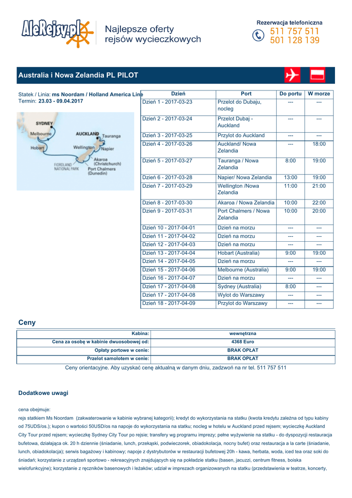 Australia i Nowa Zelandia PL PILOT Dzień Statek / Linia: ms Noordam / Holland America Line Termin: 23.03 - 09.04.2017 Dzień 1 - 2017-03-23 Do portu W morze Przelot do Dubaju, nocleg Port --- --- Dzień 2 - 2017-03-24 Przelot Dubaj Auckland --- --- Dzień 3 - 2017-03-25 Przylot do Auckland --- --- Dzień 4 - 2017-03-26 Auckland/ Nowa Zelandia --- 18:00 Dzień 5 - 2017-03-27 Tauranga / Nowa Zelandia 8:00 19:00 Dzień 6 - 2017-03-28 Napier/ Nowa Zelandia 13:00 19:00 Dzień 7 - 2017-03-29 Wellington /Nowa Zelandia 11:00 21:00 Dzień 8 - 2017-03-30 Akaroa / Nowa Zelandia 10:00 22:00 Dzień 9 - 2017-03-31 Port Chalmers / Nowa Zelandia 10:00 20:00 Dzień 10 - 2017-04-01 Dzień na morzu --- --- Dzień 11 - 2017-04-02 Dzień na morzu --- --- Dzień 12 - 2017-04-03 Dzień na morzu Dzień 13 - 2017-04-04 Hobart (Australia) Dzień 14 - 2017-04-05 Dzień na morzu Dzień 15 - 2017-04-06 Melbourne (Australia) Dzień 16 - 2017-04-07 Dzień na morzu Dzień 17 - 2017-04-08 Sydney (Australia) Dzień 17 - 2017-04-08 Dzień 18 - 2017-04-09 --- --- 9:00 19:00 --- --- 9:00 19:00 --- --- 8:00 --- Wylot do Warszawy --- --- Przylot do Warszawy --- --- Ceny Kabina: Cena za osobę w kabinie dwuosobowej od: wewnętrzna 4368 Euro Opłaty portowe w cenie: BRAK OPŁAT Przelot samolotem w cenie: BRAK OPŁAT Ceny orientacyjne. Aby uzyskać cenę aktualną w danym dniu, zadzwoń na nr tel. 511 757 511 Dodatkowe uwagi cena obejmuje: rejs statkiem Ms Noordam (zakwaterowanie w kabinie wybranej kategorii); kredyt do wykorzystania na statku (kwota kredytu zależna od typu kabiny od 75UDS/os.); kupon o wartości 50USD/os na napoje do wykorzystania na statku; nocleg w hotelu w Auckland przed rejsem; wycieczkę Auckland City Tour przed rejsem; wycieczkę Sydney City Tour po rejsie; transfery wg programu imprezy; pełne wyżywienie na statku - do dyspozycji restauracja bufetowa, działająca ok. 20 h dziennie (śniadanie, lunch, przekąski, podwieczorek, obiadokolacja, nocny bufet) oraz restauracja a la carte (śniadanie, lunch, obiadokolacja); serwis bagażowy i kabinowy; napoje z dystrybutorów w restauracji bufetowej 20h - kawa, herbata, woda, iced tea oraz soki do śniadań; korzystanie z urządzeń sportowo - rekreacyjnych znajdujących się na pokładzie statku (basen, jacuzzi, centrum fitness, boiska wielofunkcyjne); korzystanie z ręczników basenowych i leżaków; udział w imprezach organizowanych na statku (przedstawienia w teatrze, koncerty, nauka tańca, animacje); ubezpieczenie KL, NW, BAGAŻU; KL 30 000 Euro, KR 6000 PLN, NWI 16 000 PLN, BP 1 800 PLN; opiekę polskiego pilota; opłaty portowe. cena nie obejmuje: opłat serwisowych dla załogi statku - 13USD osoba/dzień; korzystania z punktów usługowych na statku m. in.: (fryzjer, pralnia, fotograf, spa, internet) oraz wydatków osobistych; korzystania z barów oraz napojów zamawianych w restauracji a la carte; pakiet napojów All Inclusive - 52 USD/dzień/osoba dorosła (powyżej 21 lat) oraz innych pakietów specjalnych na napoje alkoholowe; wycieczek fakultatywnych. uwagi: Kabiny 3/4 osobowe nie są dostępne we wszystkich kategoriach, a ich liczba jest ograniczona - sprzedaż tylko po potwierdzeniu. Grupa realizowana przy min. 14 osobach. WIZA: Uczestnicy rejsu zobowiązani są do posiadania wizy do Australii. Szczegóły u Organizatora. transfery: Transfer na lotnisko w Warszawie (opcjonalnie) - cena 50Euro/os. w dwie strony * * miejsca wsiadania: Kraków, Katowice, Żory, Rybnik, Częstochowa. Możliwy transfer z Wrocławia przy minimum 6 osobach. PROGRAM REJSU Z POLSKIM PILOTEM Propozycja Wycieczek Fakultatywnych Australia i Nowa Zelandia - Statek Holland America Line Noordam Dokładny program wycieczek z cenami zostanie przesłany uczestnikom na siedem dni przed rejsem. Szczegółowy program wycieczek oraz cena uzależnione są od ilości uczestników oraz ilości czasu jaką statek spędza w danym porcie. Aby poszczególne wycieczki zostały zrealizowane, wymagana jest minimalna ilość uczestników określona dla każdej wycieczki. 1.Dzień - PRZELOT DO DUBAJU I NOCLEG 2.Dzień - PRZELOT DUBAJ - AUCKLAND 3.Dzień - PRZYLOT DO AUCKLAND I NOCLEG 4.Dzień - PORT AUCKLAND NOWA ZELANDIA Proponowana wycieczka: WYCIECZKA PANORAMICZNA PO AUCKLAND, NAJWIĘKSZYM MIEŚCIE NOWEJ ZELANDII Auckland, dawna stolica Nowej Zelandii (1841 - 1865), jest dzisiaj największym miastem (ponad 1,5 mln) i tętniącą życiem aglomeracją kraju. Zwiedzanie z lokalnym polskojęzycznym przewodnikiem rozpoczniemy od Downtown. Zobaczymy tu m. in.: ratusz miejski, główną aleję Queen Street, plac Aotea Square. Wyjedziemy na wzgórze wulkaniczne Mount Eden 196m. n.p.m. skąd rozpościera się wspaniała panorama na całe miasto i zatokę. Odwiedzimy dzielnicę Mission Bay z historyczną zabudową, oraz zapoznamy się z lokalną fauną i florą spacerując po Ogrodach Zimowych oraz po buszu z kolonią ptaków. Po krótkim czasie wolnym przejedziemy do portu morskiego, gdzie nastąpi zaokrętowanie na statek. Czas około 6h Cena: W cenie rejsu 5.Dzień - PORT TAURANGA NOWA ZELANDIA Proponowana wycieczka: ROTORUA I NAJWIĘKSZE ATRAKCJE PRZYRODNICZE WYSPY PÓŁNOCNEJ Z portu Mount Maunganui, w miejscowości Tauranga, udamy się z lokalnym polskojęzycznym przewodnikiem, do największych atrakcji przyrodniczych Wyspy Północnej Nowej Zelandii. Przejedziemy przez malownicze tereny i okolice miejscowości Te Puke, stolicy owoców Kiwi. Po dotarciu do Rotorua, będziemy podziwiać liczne gejzery oraz gorące źródła. Przejedziemy nad malownicze jeziora Zielone, Niebieskie i Tarawera. Odwiedzimy gęsty busz nowozelandzki oraz pospacerujemy przez las czerwonych sekwoi. Będziemy mieli również okazję zobaczyć symbol Nowej Zelandii, ptaka nielota - kiwi. Po czasie wolnym powrót do portu w Tauranga. Czas około 9h Cena około 125USD 6.Dzień - PORT NAPIER NOWA ZELANDIA Proponowana wycieczka: ZWIEDZANIE MIASTA NAPIER - PERŁY ARCHITEKTURY ART DECO Napier, to miasto portowe położone w 