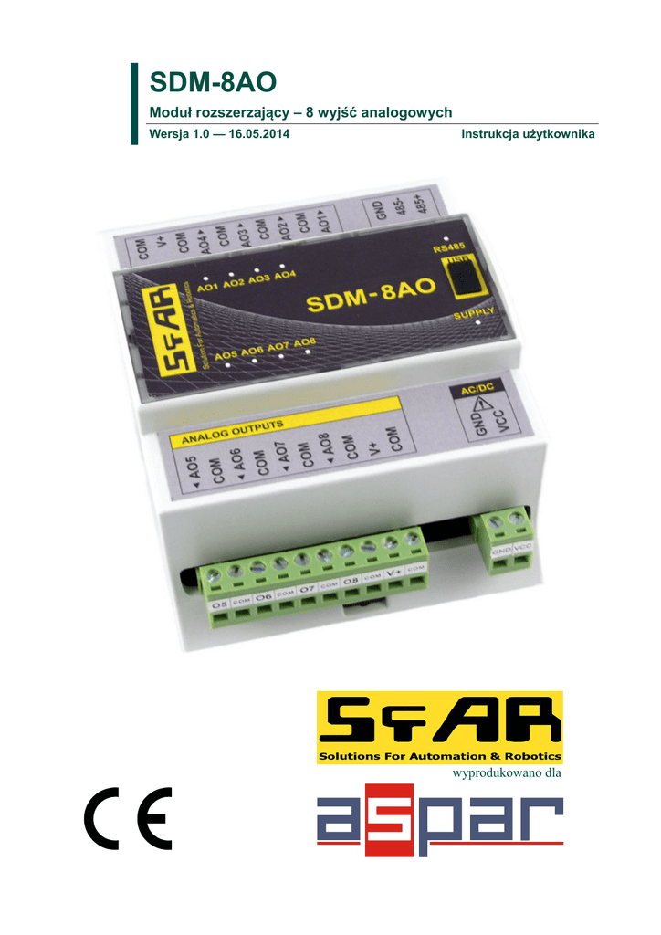 SDM-8AO Moduł rozszerzający – 8 wyjść analogowych Wersja 1.0 — 16.05.2014 Instrukcja użytkownika wyprodukowano dla SDM-8AO SfAR Instrukcja użytkownika Dziękujemy za wybór naszego produktu. Niniejsza instrukcja ułatwi Państwu prawidłową obsługę i poprawną eksploatację opisywanego urządzenia. Informacje zawarte w niniejszej instrukcji przygotowane zostały z najwyższą uwagą przez naszych specjalistów i służą jako opis produktu bez ponoszenia jakiejkolwiek odpowiedzialności w rozumieniu prawa handlowego. Informacje te nie zwalniają użytkownika z obowiązku poddania produktu własnej ocenie i sprawdzenia jego właściwości. Zastrzegamy sobie możliwość zmiany parametrów produktów bez powiadomienia. Prosimy o uważne przeczytanie instrukcji i stosowanie się do zawartych w niej zaleceń UWAGA! Niedostosowanie się do instrukcji może spowodować uszkodzenie urządzenia albo utrudnić posługiwanie się sprzętem lub oprogramowaniem. Moduł rozszerzający – 8 wyjść analogowych Instrukcja użytkownika © SfAR 2014. Wszelkie prawa zastrzeżone. Wersja 1.0- 16.05.2014 2 z 18 SDM-8AO SfAR Instrukcja użytkownika 1. Zasady bezpieczeństwa • Przed pierwszym uruchomieniem urządzenia należy zapoznać się z niniejszą instrukcją obsługi; • Przed pierwszym uruchomieniem urządzenia należy upewnić się, że wszystkie przewody zostały podłączone prawidłowo; • Należy zapewnić właściwe warunki pracy, zgodne ze specyfikacją urządzenia (np.: napięcie zasilania, temperatura, maksymalny pobór prądu); • Przed dokonaniem jakichkolwiek modyfikacji przyłączeń przewodów, należy wyłączyć napięcie zasilania. 2. Charakterystyka modułu 2.1. Przeznaczenie i opis modułu Moduł SDM-8AO posiada 8 wyjść analogowych mogących pracować jako wyjście prądowe (0-20mA lub 4-20mA) lub wyjście napięciowe (0-10V). Ustawienie wartości napięcia lub prądu wyjściowego następuje za pomocą magistrali RS485 (protokół Modbus), dzięki czemu w prosty sposób można zintegrować moduł z popularnymi sterownikami PLC, HMI lub komputerami PC wyposażonymi w odpowiednie przejściówki. Moduł ten podłączany jest do magistrali RS485 za pomocą dwu przewodowej skrętki. Komunikacja odbywa się z wykorzystaniem protokołu MODBUS RTU lub MODBUS ASCII. Zastosowanie 32-bitowego procesora z rdzeniem ARM zapewnia szybkie przetwarzanie danych i szybką komunikację. Prędkość transmisji jest konfigurowalna od 2400 do 115200. Moduł przeznaczony jest do montażu na szynie DIN zgodnie z normą DIN EN 5002. Moduł został wyposażony z zestaw diod LED (kontrolek), używanych do wskazywania stanu wyjść przydatnych w celach diagnostycznych i pomagających w znalezieniu błędów. Konfiguracja modułu odbywa się przez USB za pomocą dedykowanego programu komputerowego. Możliwa jest również zmiana parametrów za pomocą protokołu MODBUS. Moduł rozszerzający – 8 wyjść analogowych Instrukcja użytkownika © SfAR 2014. Wszelkie prawa zastrzeżone. Wersja 1.0- 16.05.2014 3 z 18 SDM-8AO SfAR Instrukcja użytkownika 2.2. Specyfikacja techniczna Zasilanie Wyjścia Temperatura Złącza Wymiary Interfejs * Napięcie 10-30 VDC; 10-28VAC Prąd maksymalny* DC: 52 mA @ 24VDC AC: 62 mA @ 24VAC Maksymalna pobierana moc DC: 1,25W; AC: 1,5VA Liczba wyjść 8 Wyjście napięciowe 0V do 10V (rozdzielczość 1.5mV) Wyjście prądowe 0mA do 20mA (rozdzielczość 5μA) Wyjście prądowe 4mA do 20mA (wynik w promilach – 1000 kroków) (rozdzielczość 16μA) Rozdzielczość przetwornika 12 bitów Czas przetwarzania DAC 16ms / kanał Pracy -10 °C - +50°C Przechowywania -40 °C - +85°C Zasilające 2 pinowe Komunikacyjne 3 pinowe Wejścia 2x 10 pinowe Konfiguracyjne Mini USB Wysokość 110 mm Głębokość 62 mm Szerokość 88 mm RS485 Do 128 urządzeń Maksymalny prąd przy aktywnej transmisji Modbus, załączonych wszystkich wejściach i wyjściach Moduł rozszerzający – 8 wyjść analogowych Instrukcja użytkownika © SfAR 2014. Wszelkie prawa zastrzeżone. Wersja 1.0- 16.05.2014 4 z 18 SDM-8AO SfAR Instrukcja użytkownika 2.3. Wymiary modułu Wygląd i wymiary modułu znajdują się na rysunku poniżej. Moduł mocowany jest bezpośrednio do szyny w przemysłowym standardzie DIN. Złącza zasilające, komunikacyjne oraz wejść znajdują się od dołu i góry modułu. Złącze konfiguracyjne USB oraz wskaźniki znajdują się z przodu modułu. 91 45 110 42,3 35 110 88 Moduł rozszerzający – 8 wyjść analogowych Instrukcja użytkownika © SfAR 2014. Wszelkie prawa zastrzeżone. Wersja 1.0- 16.05.2014 5 z 18 SDM-8AO SfAR Instrukcja użytkownika 3. Konfiguracja komunikacji 3.1. Uziemienie i ekranowanie Moduł może być zainstalowany wraz z innymi urządzeniami, które generują promieniowanie elektromagnetyczne. Przykładami takich urządzeń są przekaźniki i styczniki, transformatory, sterowniki silników itp. To promieniowanie elektromagnetyczne może powodować zakłócenia elektryczne zasilania i przewodów sygnałowych, a także promieniując bezpośrednio do modułu, powodując negatywne skutki dla systemu. Odpowiednie uziemienie, osłony oraz inne działania ochronne należy podjąć na etapie instalacji, aby zapobiec tym efektom. Te działania ochronne obejmują m.in. uziemienie szafy sterowniczej, uziemienie modułu, uziemienie ekranowania przewodów, zabezpieczenie urządzeń przełączających, prawidłowego okablowania, jak również uwzględnienie typów kabli i ich przekrojów. 3.2. Terminator Efekty linii transmisyjnej często powodują problemy w sieciach teleinformatycznych. Problemy te dotyczą najczęściej tłumienia sygnału i odbić w sieci. Aby wyeliminować obecność odbić od końców kabla, należy na obu jego końcach zastosować rezystor o impedancji równej impedancji charakterystycznej linii. W przypadku skrętki RS485 typową wartością jest 120 Ω. 3.3. Ustalanie adresu modułu w sieci Poniższa tabela przedstawia sposób ustawieni