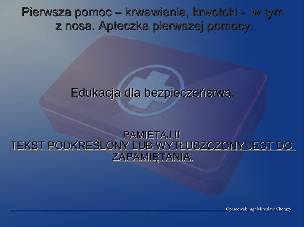 Pierwsza pomoc – krwawienia, krwotoki - w tym z nosa. Apteczka pierwszej pomocy. Edukacja dla bezpieczeństwa. PAMIETAJ !! TEKST PODKREŚLONY LUB WYTŁUSZCZONY JEST DO ZAPAMIĘTANIA. Opracował: mgr Mirosław Chorąży Apteczka pierwszej pomocy Jest to pakiet, mający za zadanie wyposażyć ratującego zdrowie i życie poszkodowanego w techniczne środki medyczne. Podstawowy skład apteczki powinien tworzyć: - bandaże elastyczne, - bandaże dziane, - jałowe kompresy, - nożyczki, - folia termoizolacyjna, - rękawiczki jednorazowe, - maska twarzowa lub folia z zastawką do resuscytacji oddechowej, - chusta trójkątna. Dodatkowo apteczka może zawierać: - agrafkę, - siatkę opatrunkową, - wodę utlenioną. WYPOSAŻENIE APTECZKI PIERWSZEJ POMOCY KRWAWIENIA I KRWOTOKI Krwawienie, to powolna utrata krwi z krwiobiegu na skutek przerwania ciągłości naczyń krwionośnych, tkanek, ciągłości skóry. Można je podzielić na krwawienie: - wewnętrzne - zewnętrzne Krwotok, to przerwanie ciągłości naczynia krwionośnego i towarzyszące temu wydostanie się gwałtowne krwi poza jego zasięg. Podzielić je można na: - śródmiąższowe - żylne - tętnicze W przypadku krwotoku nie wolno używać, jak to kiedyś czyniono, opasek uciskowych. Ucisk stosować za pomocą dłoni w miejscu krwawienia. Co jakiś czas luzując ucisk. W sytuacji utraty dużej ilości krwi, może wystąpić wstrząs krwotoczny – jest to stan bezpośredniego zagrożenia życia. Podczas tamowania krwawień i krwotoków , czyli opatrywanie ran, obowiązuje zasada niedopuszczenia drobnoustrojów (wirusy, bakterie, grzyby, riketsje) do rany. Dlatego zasadą jest jałowość opatrunków, narzędzi oraz rąk ratownika. Nazywa się to Aseptyka. Postępowanie w przypadku rany z krwawieniem: - jeżeli rana jest zabrudzona, obmyj ją wodą zdatną do picia, - jeżeli istnieje taka możliwość, zdezynfekować ranę wodą utlenioną, - w miejscu krwawienia założyć jałowy opatrunek, jeśli to jest potrzebne (opatrunek może przemakać) założyć kolejne warstwy opatrunku, - zastosować ucisk opatrunkowy, ewentualnie zabandażować zranione miejsce, na który jest nałożony opatrunek. UWAGA ! - jeżeli w ranie tkwią jakieś odłamki obcych ciał, nie usuwamy ich. Usunięciem ich zajmie się lekarz. Przyczyny krwotoku z nosa: 1. Nadciśnienie tętnicze. 2. Skazy krwotoczny wrodzone (np. Hemofilia). 3. Skazy krwotoczne nabyte (np. uszkodzenie wątroby). 4. Przegrzanie organizmu. Postępowanie w przypadku krwotoku nosa: Krok 1. Zachowaj półsiedzącą pozycję ciała z głową lekko pochyloną do przodu. Zmniejszasz w ten sposób ryzyko zakrztuszenia się krwią. Krok 2. Przyłóż zimny kompres na okolicę karku. Krok 3. Dociśnij, bezpośrednio palcami, skrzydełka nosa do przegrody nosowej. Krok 4. Odczekaj ok. 10 minut i sprawdź czy krew skrzepła. Jeśli nie kontynuuj czynność (krok 3.) Jeśli to nie pomaga należy jak najszybciej skontaktować się z numerem 999 lub 112. Zakładanie opatrunku jego bandażowanie Bandażowanie sposobem śrubowym i śrubowym zaginanym