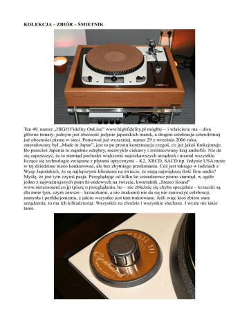 KOLEKCJA – ZBIÓR – ŚMIETNIK Ten 49. numer „HIGH Fidelity OnLine” www.highfidelity.pl mógłby – i właściwie ma – dwa główne tematy: jednym jest obecność jedynie japońskich marek, a drugim celebracja czteroletniej już obecności pisma w sieci. Ponieważ już wcześniej, numer 29 z września 2006 roku, zatytułowany był „Made in Japan”, jest to po prostu kontynuacja czegoś, co już jakoś funkcjonuje. Bo przecież Japonia to zupełnie odrębny, niezwykle ciekawy i zróżnicowany kraj audiofili. Nie da się zaprzeczyć, że to stamtąd pochodzi większość najciekawszych urządzeń i niemal wszystkie liczące się technologie związane z płytami optycznymi – K2, XRCD, SACD itp. Jedynie USA może w tej dziedzinie nieco konkurować, ale bez zbytniego przekonania. Cóż jest takiego w ludziach z Wysp Japońskich, że są najlepszymi klientami na świecie, że mają największą ilość firm audio? Myślę, że jest tym czymś pasja. Przeglądając od kilku lat sztandarowe pismo stamtąd, w ogóle jedno z najważniejszych pism hi-endowych na świecie, kwartalnik „Stereo Sound” www.stereosound.co.jp (piszę o przeglądaniu, bo – nie zbłaźnię się chyba specjalnie – krzaczki są dla mnie tym, czym zawsze – krzaczkami, a nie znakami) nie da się nie zauważyć celebracji, namysłu i perfekcjonizmu, z jakim wszystko jest tam traktowane. Jeśli więc ktoś zbiera stare urządzenia, to ma ich kilkadziesiąt. Wszystkie na chodzie i wszystkie słuchane. I wcale nie takie tanie. To jednak nie koniec – w Japonii sprzęt jest nierozerwalnie związany z muzyką. Może to truizm, ale w świecie audio niebezpiecznie często zapominany: walczymy o coraz lepszy dźwięk nie dla niego samego, a po to, aby możliwie najpiękniej zabrzmiała dla nas muzyka, aby uwolnić z niej jak najwięcej emocji i intencji twórcy (muzyk, dyrygent, realizator nagrania itp.). To jest święte i nie można tego zmieniać. A Japończycy są genialnymi słuchaczami i miłośnikami muzyki – nie przypadkiem Chopin jest dla nich czymś w rodzaju bożka. Nie pomylę się, jeśli stwierdzę, że znajomość klasyki, w tym twórczości „naszego” kompozytora, jest tam na znacznie wyższym poziomie niż u nas, w kraju, który przecież wydał na świat autora Mazurków. Na tym nie koniec – jest jeszcze nieprzebrane morze jazzu, gdzie możemy jedynie podziwiać, jak dobrze to dziedzictwo jest tam przypominane i przyswajane. Jeśli kiedykolwiek mieli Państwo wydaną w Japonii reedycję jakiegoś klasycznego albumu, reedycję mini-LP, wiedzą Państwo o czym mówię – przywiązanie do szczegółu daje w efekcie małe dzieła sztuki, w pewnej mierze odnoszące się do sztuki związanej z płytami LP. Ale to wszystko dlatego, że Japończycy są w głębi duszy kolekcjonerami – dotyczy to w głównej mierze antyków, staroci, zegarków, samochodów, gadżetów, jak i sprzętu i płyt. Ale czym jest kolekcjonerstwo? Słownik Języka Polskiego mówi, że jest to: „zbiór przedmiotów jednego rodzaju, mających wartość naukową, artystyczną itp”. Kolekcjonerstwo jest więc swego rodzaju skrzyżowaniem pracy naukowej (element edukacyjny) i działalności artystycznej (element estetyczny). Warto podkreślić, że centralnymi punktami tej definicji, miejscami położenia akcentu są słowa: „zbiór” i „mających wartość”. Niby nic, a jednak czyni to z tego rodzaju działalności coś więcej niż ‘zbieractwo’. Wprawdzie w definicji słowa ‘kolekcjonować’ pojawia się owo ‘zbieractwo’, ale na końcu, jako dopełnienie tego, co jest przed nim. Kolekcja to bowiem nie tyle zbiór, a coś więcej, coś szerszego – to zbiór ukierunkowany, uporządkowany, zbiór mający cel i sens. Dlatego o kolekcjonowaniu możemy mówić, kiedy wkładana jest w nie spora praca i pieniądze. Bez tego mówimy zaś jedynie o ‘zbiorze’. Słowo to definiowane jest w Słowniku... jako: „nagromadzenie podobnych przedmiotów, zwykle o wartości naukowej lub artystycznej”. Wprawdzie na końcu pada słowo ‘kolekcja’, ale w takiej samej formie, jak wcześniej ‘zbiór’ w definicji kolekcji. Bo zbiór jest czymś podrzędnym w stosunku do kolekcji, czymś uboższym. Nie odmawia się mu wprawdzie pretensji naukowych i artystycznych, ale na takiej zasadzie, jak nie mówi się o kimś, że jest „gejem”, tylko „kochającym inaczej”. Wiadomo o co chodzi (nie mam nic przeciwko gejom, ani kochającym inaczej, ale chcę pokazać, w jaki sposób funkcjonuje język i jak wpływa na postrzeganie świata), jednak brzmi lepiej. W każdym razie zbieractwo nie jest tożsame z kolekcjonowaniem. A jak to się przekłada na płyty? W prosty sposób – zbieractwo jest tym, czym się większość z nas zajmuje – gromadzimy płyty ulubionych wykonawców i zespołów, wyszukując te, które się nam najbardziej podobają. Coś tam najczęściej na ich temat wiadomo, ale ta wiedza jest pobieżna. Kiedy zaczyna się kolekcjonowanie? Ano wtedy, myślę, kiedy zbierzemy całą dyskografię, wszystko, co się ukazało (albo wszystko to, co jest dostępne – walka o rzadkie pozycje jest solą kolekcjonerstwa) i nabędziemy na jej temat wiedzę, kiedy zgłębimy historię tego typu muzyki, tego wykonawcy itp. Bez tego wciąż będziemy jedynie zbieraczami. Rozmawiałem o tym kiedyś z przyjacielem i uderzyło mnie, że większość ludzi myśli, ze „kolekcjonuje” płyty, a w rzeczywistości je jedynie „zbiera”. Wychodzi się bowiem z założenia, że jeśli jakaś płyta w dyskografii się nam nie podoba, to jej nie kupuje, prawda? No i dobrze – nie namawiam nikogo do zmiany upodobań. Wiedzmy jednak, że wówczas o kolekcji nie może być mowy. Powiem więcej – stąd niebezpiecznie blisko do tego, co ma miejsce w jakiś 99% domów, do śmietnika. ‘Śmietnik’ definiowany jest przez Słownik... jako: „miejsce, gdzie wyrzuca się śmiecie, zbiornik na śmiecie; kupa śmieci”,