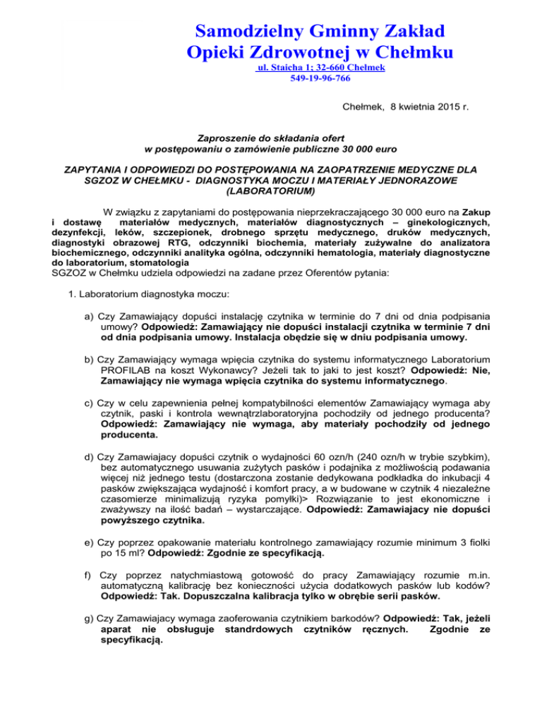 Samodzielny Gminny Zakład Opieki Zdrowotnej w Chełmku ul. Staicha 1; 32-660 Chełmek 549-19-96-766 Chełmek, 8 kwietnia 2015 r. Zaproszenie do składania ofert w postępowaniu o zamówienie publiczne 30 000 euro ZAPYTANIA I ODPOWIEDZI DO POSTĘPOWANIA NA ZAOPATRZENIE MEDYCZNE DLA SGZOZ W CHEŁMKU - DIAGNOSTYKA MOCZU I MATERIAŁY JEDNORAZOWE (LABORATORIUM) W związku z zapytaniami do postępowania nieprzekraczającego 30 000 euro na Zakup i dostawę materiałów medycznych, materiałów diagnostycznych – ginekologicznych, dezynfekcji, leków, szczepionek, drobnego sprzętu medycznego, druków medycznych, diagnostyki obrazowej RTG, odczynniki biochemia, materiały zużywalne do analizatora biochemicznego, odczynniki analityka ogólna, odczynniki hematologia, materiały diagnostyczne do laboratorium, stomatologia SGZOZ w Chełmku udziela odpowiedzi na zadane przez Oferentów pytania: 1. Laboratorium diagnostyka moczu: a) Czy Zamawiający dopuści instalację czytnika w terminie do 7 dni od dnia podpisania umowy? Odpowiedź: Zamawiający nie dopuści instalacji czytnika w terminie 7 dni od dnia podpisania umowy. Instalacja obędzie się w dniu podpisania umowy. b) Czy Zamawiający wymaga wpięcia czytnika do systemu informatycznego Laboratorium PROFILAB na koszt Wykonawcy? Jeżeli tak to jaki to jest koszt? Odpowiedź: Nie, Zamawiający nie wymaga wpięcia czytnika do systemu informatycznego. c) Czy w celu zapewnienia pełnej kompatybilności elementów Zamawiający wymaga aby czytnik, paski i kontrola wewnątrzlaboratoryjna pochodziły od jednego producenta? Odpowiedź: Zamawiający nie wymaga, aby materiały pochodziły od jednego producenta. d) Czy Zamawiajacy dopuści czytnik o wydajności 60 ozn/h (240 ozn/h w trybie szybkim), bez automatycznego usuwania zużytych pasków i podajnika z możliwością podawania więcej niż jednego testu (dostarczona zostanie dedykowana podkładka do inkubacji 4 pasków zwiększająca wydajność i komfort pracy, a w budowane w czytnik 4 niezależne czasomierze minimalizują ryzyka pomyłki)> Rozwiązanie to jest ekonomiczne i zważywszy na ilość badań – wystarczające. Odpowiedź: Zamawiajacy nie dopuści powyższego czytnika. e) Czy poprzez opakowanie materiału kontrolnego zamawiający rozumie minimum 3 fiolki po 15 ml? Odpowiedź: Zgodnie ze specyfikacją. f) Czy poprzez natychmiastową gotowość do pracy Zamawiający rozumie m.in. automatyczną kalibrację bez konieczności użycia dodatkowych pasków lub kodów? Odpowiedź: Tak. Dopuszczalna kalibracja tylko w obrębie serii pasków. g) Czy Zamawiajacy wymaga zaoferowania czytnikiem barkodów? Odpowiedź: Tak, jeżeli aparat nie obsługuje standrdowych czytników ręcznych. Zgodnie ze specyfikacją. h) Czy Zamawiajacy wymaga czytnika z oprogramowaniem w języku polskim? Odpowiedź: Nie, Zamawiajacy nie wymaga oprogramowania w j. polskim. Wymagana jest dokumentacja w j. polskim. i) Czy Zamawiajacy wymaga czytnika fabrycznie nowego? Odpowiedź: Aparat będzie przedmiotem dzierżawy. Decyzja dostawcy. j) Czy Zamawiajacy wymaga czytnika z możliwością wprowadzania komentarzy przed pomiarem, bezpośrednio po uzyskaniu wyniku i po wyszukaniu wyniku w pamięci (np. komentarzy dla pacjenta/próbki, łącznie z informacją nt. osadu moczu)? Odpowiedź: Nie, Zamawiajacy nie wymaga czytnika z możliwością wprowadzania komentarzy przed pomiarem, bezpośrednio po uzyskaniu wyniku i po wyszukaniu wyniku w pamięci k) Czy Zamawiający wymaga czytnika z możliwością wprowadzenia barwy i klarowności moczu, definiowanej przez użytkownika? Odpowiedź: Nie, Zamawiający nie wymaga czytnika z możliwością wprowadzenia barwy i klarowności moczu, definiowanej przez użytkownika. l) Czy Zamawiajacy wymaga czytnika z możliwością Wydruk wszystkich wpisanych danych pacjenta/próbki: ID, nr seryjny, barwa moczu, klarowność moczu, komentarze, ustawienia przez użytkownika kolejności parametrów na wydruku, zaprogramowania nagłówka wydruku wyników, przefiltrowania wyników w pamięci aparatu wg: ID pacjenta, numeru kolejnego, wyników dodatnich, wyników nie wydrukowanych oraz daty. Odpowiedź: Nie. Zamawiający wymaga pamięci ostatnich wyników min. 3000 testów. 2. Laboratorium sprzęt jednorazowy: a) Czy Zamawiający dopuści zaoferowanie igieł standardowych zamiast bezpiecznych? Odpowiedź: Zgodnie ze specyfikacją.