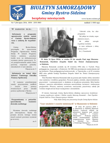 www.bystra-sidzina.pl nakład 1 000 egz. Nr 7 (29) lipiec 2014, ISSN 2353-3803 W numerze m.in.: Informacje o programie ograniczenia niskiej emisji w Gminie Bystra-Sidzina wraz z ankietą do wypełnienia. Gmina Bystra-Sidzina przystąpiła do opracowania Programu Ograniczenia Niskiej Emisji. W ramach Programu Gmina zamierza pozyskać środki m.in. na dofinansowanie wymiany pieców grzewczych. Trwa przeprowadzanie ankiet, które pozwolą rozpoznać potrzeby mieszkańców w tym zakresie. Więcej na str. 3 Informacja na temat działalności Gminnego Ośrodka Pomocy Społecznej W numerze przedstawiamy zasady przyznawania zasiłków i innych form pomocy świadczonych przez ośrodek pomocy społecznej w Bystrej Więcej na str. 5 Przypominamy o potrzebie sprawdzenia ważności dowodu osobistego Wymiana dowodu osobistego jest obowiązkowa. Każdy kto posiada dowód, którego termin stracił ważność powinien wymienić go na nowy. str. 8 " Odeszłaś cicho, bez słów pożegnania. Tak jakbyś nie chciała, swym odejściem smucić... tak jakbyś wierzyła w godzinę rozstania, że masz niebawem z dobrą wieścią wrócić" Ks. J. Twardowski W dniu 14 lipca 2014r. w wieku 59 lat zmarła Pani mgr Marzena Romaniak, Dyrektor Zespołu Szkół im. Dzieci Zamojszczyzny w Sidzinie. Marzena Romaniak urodziła się 20 września 1954 roku w Tucholi. Pracę pedagogiczną rozpoczęła w Krakowie. Od 1980 roku jej miejscem zamieszkania stał się Jordanów. Pracę pedagogiczną kontynuowała w Toporzysku, a od 01 września 2003 roku pełniła funkcję Dyrektora Zespołu Szkół im. Dzieci Zamojszczyzny w Sidzinie. Pani Dyrektor Marzena Romaniak dała się poznać jako bardzo dobry menedżer oraz sumienny i troskliwy gospodarz. Poczucie piękna, estetyki, odpowiedzialność, pracowitość i systematyczność w działaniu to Jej główne przymioty. Była bardzo dobrym i prawym człowiekiem, cenionym nauczycielem, szczerym i serdecznym przyjacielem. Wszyscy zarówno uczniowie, nauczyciele, pracownicy szkoły jak i rodzice mogli zawsze liczyć na Jej pomoc i zrozumienie. W imieniu Samorządu Gminy Bystra-Sidzina składamy najszczersze kondolencje i wyrazy współczucia rodzinie i bliskim zmarłej Marzeny Romaniak – Pani Dyrektor Zespołu Szkół im. Dzieci Zamojszczyzny w Sidzinie. Wójt, Rada Gminy oraz pracownicy Urzędu Gminy Bystra-Sidzina W dniu 29 czerwca 2014 r. w Skansenie w Sidzinie Muzeum Kultury Ludowej odbyła się plenerowa impreza pod nazwą „Czar Smaków i Czasów Minionych”. Podczas imprezy został rozstrzygnięty konkurs zorganizowany przez Skansen w Sidzinie na „Wianek z Ostatniego Nieszporu". Więcej na str.10 W wymienionym okresie wydano zarządzenia w sprawach: 1. Umorzenia zaległości z tytułu opłat za odbiór odpadów komunalnych (trzy zarządzenia). 2. Zmiany zarządzenia dotyczącego wykonania uchwały budżetowej Gminy Bystra-Sidzina na 2014 rok oraz zmiany planu finansowego Urzędu Gminy Bystra-Sidzina na 2014 rok ( trzy zarządzenia). 3. Zmian w budżecie Gminy Bystra-Sidzina na 2014 rok (dwa zarządzenia). 4. Rozłożenia na raty zaległości z tytułu opłat za odbiór odpadów komunalnych. 5. Wprowadzenia regulaminu udzielania zamówień publicznych wartości nie przekraczającej wyrażonej w złotych równowartości kwoty 30.000 euro, o której mowa w art. 4 pkt. 8 ustawy – Prawo zamówień publicznych. 6. Przyjęcia planów doskonalenia w związku z przeprowadzeniem II samooceny w Urzędzie Gminy Bystra-Sidzina w oparciu o metodę CAF 2013. 7. Przeprowadzenia konkursu na stanowisko Dyrektora Zespołu Szkół im. Dzieci Zamojszczyzny w Sidzinie. 8. Powołania komisji konkursowej do przeprowadzenia konkursu na stanowisko Dyrektora Zespołu Szkół im. Dzieci Zamojszczyzny w Sidzinie. 9. Ustalenia zastępstwa inkasenta poboru opłaty targowej. (M.G.) WÓJT GMINY BYSTRA-SIDZINA ogłasza konkurs na stanowisko Dyrektora Zespołu Szkół im. Dzieci Zamojszczyzny w Sidzinie 34-236 Sidzina 701 o których mowa w art. 31 ust.1 pkt 4 ustawy z dnia 17 grudnia 2004 r. o odpowiedzialności za naruszenie dyscypliny finansów publicznych ( Dz. U. z 2013r., poz. 168) 10) oświadczenie o dopełnieniu obowiązku, o którym mowa w art. 7 ust. 1 i ust. 3a ustawy z dnia 18 października 2006r. o ujawnieniu informacji o dokumentach organów bezpieczeństwa państwa z lat 1944-1990 oraz treści tych dokumentów ( Dz. U. z 2013r. poz. 1388) – w przypadku kandydata na dyrektora publicznej szkoły, 11) oryginał lub poświadczoną przez kandydata za zgodność z oryginałem kopię aktu nadania stopnia nauczyciela mianowanego lub dyplomowanego – w przypadku nauczyciela, 12) oryginał lub poświadczoną przez kandydata za zgodność z oryginałem kopię oceny pracy lub oceny dorobku zawodowego – w przypadku nauczyciela i nauczyciela akademickiego, 13) oświadczenie, że kandydat nie był karany karą dyscyplinarną, o której mowa w art. 76 ust. 1 ustawy z dnia 26 stycznia 1982r. – Karta Nauczyciela ( tekst jednolity Dz. U. z 2014r. poz. 191 z późn. zm.) lub w art. 140 ust. 1 ustawy z dnia 27 lipca 2005r. – Prawo o szkolnictwie wyższym ( Dz. U. z 2012r. poz. 572 ze zmianami) w przypadku nauczyciela i nauczyciela akademickiego, 14) oświadczenie, że kandydat ma pełną zdolność do czynności prawnych i korzysta z pełni praw publicznych – w przypadku osoby niebędącej nauczycielem, 15) oświadczenie, że kandydat wyraża zgodę na przetwarzanie danych osobowych zgodnie z ustawą z dnia 29 sierpnia 1997r. o ochronie danych osobowych ( Dz. U. z 2002r. Nr 101, poz. 926 ze zmianami) w celach przeprowadzenia konkursu na stanowisko dyrektora. 1. Do konkursu może przystąpić osoba, która spełnia wymagania określone w Rozporządzeniu Ministra Edukacji Narodowej z dnia 27 października 2009r. w sprawie wymagań, jakim powinna odpowiadać osoba zajmująca stanowisko dyrektora oraz inne stanowisko kierownicze w szczególnych typach publicznych szkół i rodzajach publicznych placówek (