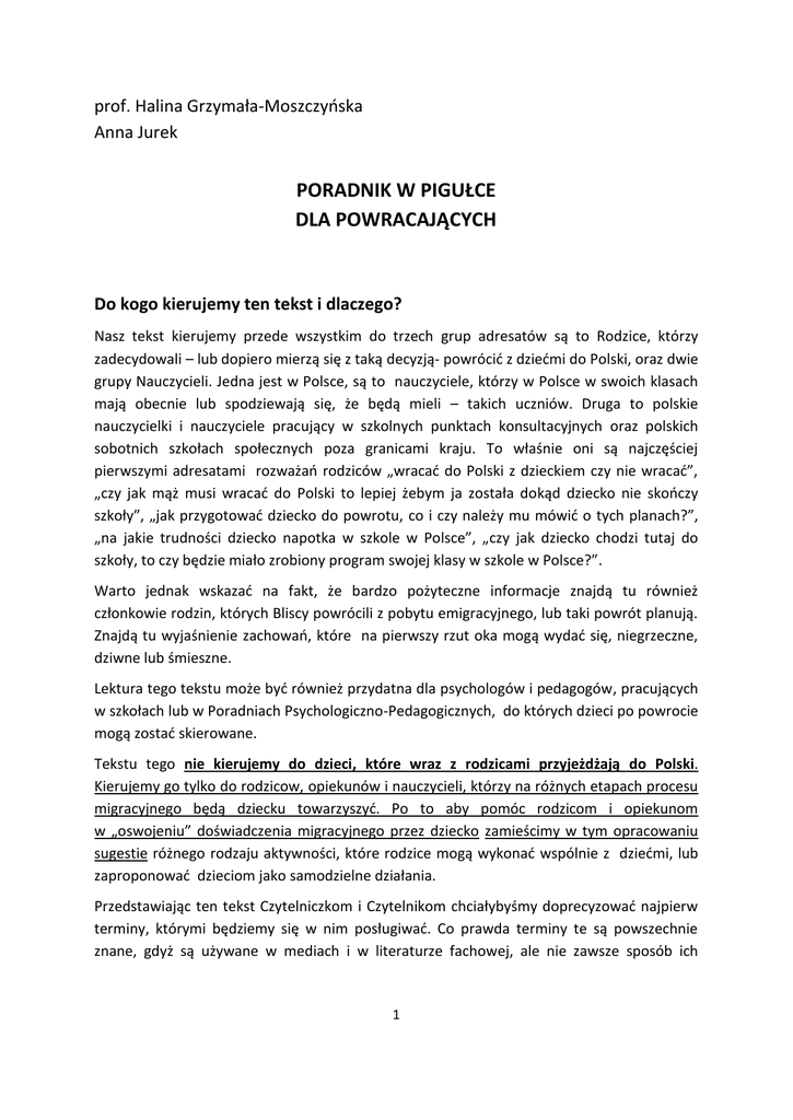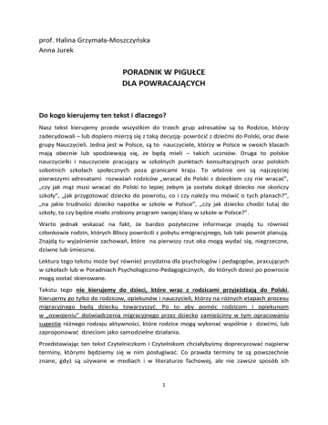 prof. Halina Grzymała-Moszczyńska Anna Jurek PORADNIK W PIGUŁCE DLA POWRACAJĄCYCH Do kogo kierujemy ten tekst i dlaczego? Nasz tekst kierujemy przede wszystkim do trzech grup adresatów są to Rodzice, którzy zadecydowali – lub dopiero mierzą się z taką decyzją- powrócić z dziećmi do Polski, oraz dwie grupy Nauczycieli. Jedna jest w Polsce, są to nauczyciele, którzy w Polsce w swoich klasach mają obecnie lub spodziewają się, że będą mieli – takich uczniów. Druga to polskie nauczycielki i nauczyciele pracujący w szkolnych punktach konsultacyjnych oraz polskich sobotnich szkołach społecznych poza granicami kraju. To właśnie oni są najczęściej pierwszymi adresatami rozważań rodziców „wracać do Polski z dzieckiem czy nie wracać”, „czy jak mąż musi wracać do Polski to lepiej żebym ja została dokąd dziecko nie skończy szkoły”, „jak przygotować dziecko do powrotu, co i czy należy mu mówić o tych planach?”, „na jakie trudności dziecko napotka w szkole w Polsce”, „czy jak dziecko chodzi tutaj do szkoły, to czy będzie miało zrobiony program swojej klasy w szkole w Polsce?”. Warto jednak wskazać na fakt, że bardzo pożyteczne informacje znajdą tu również członkowie rodzin, których Bliscy powrócili z pobytu emigracyjnego, lub taki powrót planują. Znajdą tu wyjaśnienie zachowań, które na pierwszy rzut oka mogą wydać się, niegrzeczne, dziwne lub śmieszne. Lektura tego tekstu może być również przydatna dla psychologów i pedagogów, pracujących w szkołach lub w Poradniach Psychologiczno-Pedagogicznych, do których dzieci po powrocie mogą zostać skierowane. Tekstu tego nie kierujemy do dzieci, które wraz z rodzicami przyjeżdżają do Polski. Kierujemy go tylko do rodzicow, opiekunów i nauczycieli, którzy na różnych etapach procesu migracyjnego będą dziecku towarzyszyć. Po to aby pomóc rodzicom i opiekunom w „oswojeniu” doświadczenia migracyjnego przez dziecko zamieścimy w tym opracowaniu sugestie różnego rodzaju aktywności, które rodzice mogą wykonać wspólnie z dziećmi, lub zaproponować dzieciom jako samodzielne działania. Przedstawiając ten tekst Czytelniczkom i Czytelnikom chciałybyśmy doprecyzować najpierw terminy, którymi będziemy się w nim posługiwać. Co prawda terminy te są powszechnie znane, gdyż są używane w mediach i w literaturze fachowej, ale nie zawsze sposób ich 1 stosowania przez różnych Autorów jest analogiczny. W trakcie lektury różnych tekstów napotkać można na wiele rozbieżności, prowadzących w konsekwencji do nieporozumień. Najbardziej ogólnym terminem określającym przemieszczanie się osób w celu zmiany miejsca dotychczasowego zamieszkania to migracje. Niektóre migracje odbywają się w granicach kraju zamieszkiwanego przez dane osoby, zaś inne prowadzą do przekraczania granic własnego państwa. Migracje mogą być podjęte w sposób dobrowolny lub odbywać się pod przymusem. W pierwszym wypadku (migracji dobrowolnych) mają one na celu poprawę sytuacji ekonomicznej, zdobycie wykształcenia, realizację zadań zawodowych na polecenie pracodawcy lub też dalszy rozwój zawodowy osoby podejmującej samodzielnie daną decyzję wyjazdową. Te dwie ostatnie kategorie osób określane są mianem ekspatów. W drugim wypadku (migracji przymusowych) mamy na myśli osoby, których decyzja o opuszczeniu własnego kraju została wymuszona sytuacją zagrożenia zdrowia, bezpieczeństwa lub życia. Mówimy wówczas o sytuacji uchodźctwa, albo wewnętrznego (gdy osoby te nie przekraczają granic swojego kraju) albo uchodźctwa w rozumieniu Konwencji Genewskiej (gdy osoby te opuszczają granice swojego kraju). Wśród migrantów dobrowolnych wyróżnić jeszcze należy dwie kategorie osób. Są to osoby określane mianem imigrantów oraz emigrantów. Określenie to może odnosić się do tej samej osoby w zależności od tego czy jest ona określana z perspektywy kraju do którego przyjeżdża, czy też z perspektywy kraju, który opuszcza. Tak więc rodzina przysłowiowych Państwa Kowalskich, wyjeżdżających z Polski do Wielkiej Brytanii to rodzina emigrantów z perspektywy Polski, a jednocześnie rodzina imigrantów z perspektywy Wielkiej Brytanii. Ta sama rodzina w momencie podjęcia decyzji o powrocie do Polski stanie się rodziną imigrantów lub migrantów powrotnych w Polsce, a rodziną emigrantów z Wielkiej Brytanii. Sytuacja ulega pewnemu skomplikowaniu gdy rozpatrzymy sytuację dwóch córek tej rodziny. O ile Ania - dziecko urodzone w Polsce, które wyjechało z Polski wraz z rodzicami, będzie podobnie jak oni imigrantem, lub migrantem powrotnym, o tyle Basia - dziecko urodzone w Wielkiej Brytanii będzie emigrantem z Wielkiej Brytanii. Sytuacja każdej z sióstr będzie inna zarówno formalnie, jak i w niektórych wypadkach również w sensie psychologicznym. Starsze dziecko może mieć za sobą okres życia w Polsce, gdy już, przykładowo, realizowało część obowiązku szkolnego, zaś młodsze dziecko może mieć tylko doświadczenia z instytucjami edukacyjnym w Wielkiej Brytanii, a Polska może być co najwyżej krajem w którym spędzało wraz z rodzicami wakacje i święta. Tak więc bardzo ważne jest, aby sytuację dzieci takich jak rodzeństwo opisane powyżej bardzo starannie różnicować i pamiętać, że w kategorii „dzieci rodzin polskich powracających z pobytów emigracyjnych do Polski” mogą znajdować się dzieci o bardzo różnych doświadczeniach i wiedzy dotyczącej Polski. Szczególnie ważne jest by używać sformułowania „dzieci z powrotów emigracyjnych” w sposób oddający rzeczywistą sytuację 2 takich dzieci w wypadku kontaktu z Polską. Najczęściej bowiem powracają do Polski rodzice, zaś dzieci są emigrantami do nowego kraju, z którym dotychczasowy kontakt był bardzo ograniczony (często tylko do pobytów świąteczno-wakacyjnych), ale poza tym o którym mają bardzo wybiórc