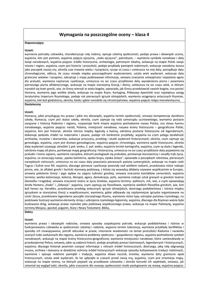 Wymagania na poszczególne oceny – klasa 4 Dopuszczający Uczeń: wymienia potrzeby człowieka, charakteryzuje rolę rodziny, opisuje szkolną społeczność, podaje prawa i obowiązki ucznia, wyjaśnia, kim jest patriota, wyjaśnia pojęcia ojczyzna, „mała ojczyzna”, patriotyzm, – wymienia symbole narodowe i daty świąt narodowych, wyjaśnia pojęcia: źródło historyczne, archeologia, patriotyzm lokalny, wskazuje na mapie Polski swoje miasto i region, wyjaśnia, czym jest historia i przeszłość, podaje przykłady pamiątek rodzinnych, wskazuje narodziny Jezusa jako początek naszej ery, określa czas trwania wieku i tysiąclecia, rysuje oś czasu i umieszcza na niej daty, porządkuje daty chronologicznie, oblicza, ile czasu minęło między poszczególnymi wydarzeniami, ustala wiek wydarzeń, wskazuje daty graniczne wieków i tysiącleci, odczytuje z mapy podstawowe informacje, omawia znaczenie umiejętności rozpalania ognia dla praludzi, wymienia najstarsze cywilizacje, umieszcza na osi czasu przybliżone daty wynalezienia pisma i powstania pierwszego pisma alfabetycznego, wskazuje na mapie starożytną Grecję i Ateny, umieszcza na osi czasu wiek, w którym narodził się teatr grecki, wie, że Grecy wierzyli w wielu bogów, opowiada, jak Grecy przedstawiali swoich bogów, zna postać Homera, wymienia jego wielkie dzieła, wskazuje na mapie Rzym, Kartaginę, Półwysep Apeniński oraz największy zasięg terytorialny Imperium Rzymskiego, podaje rok pierwszych igrzysk olimpijskich, wymienia osiągnięcia antycznych Rzymian, wyjaśnia, kim byli gladiatorzy, określa, kiedy i gdzie narodziło się chrześcijaństwo, wyjaśnia pojęcie religia monoteistyczna, Dostateczny Uczeń: tłumaczy, jakie przysługują mu prawa i jakie ma obowiązki, wyjaśnia termin społeczność, omawia kompetencje dyrektora szkoły, tłumaczy, czym jest statut szkoły, określa, czym zajmuje się rada samorządu uczniowskiego, wymienia postacie związane z historią Radomia i regionu, rozpoznaje herb miasta wyjaśnia pochodzenie nazwy Polska, zna słowa hymnu narodowego, wyjaśnia pojęcia: naród, Polonia, mniejszość narodowa, nazywa krainy historyczno – geograficzne Polski, wyjaśnia, kim jest historyk, określa różnice między legendą a baśnią, odróżnia postacie historyczne od legendarnych, dokonuje podziału źródeł na materialne i pisane, podaje ich konkretne przykłady, wyjaśnia na czym polega działalność archiwów, muzeów i skansenów, wskazuje przyczyny, przebieg i skutki wydarzeń historycznych, określa, czym zajmuje się genealogia, wyjaśnia, czym jest drzewo genealogiczne, wyjaśnia pojęcie: chronologia, wymienia epoki historyczne, określa datę wydarzeń używając określeń 1.poł. wieku, 2. poł. wieku, wyjaśnia termin kartografia, wyjaśnia, czym są skala i legenda, odróżnia mapę od planu, porównuje mapę geograficzną i historyczną, umieszcza na osi czasu przybliżone daty pojawienia się praludzi i homo sapiens, wymienia narzędzia, którymi posługiwali się praludzie, porównuje koczowniczy i osiadły tryb życia, wyjaśnia, co oznaczają nazwy „epoka kamienna, epoka brązu, epoka żelaza”, opowiada o początkach rolnictwa, pierwszych narzędziach rolniczych, umieszcza na osi czasu daty powstania pierwszych państw sumeryjskich, wskazuje na mapie rzeki Tygrys i Eufrat oraz Nil, wyjaśnia, dlaczego pierwsze cywilizacje powstały nad wielkimi rzekami, przedstawia różne rodzaje pisma, wie, że alfabet grecki i łaciński stanowią podstawę, z której się wywodzą alfabety używane współcześnie w Europie, omawia położenie Grecji i jego wpływ na zajęcia ludności greckiej, omawia znaczenie kontaktów zamorskich, wyjaśnia terminy: wielka kolonizacja, kolonia, Akropol, agora, demokracja, polis, wymienia rodzaje sztuk granych w greckim teatrze (komedia i tragedia), omawia znaczenie teatru w życiu Greków, wyjaśnia terminy: politeizm, mit, wie, o czym opowiadają dzieła Homera „Iliada” i „Odyseja”, wyjaśnia, czym zajmują się filozofowie, wymienia wielkich filozofów greckich, wie, kim byli herosi np. Herakles, przedstawia przebieg antycznych igrzysk olimpijskich, dostrzega podobieństwa i różnice między igrzyskami w starożytnej Grecji a współczesnymi, wymienia, gdzie odbywały się najsłynniejsze igrzyska organizowane na cześć Zeusa, przedstawia legendarne początki starożytnego Rzymu, wymienia różne typy ustrojów państwa rzymskiego, na podstawie ilustracji wymienia elementy stroju i uzbrojenia rzymskiego legionisty, wyjaśnia, dlaczego dla Rzymian ważne było budowanie dróg, wskazuje prawo rzymskie jako podstawę współczesnego prawa, wskazuje na mapie Palestynę, wyjaśnia terminy Mesjasz, apostoł, poganin, Stary i Nowy Testament, Biblia, Dobry Uczeń: wymienia prawa i obowiązki rodziców, omawia sposoby zaspokajania potrzeb, wskazuje podobieństwa i różnice w funkcjonowaniu człowieka w społeczności szkolnej i rodzinie, wyjaśnia termin tolerancja, wymienia przykłady konfliktów i sposoby ich rozwiązywania, potrafi odszukać w prasie, internecie wiadomości na temat przeszłości Radomia i nazwiska znanych ludzi zasłużonych dla regionu, wymienia problemy społeczno – gospodarcze regionu, wyjaśnia pochodzenie symboli narodowych, wskazuje na mapie krainy historyczno-geograficzne, wymienia mniejszości narodowe, które zamieszkiwały w przedwojennej Polsce, omawia, jakie są zadania historii, podaje przykłady postaci baśniowych, legendarnych i historycznych, wyjaśnia, dlaczego historyk powinien czerpać informacje z różnych źródeł historycznych, dostrzega, jaką rolę odgrywają muzea, archiwa i skanseny w dziedzinie ochrony źródeł historycznych wskazuje sposoby kultywowania tradycji rodzinnych, wymienia i opisuje rodzinne pamiątki i tradycje, wyjaśnia słowa rocznik, kronika, wymienia daty graniczne epok historycznych, ustala wiek wydarzeń, ile lat upłynęło w czasach przed naszą 