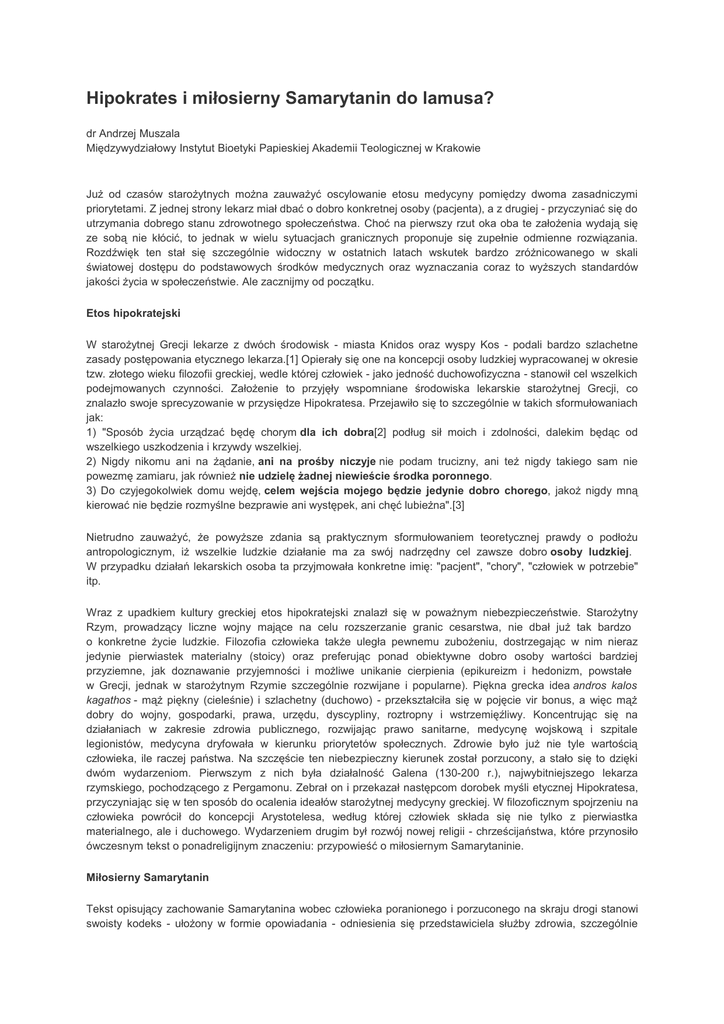 przysięga starożytnego lekarza z Kos, jak i przypowieść o miłosiernym Samarytaninie wykształciły swoisty etos