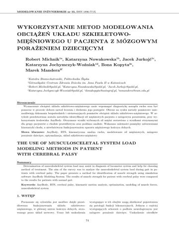 MODELOWANIE INŻYNIERSKIE nr 55, ISSN 1896-771X WYKORZYSTANIE METOD MODELOWANIA OBCIĄŻEŃ UKŁADU SZKIELETOWOMIĘŚNIOWEGO U PACJENTA Z MÓZGOWYM PORAŻENIEM DZIECIĘCYM Robert Michnik1a, Katarzyna Nowakowska1b, Jacek Jurkojć1c, Katarzyna Jochymczyk-Woźniak1d, Ilona Kopyta2e, Marek Mandera2f Katedra Biomechatroniki, Politechnika Śląska Górnośląskie Centrum Zdrowia Dziecka im. Jana Pawła II w Katowicach a [email protected], [email protected], [email protected], d [email protected], [email protected], [email protected] 1 2 Streszczenie Wyznaczenie obciążeń układu szkieletowo-mięśniowego może wspomagać diagnostykę narządu ruchu oraz być pomocne w procesie doboru metod leczenia i śledzenia jego postępów. Obecne na rynku metody pomiarowe uniemożliwiają dokonania bezpośrednich i nieinwazyjnych pomiarów obciążeń układu szkieletowo-mięśniowego. W artykule przedstawiona została metodyka identyfikacji sił mięśniowych pacjenta z mózgowym porażeniem, przy wykorzystaniu środowiska AnyBody. Otrzymane wyniki wybranych sił mięśni zestawiono z wynikami otrzymanymi dla grupy pacjentów o chodzie prawidłowym oraz poddano analizie. Wskazano zależności pomiędzy zaburzeniami kinematyki chodu, a niewłaściwym funkcjonowaniem aparatu mięśniowego kończyn dolnych. Słowa kluczowe: AnyBody, BTS, kinematyczna analiza ruchu, modelowanie sił mięśniowych, mózgowe porażenie dziecięce, optymalizacja, układ szkieletowo-mięśniowy THE USE OF MUSCULOSCELETAL SYSTEM LOAD MODELING METHODS IN PATIENT WITH CEREBRAL PALSY Summary Determination of musculoskeletal system load may assist in diagnosis of locomotor system and help for choosing method of treatment. The aim of the survey was to analyze the musculoskeletal system load during gait in patients with cerebral palsy. The paper presents a method for identification of muscle strength using simulation software AnyBody Modeling System. The results of muscle strength for patient with cerebral palsy were compared to the results for patients with normal gait. Keywords: AnyBody, BTS, cerebral palsy, kinematic motion analysis, optimization, modeling of muscle forces, musculoskeletal system 1. WSTĘP Poruszanie się człowieka jest możliwe dzięki prawidłowemu funkcjonowaniu układu szkieletowomięśniowego, w głównej mierze kończyn dolnych, sterowanego przez układ nerwowy. Urazy lub uszkodzenia występujące w ich obrębie mogą skutkować pojawieniem się patologii funkcji lokomocyjnych. Jednym z częściej występujących schorzeń o podłożu neurologicznym jest mózgowe porażenie dziecięce. Uszkodzenie ośrodków 74 Robert Michnik, Katarzyna Nowakowska, Jacek Jurkojć, Katarzyna Jochymczyk-Woźniak, Jochymczyk Woźniak, Ilona Kopyta, Marek Mandera kontroli ponadrdzeniowej, zlokalizowanych w pniu mózgu, sprawiają, awiają, że chód dzieci z mózgowym porażeporaż niem znacznie odbiega od prawidłowego go wzorca. Dzieci z MPD nie są zdolne prawidłowo i w wystarczającym stopniu kontrolować swojej motoryki. Mają osłabioną równowagę, zaburzenia sensomotoryczne ryczne i zaburzone napięcie mięśniowe. ęśniowe. Na rozwój nieprawidłowego wzorca ruchowego pacjentów z MPD wpływa także brak bra synergii mięśniowej między agonistami i antagonistami. Chorym często towarzyszą przykurcze mięśni powodujące podwichnięcia stawów [2]. Prawidłowa diagnostyka mózgowego porażenia, p ocena stopnia nasilenia zaburzenia oraz dobór i monitorowanie postępów leczenia lub rehabilitacji są dużym wyzwaniem stawianym lekarzom oraz biomechanikom. om. Niestety, Niestety przy wykorzystaniu dostępnych, doświadczalnych metod badawczych stosowanych w biomechanice nie można wykonać bezpośrednich i nieinwazyjnych pomiarów obciążeń układu szkieletowo-mięśniowego mięśniowego. Jednak dość szybki zybki rozwój biomechaniki w ostatnich latach przyczyprzycz nił się do połączenia badań modelowych elowych i metod optymalizacyjnych, co pozwoliło na opracowanie metodyki wyznaczenia sił mięśniowych oraz reakcji na podstawie modeli matematycznych ruchu [5,6,7,8 ,8]. Ponadto na rynku pojawiło się kilka systemów oprogramowania przeznaczonych do tworzenia modeli eli oraz analizy obciążeń układu szkieletowo-mięśniowego mięśniowego człowieka. PrzykłaPrzykł dem takiego systemu mu jest środowisko AnyBody, Any które powstało w Aalborg University. ity. Umożliwia ono wykonanie analizy kinematycznej ruchów człowieka oraz identyident fikację działania poszczególnych mięśni mięśn szkieletowych [1,9]. Uzyskane wyniki,, poparte innymi parametrami para chodu (kinematycznymi, czasowo-przestrzennymi) przestrzennymi) oraz wiedzą i doświadczeniem lekarza mogą przyczynić się do uzyskania odpowiedzi na pytanie, które mięśnie pacjenta pracująą w sposób nieprawidłowy. Jest to niezwykle ważne w analizowaniu funkcji lokomocyjnych lokomo dzieci z mózgowym porażeniem. Największym problemem związanym z wyznaczaniem obciążeń układu szkieletowoszkieletowo mięśniowego, przy wykorzystaniu modelu matematyczmatematyc nego zaimplementowanego w systemie AnyBody, Any jest weryfikacja uzyskiwanych wyników. Jest to związane z faktem, iż obecnie nie jesteśmy w stanie dokonać bezpośredniego i nieinwazyjnego pomiaru sił działających na układ szkieletowo-mięśniowy. mięśniowy. Model może być zweryz fikowany w sposób jakościowy poprzez porównanie otrzymanych wyników z pomiarami sygnałów EMG. EMG Wykorzystanie elektromiografii umożliwia uzyskanie informacji, w jakim czasie dana grupa mięśni jest aktywakty na oraz pozwala względnie określić intensywność aktyakt wacji. Niestety, pomiary EMG z wykorzystaniem elekele trod powierzchniowych pozwalają na rejestrację sygnału tylko z największych grup mięśniowych znajdujących się pod powierzchnią skóry [11,12,13,15]. W niniejszej pracy przedstawiono możliwości wykowyk rzystania oprogramowania Anybody ody do badania
