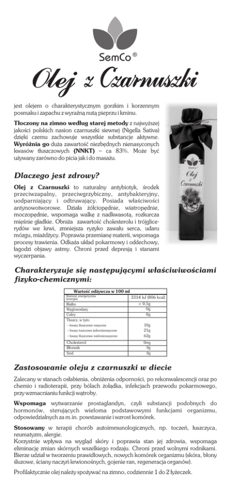 SemCo ® jest olejem o charakterystycznym gorzkim i korzennym posmaku i zapachu z wyraŸn¹ nut¹ pieprzu i kminu. T³oczony na zimno wed³ug starej metody z najwy¿szej jakoœci polskich nasion czarnuszki siewnej (Nigella Sativa) dziêki czemu zachowuje wszystkie substancje aktywne. Wyró¿nia go du¿a zawartoœæ niezbêdnych nienasyconych kwasów t³uszczowych (NNKT) – ca 83%. Mo¿e byæ u¿ywany zarówno do picia jak i do masa¿u. Dlaczego jest zdrowy? Olej z Czarnuszki to naturalny antybiotyk, œrodek przeciwzapalny, przeciwgrzybiczny, antybakteryjny, uodparniaj¹cy i odtruwaj¹cy. Posiada w³aœciwoœci antynowotworowe. Dzia³a ¿ó³ciopêdnie, wiatropêdnie, moczopêdnie, wspomaga walkê z nadkwasot¹, rozkurcza miêœnie g³adkie. Obni¿a zawartoœæ cholesterolu i trójglicerydów we krwi, zmniejsza ryzyko zawa³u serca, udaru mózgu, mia¿d¿ycy. Poprawia przemianê materii, wspomaga procesy trawienia. Odka¿a uk³ad pokarmowy i oddechowy, ³agodzi objawy astmy. Chroni przed depresj¹ i stanami wyczerpania. Charakteryzuje siê nastêpuj¹cymi w³aœciwiwoœciami fizyko-chemicznymi: Wartoœæ od¿ywcza w 100 ml Wartoœæ energetyczna (energia) Bia³ko Wêglowodany Cukry T³uszcz, w tym: 3314 kJ (806 kcal) < 0,5g 0g 0g – kwasy t³uszczowe wielonienasycone 10g 21g 62g Cholesterol B³onnik Sód 0mg 0g 0g – kwasy t³uszczowe nasycone – kwasy tuszczowe jednonienasycone Zastosowanie oleju z czarnuszki w diecie Zalecany w stanach os³abienia, obni¿enia odpornoœci, po rekonwalescencji oraz po chemio i radioterapii, przy bólach ¿o³¹dka, infekcjach przewodu pokarmowego, przy wzmacnianiu funkcji w¹troby. Wspomaga wytwarzanie prostaglandyn, czyli substancji podobnych do hormonów, steruj¹cych wieloma podstawowymi funkcjami organizmu, odpowiedzialnych za m.in. powstawanie i wzrost komórek. Stosowany w terapii chorób autoimmunologicznych, np. toczeñ, ³uszczyca, reumatyzm, alergie. Korzystnie wp³ywa na wygl¹d skóry i poprawia stan jej zdrowia, wspomaga eliminacjê zmian skórnych wszelkiego rodzaju. Chroni przed wolnymi rodnikami. Bierze udzia³ w tworzeniu prawid³owych, nowych komórek organizmu (skóra, b³ony œluzowe, œciany naczyñ krwionoœnych, gojenie ran, regeneracja organów). Profilaktycznie olej nale¿y spo¿ywaæ na zimno, codziennie 1 do 2 ³y¿eczek. Zastosowanie oleju z czarnuszki w kosmetyce Stosowany zewnêtrznie wspomaga leczenie ³uszczycy, tr¹dziku, atopowego zapalenia skóry, wyprysków i egzemy. W naturalny sposób poprawia kondycjê skóry, przede wszystkim suchej i dojrza³ej. Zmiêkcza, wyg³adza skórê i uelastycznia j¹. Dziêki w³aœciwoœciom przeciwutleniaj¹cym, opóŸnia proces powstawania zmarszczek. £agodzi podra¿nienia, równie¿ te wywo³ane nadmiern¹ ekspozycj¹ na s³oñce. Stosowany na w³osy niweluje ³upie¿ oraz uporczywe swêdzenie skóry g³owy. Przeciwdzia³a ich wypadaniu. Wzmacnia przesuszone i zniszczone w³osy. Stosowany do smarowania i masa¿u, pomaga w zwalczaniu bólu i sztywnoœci miêœni. Zdrowie na co dzieñ Olej z czarnuszki jako omasta - t³uszcz dodawany do potraw. Polecany jako dodatek do pieczywa, kasz, ziemniaków, makaronów, surówek i sa³atek warzywnych, miês, ryb, serów i nabia³u, majonezów, dresingów, sosów Winegret itp... Nale¿y pamiêtaæ by olej dodawaæ do dañ przestudzonych, by nie straci³ swoich zdrowotnych w³aœciwoœci. Sa³atka z orzechami • 2 garœci rukoli • 2 garœci sa³aty lodowej • garœæ orzechów w³oskich • 3-4 pomidory koktajlowe • 2 ³y¿ki czarnych oliwek • 1ma³a czerwona cebula • olej z czarnuszki (ok. 3 ³y¿ki) Umyte sa³aty porwij na mniejsze kawa³ki i wsyp do miski. Pomidory koktajlowe pokrój w æwiartki, cebulê, oliwki pokrój w cienkie paski, dodaj do sa³at. Orzechy w³oskie lekko posiekaj i upra¿ na suchej patelni a¿ siê ³adnie zarumieni¹, ostudŸ i posyp nimi sa³atkê. Sa³atkê polej olejem z czarnuszki. Sa³atka jarzynowa • du¿e ziemniaki – 2 sztuki • du¿a marchewka - 2 sztuki • zielony groszek konserwowy – 150 gramów • ser edamski – 125 gramów • olej z czarnuszki – 6 ³y¿ek • sok z cytryny • natka pietruszki (posiekana) – 1 ³y¿ka • czarne oliwki – 50 gramów • sól, pieprz Ugotuj ziemniaki w lekko osolonej wodzie, nastêpnie pokrój w kostkê. Pokrój w kostkê marchewkê, ugotuj. Ugotowan¹ marchew przelej zimn¹ wod¹. Pokrój w kostkê ser. Do salaterki w³ó¿ ugotowane warzywa, ziemniaki oraz pokrojony w kostkê ser edamski, dodaj groszek, posyp sol¹, pieprzem, polej olejem z czarnuszki i cytryn¹. Podawaj sa³atkê posypan¹ pietruszk¹ i oliwkami. Dlaczego wybraæ olej z SemCo? ? SemCo to polska firma rodzinna z wieloletni¹ tradycj¹, wytwarzaj¹ca oleje t³oczone na zimno wed³ug tradycyjnych receptur. O wysokiej jakoœci olejów decyduje staranny dobór surowców, wytwarzanych we w³asnym specjalistycznym gospodarstwie i tradycyjna metoda t³oczenia na zimno. SemCo SGNiP Krystyna Jerzy Just Œmi³owo 16, 64-500 Szamotu³y tel./fax: +48 61 292 04 02 www.semco.pl; email:[email protected]